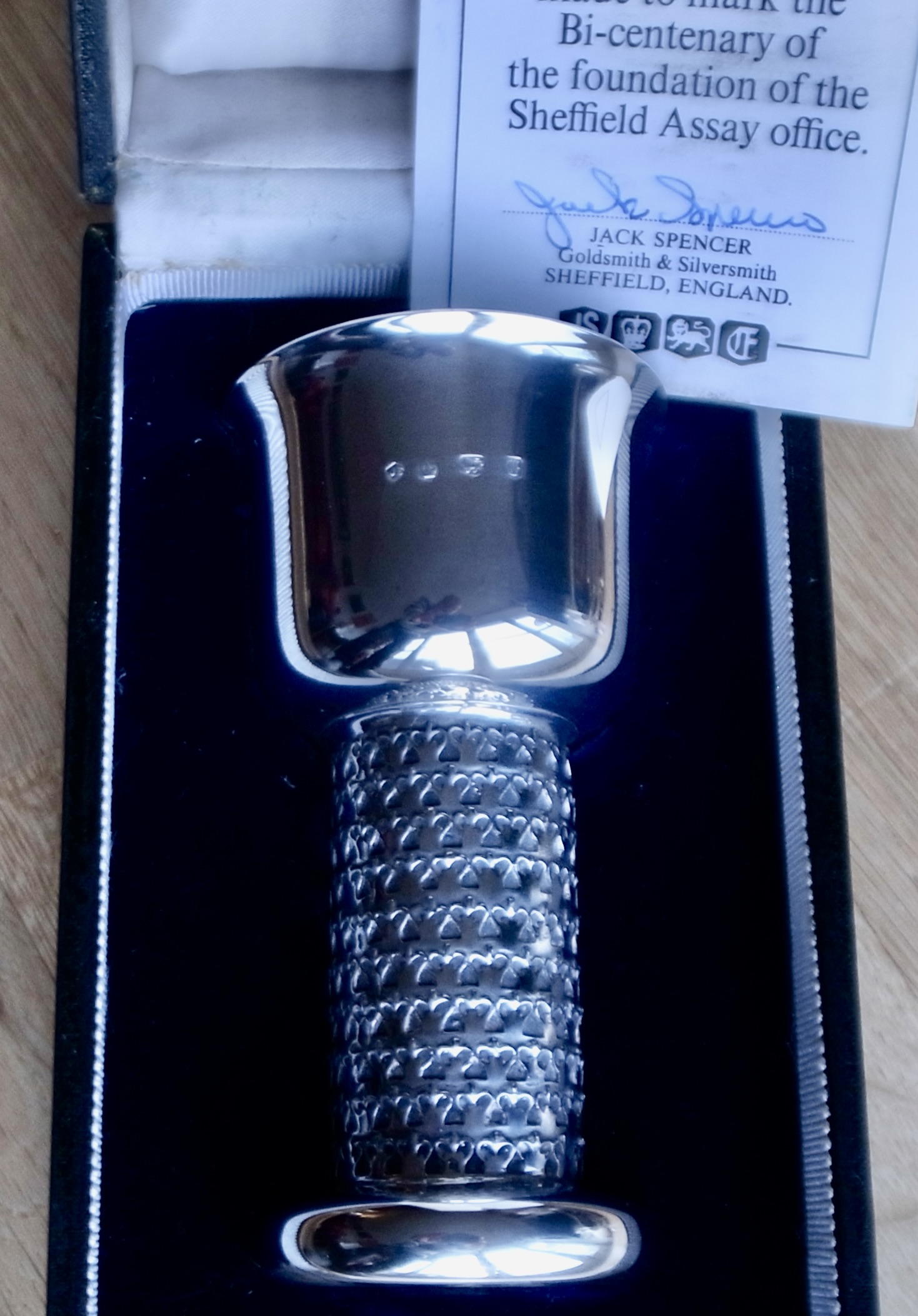 Jack Spencer, silver ‘Crown Goblet, Sheffield 1973, complete with fitted case and certificated as being No. 62 of a limited edition of 200, the goblet numbered likewise to the base. standing 15 cm tall and weighing 274 grams. The column composed of numerous Crown motifs, the Assay mark for the Sheffield Office at that time.. This was made to commemorate the Sheffield Assay Offices 200th anniversary of its founding, for the year of 1973 they used the same font of date letter that was used in their very first year of 1773. (NFS, personal collection)