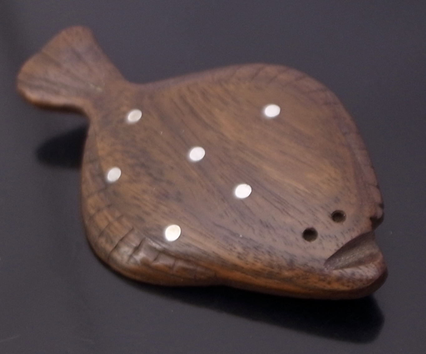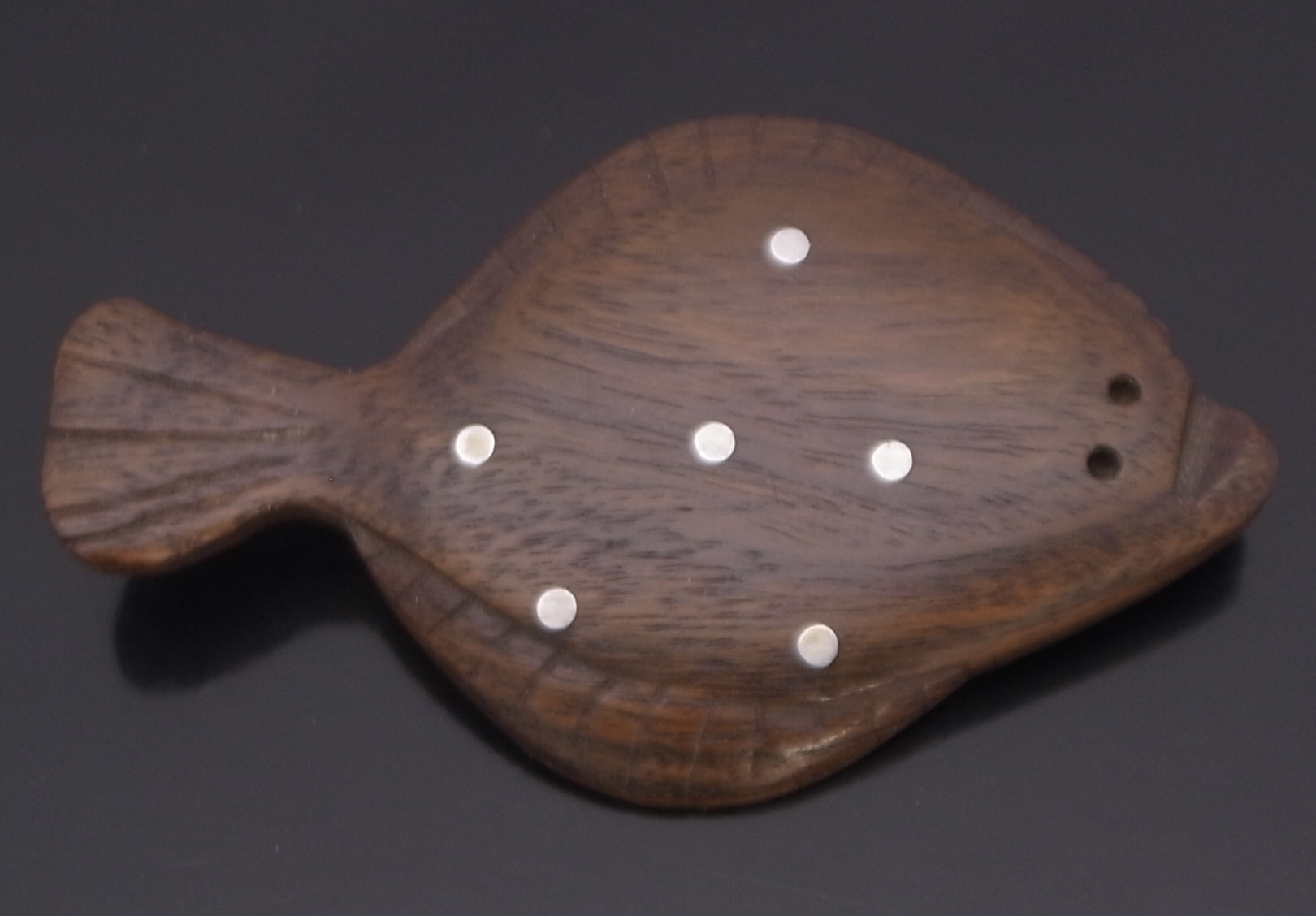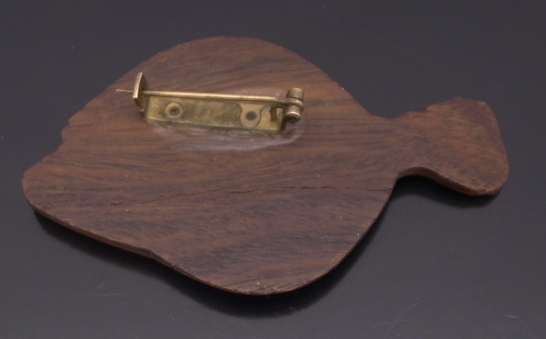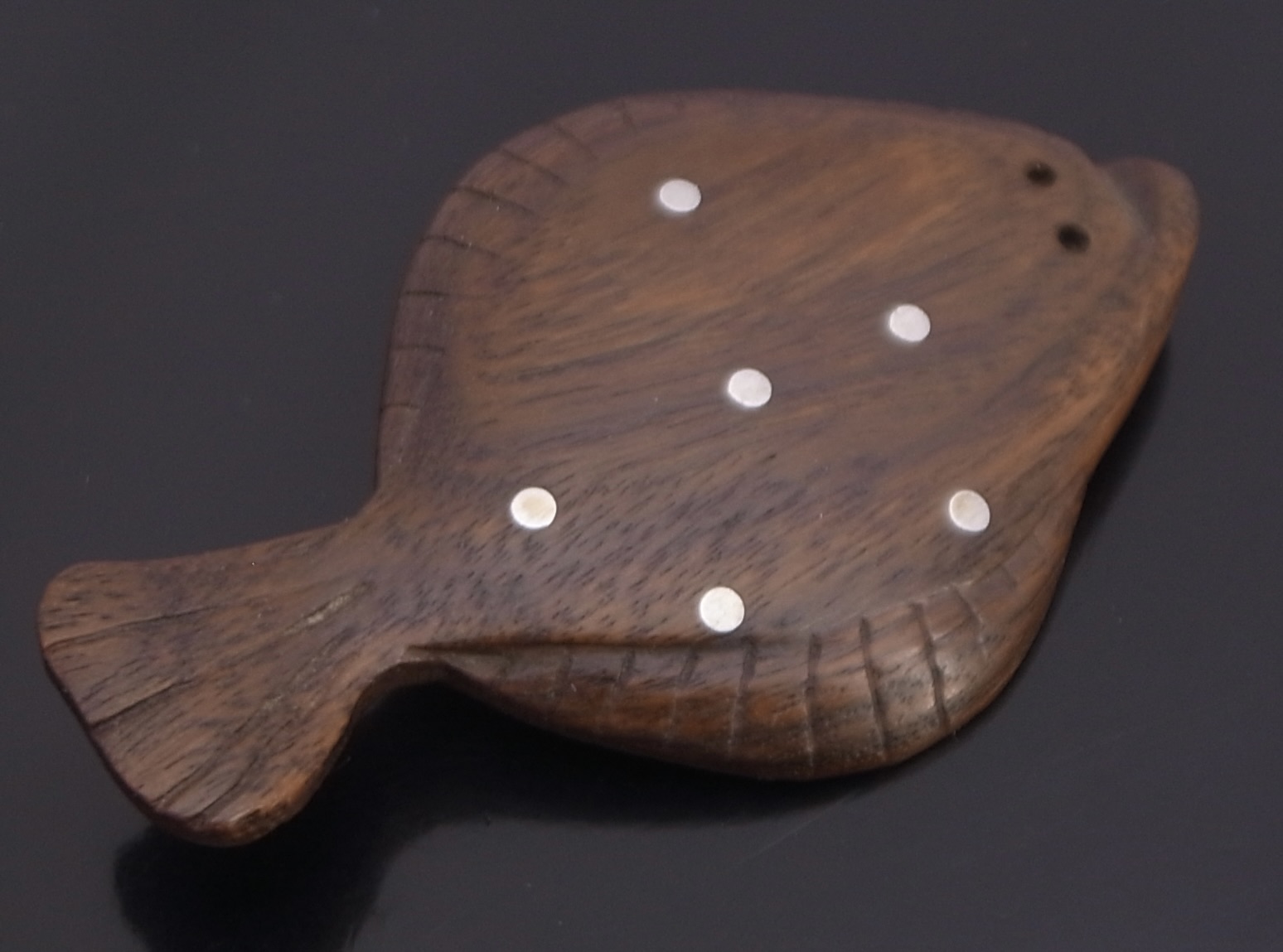 Anonymous, a rosewood and metal dot inlaid plaice brooch, Denmark, circa 1960, unmarked, approximately 6.6 cm at long and 4 cm wide (Ref S+2536)