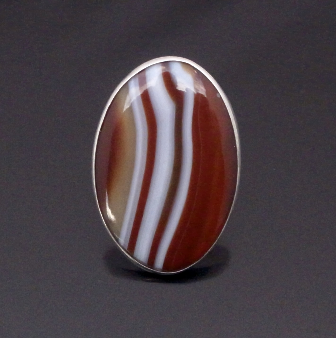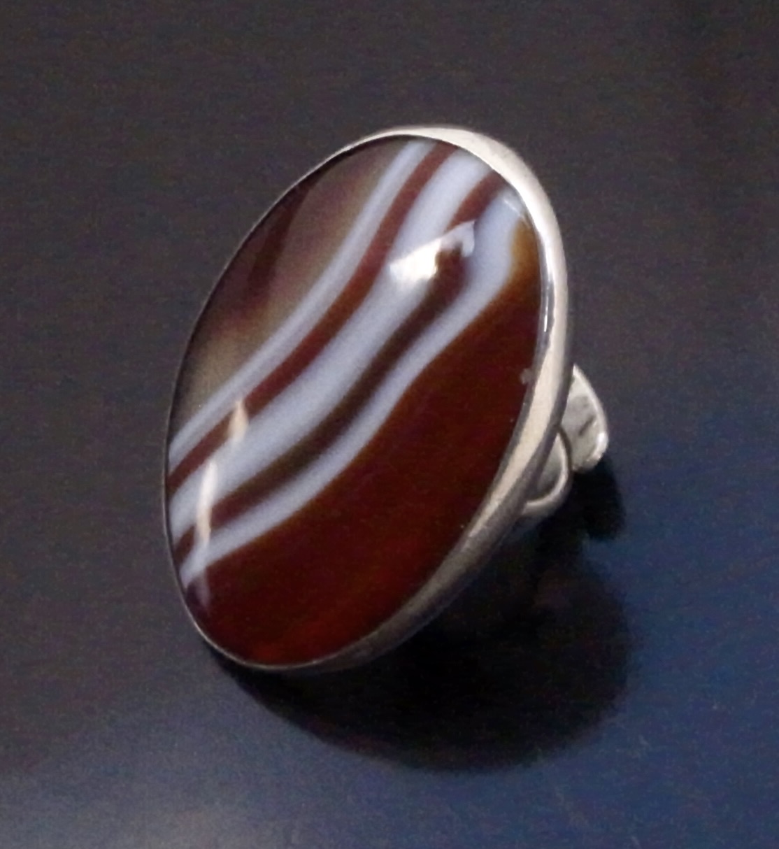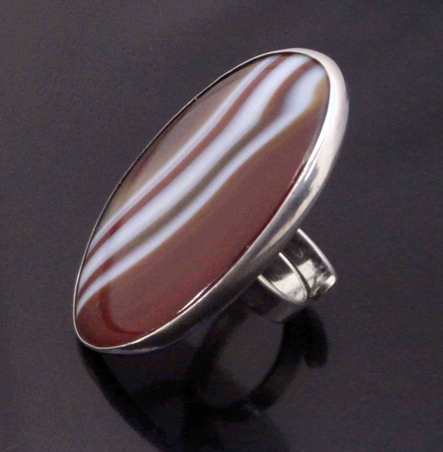 Bent Knudsen, a large agate set silver ring, Denmark, circa 1970, stamped ‘Bent K‘ for Bent Knudsen, ‘Denmark‘, and ‘Sterling’ and numbered ‘204’, the oval agate approximately 4.5 cm by 3 cm, to a split adjustable (Ref S+2375)