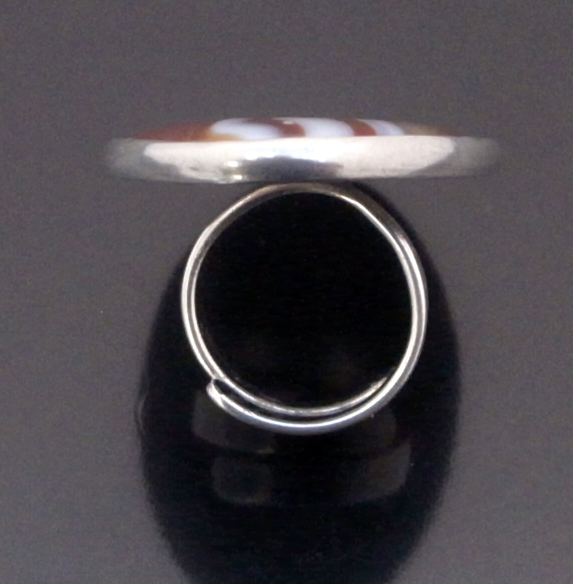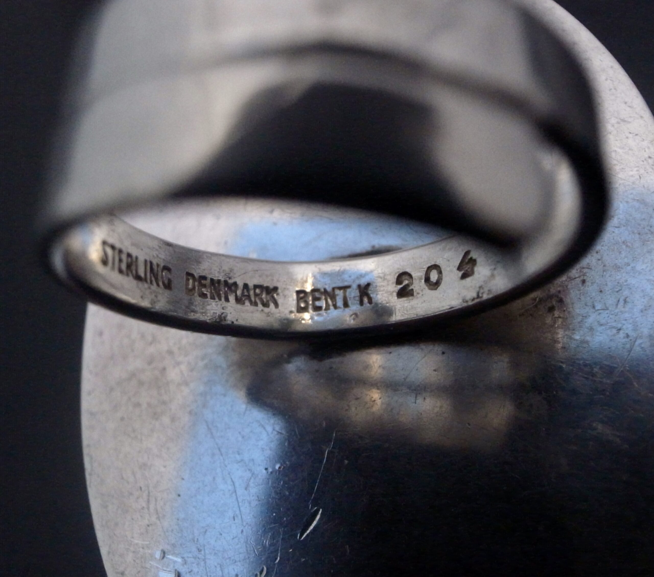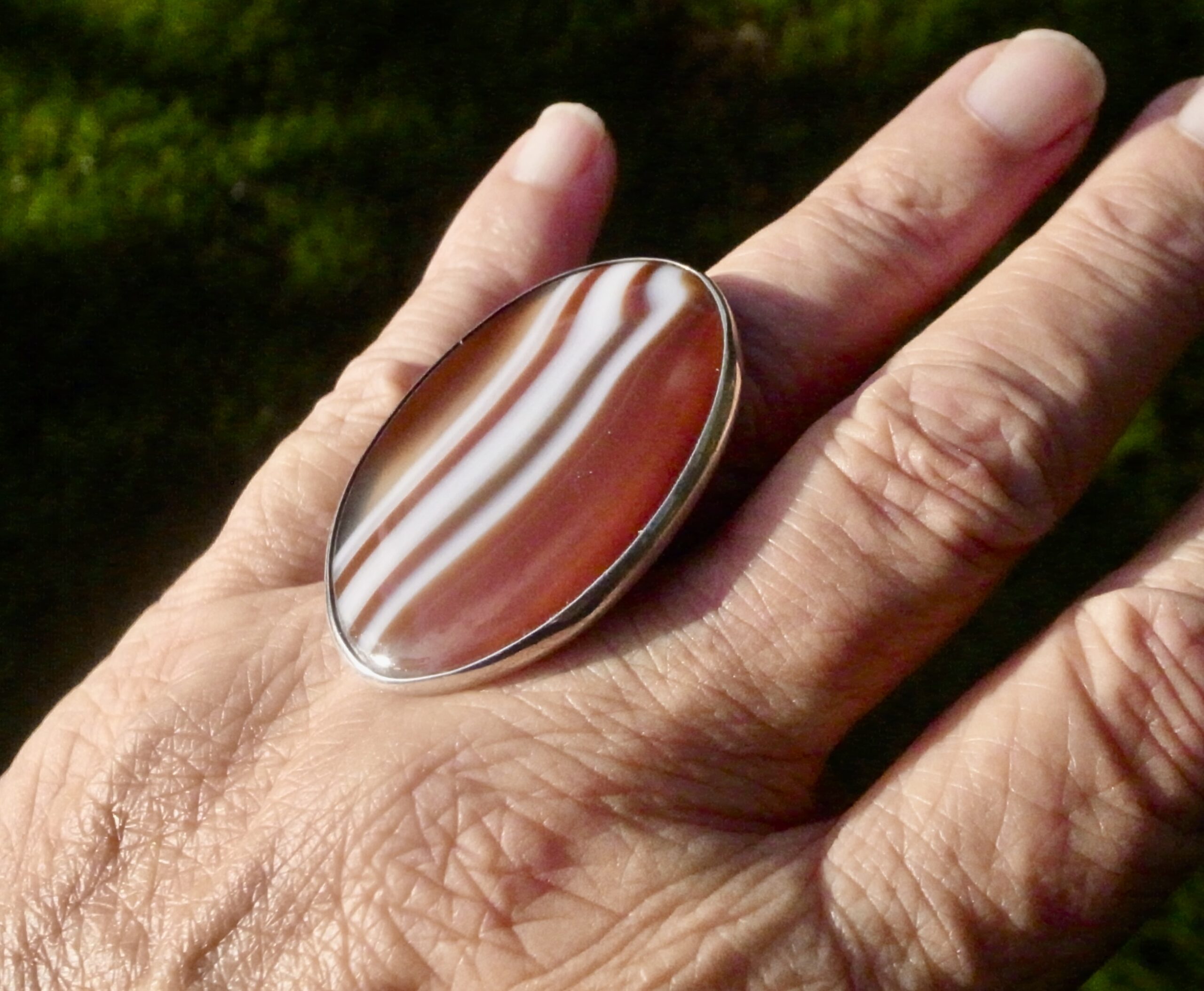 Bent Knudsen, a large agate set silver ring, Denmark, circa 1970, stamped ‘Bent K‘ for Bent Knudsen, ‘Denmark‘, and ‘Sterling’ and numbered ‘204’, the oval agate approximately 4.5 cm by 3 cm, to a split adjustable (Ref S+2375)