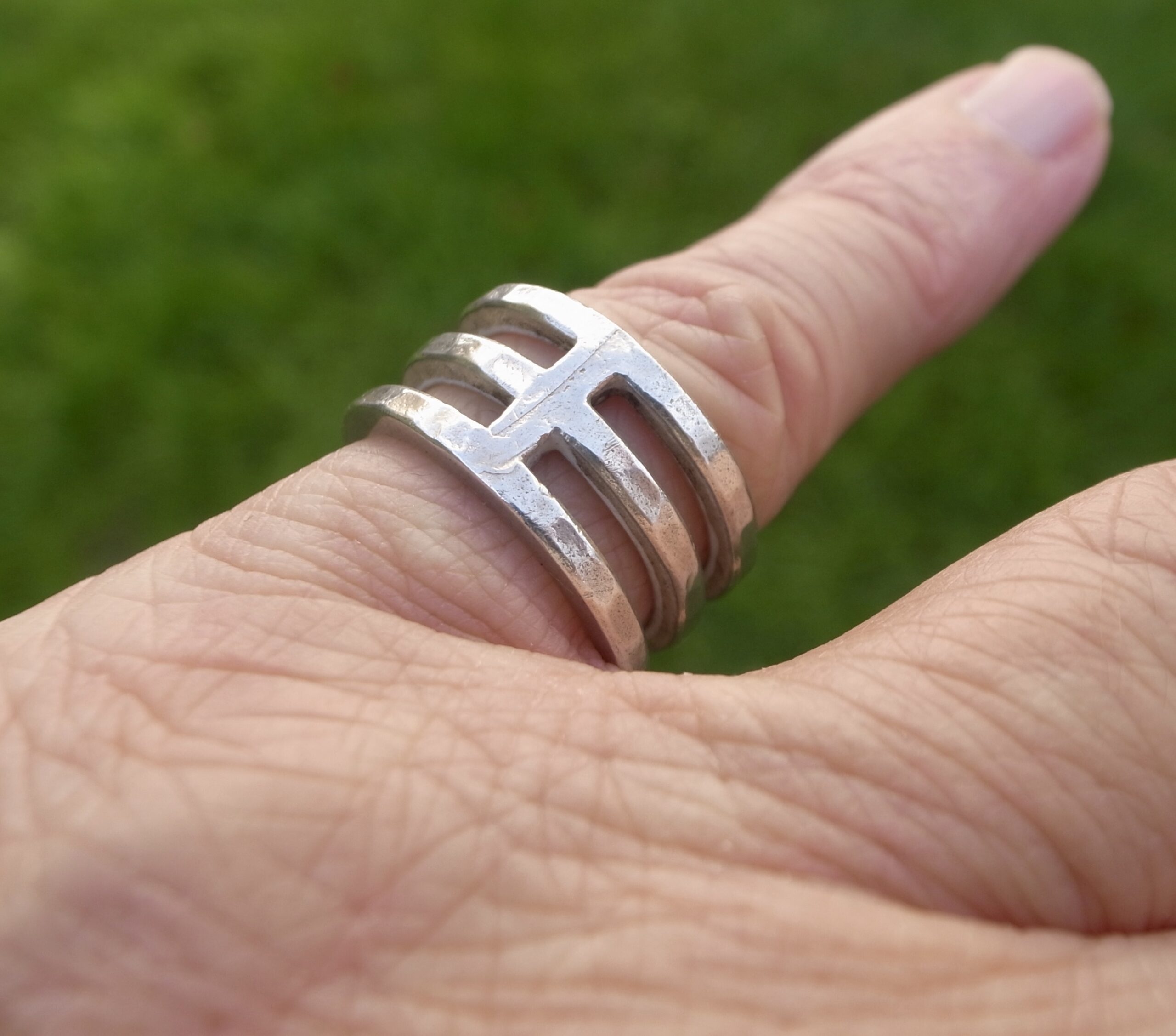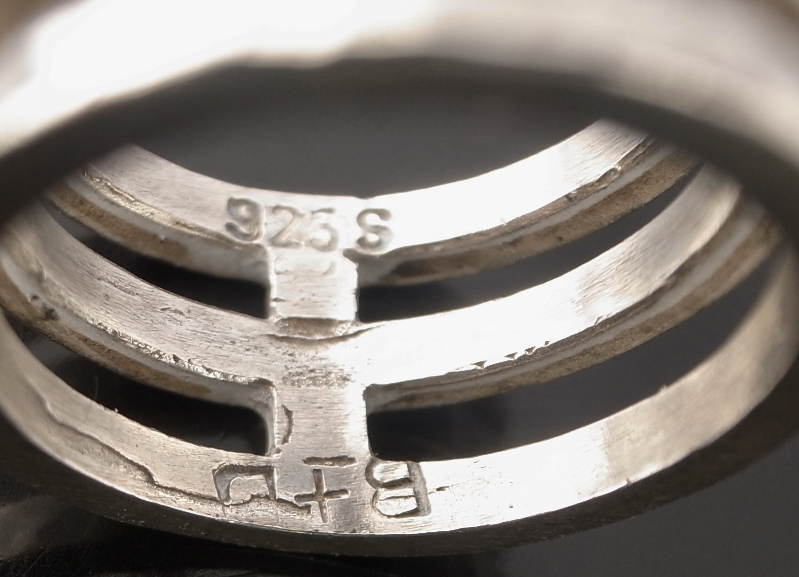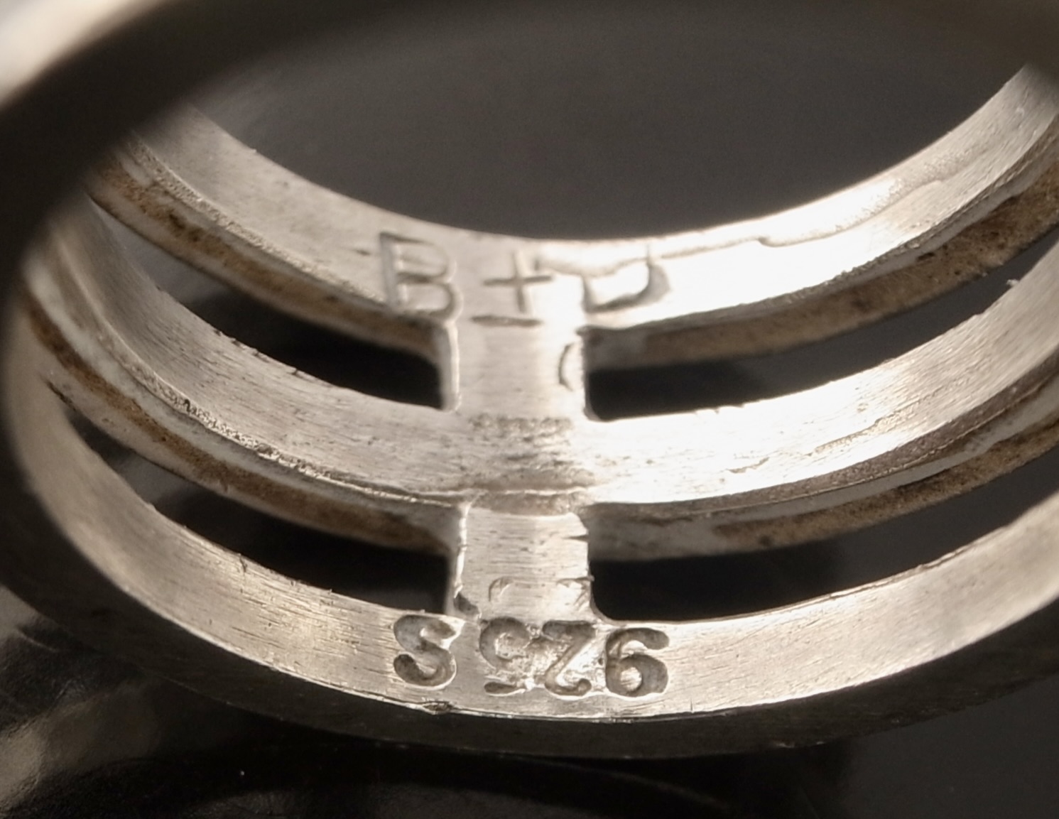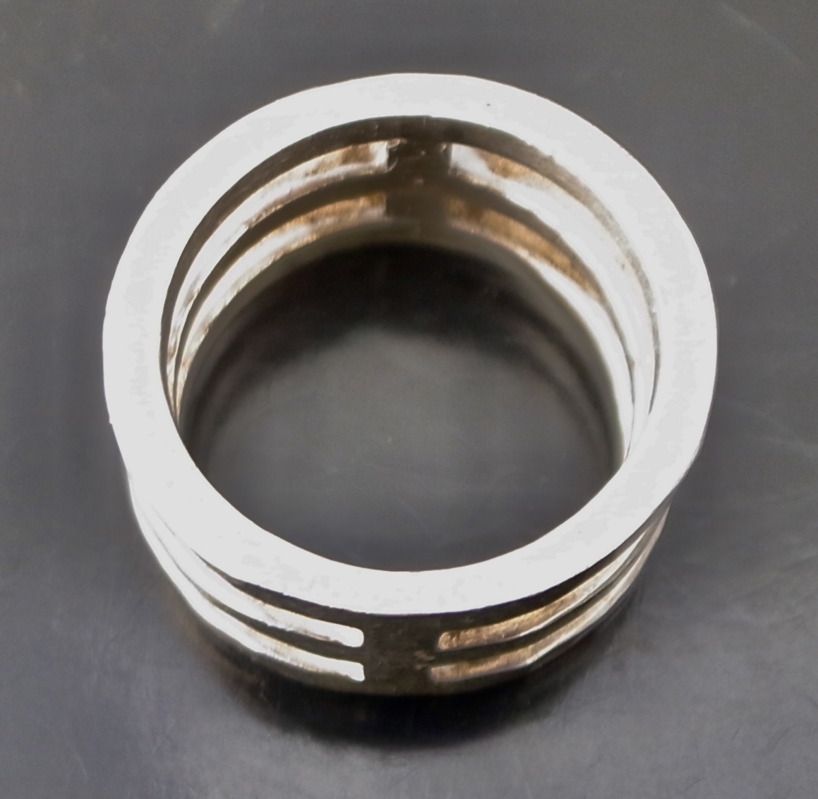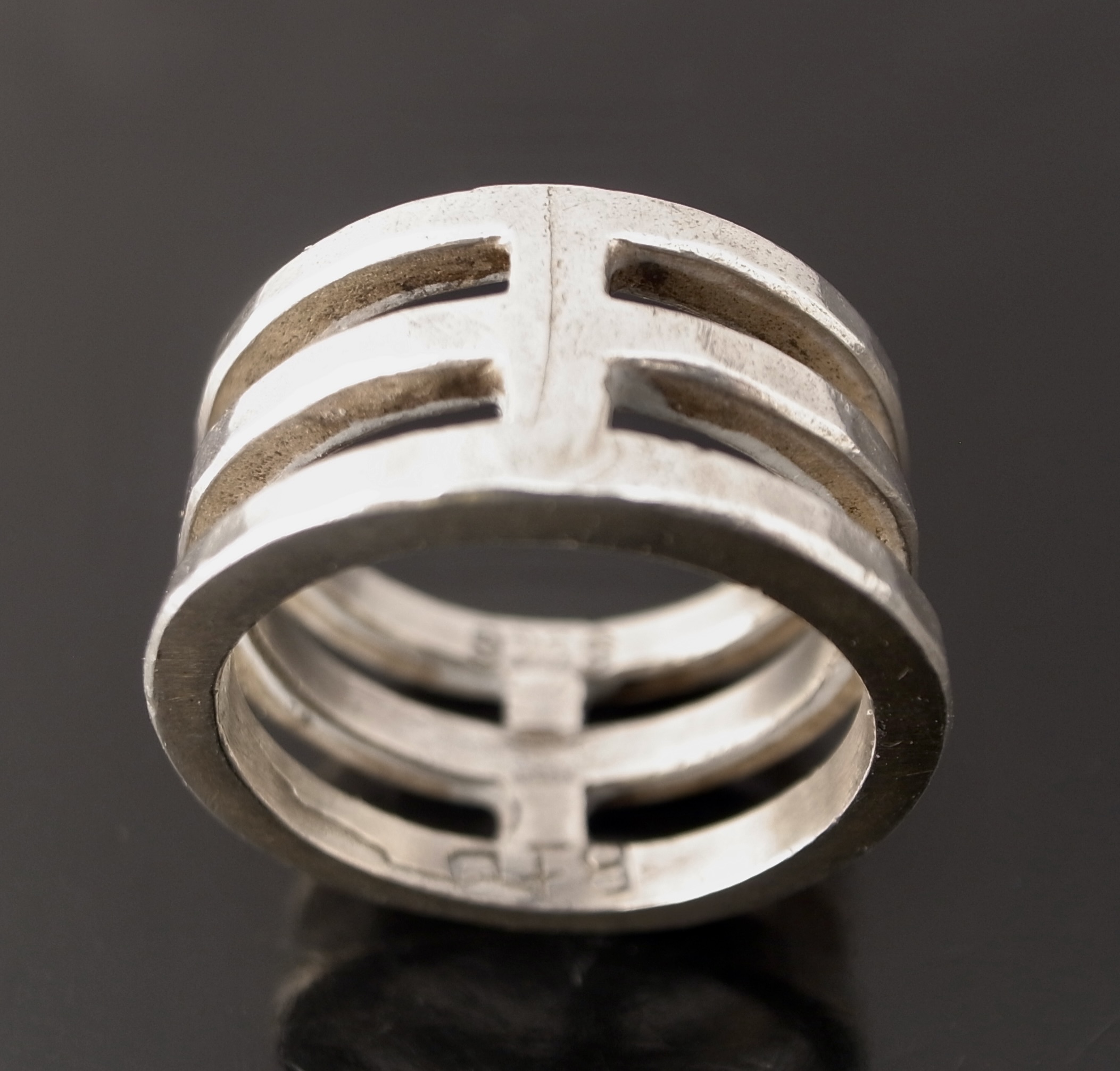 Buch and Deichmann, a modernist silver ring, Denmark, circa 1975, stamped ‘B+D‘ for Buch and Deichmann and ‘925S’, with a hammered finish, 11 cm wide, finger size O leading edge (Ref S+2462)