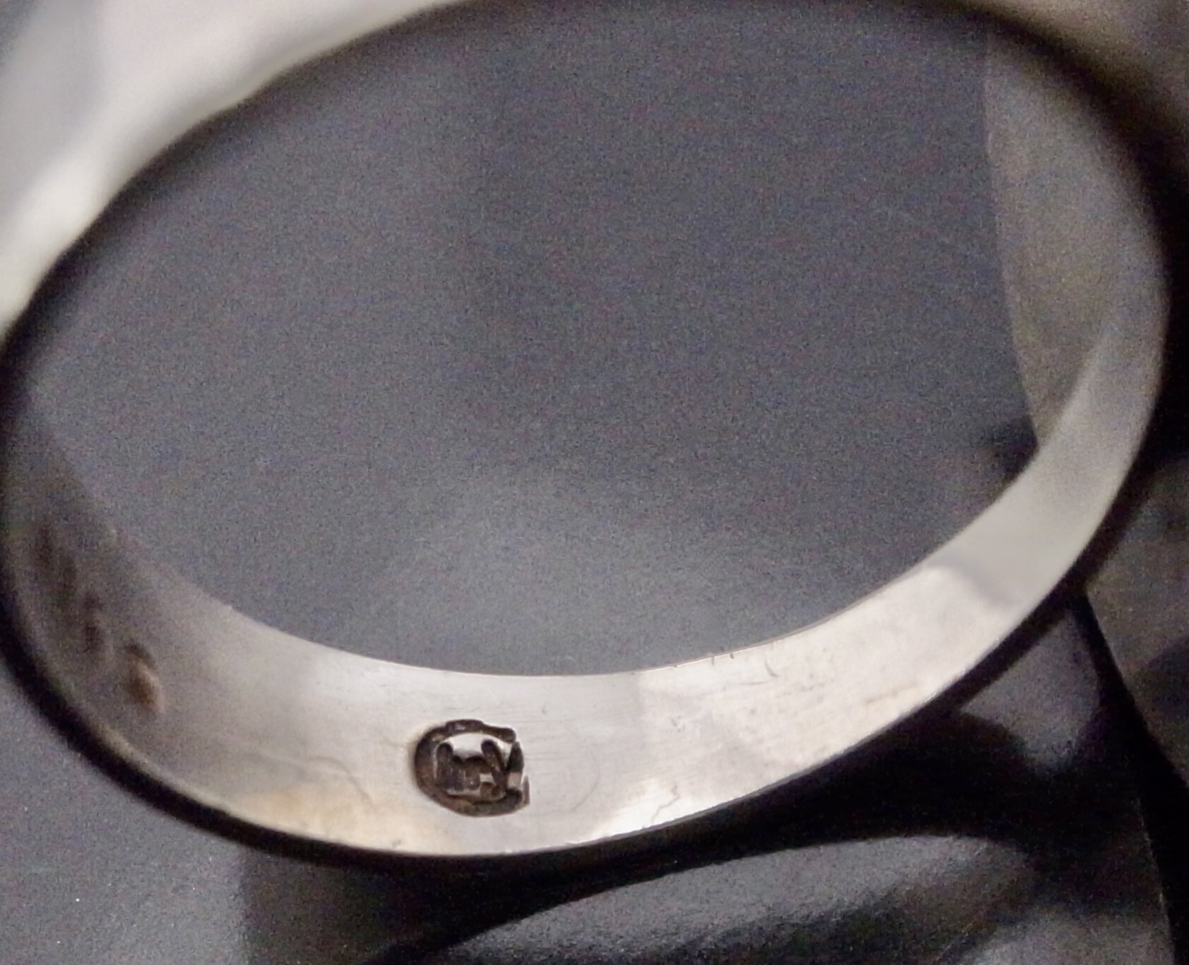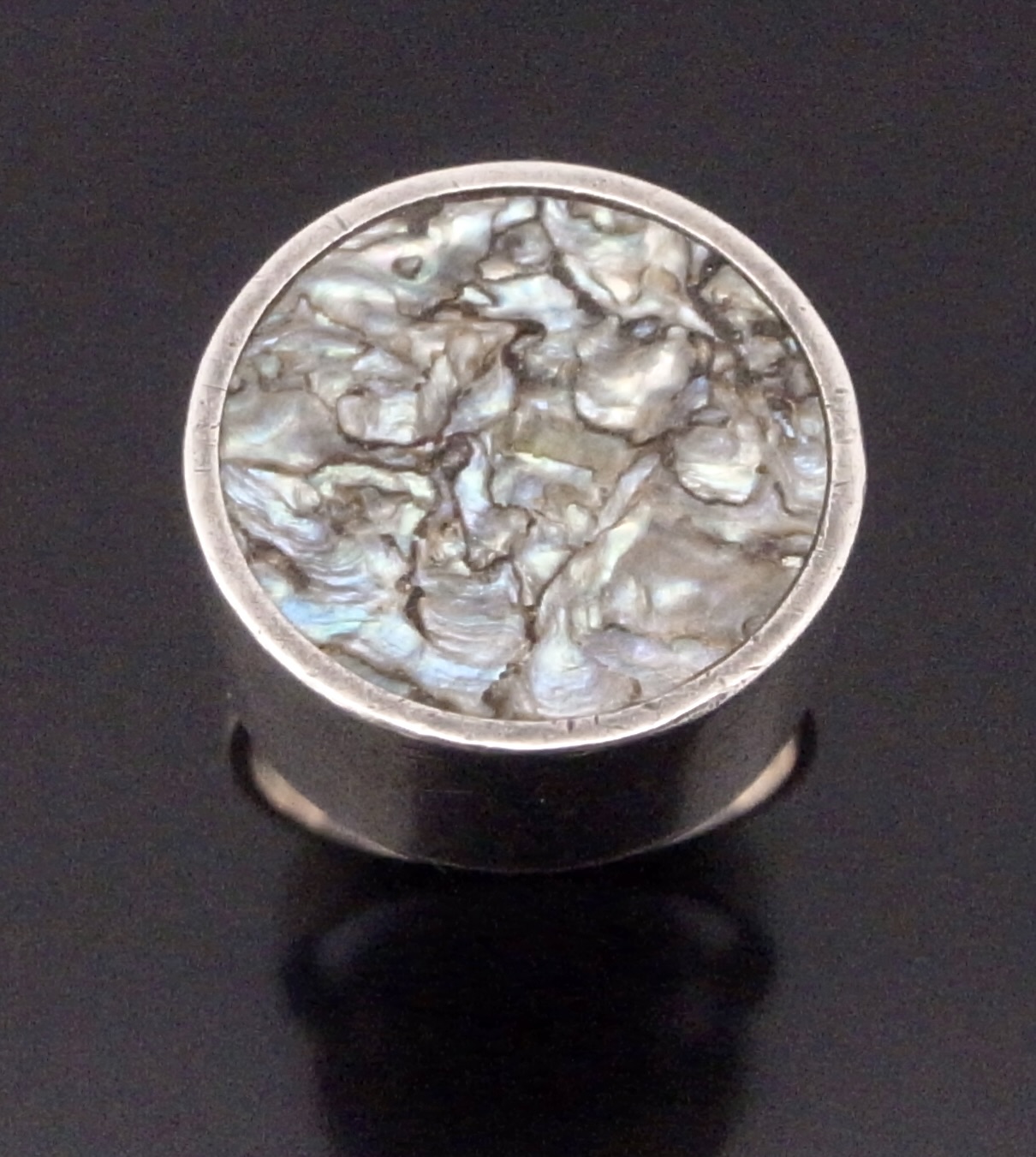 Christian Vielslov, an abalone shell set silver ring, Denmark, circa 1970, stamped with Christian Vielslov monogram and ‘925S’, the circular head measuring 1.8 cm in diameter overall and finger size N, inner diameter of shank 17.1 mm, all measurements are approximate (Ref S+2227) SOLD