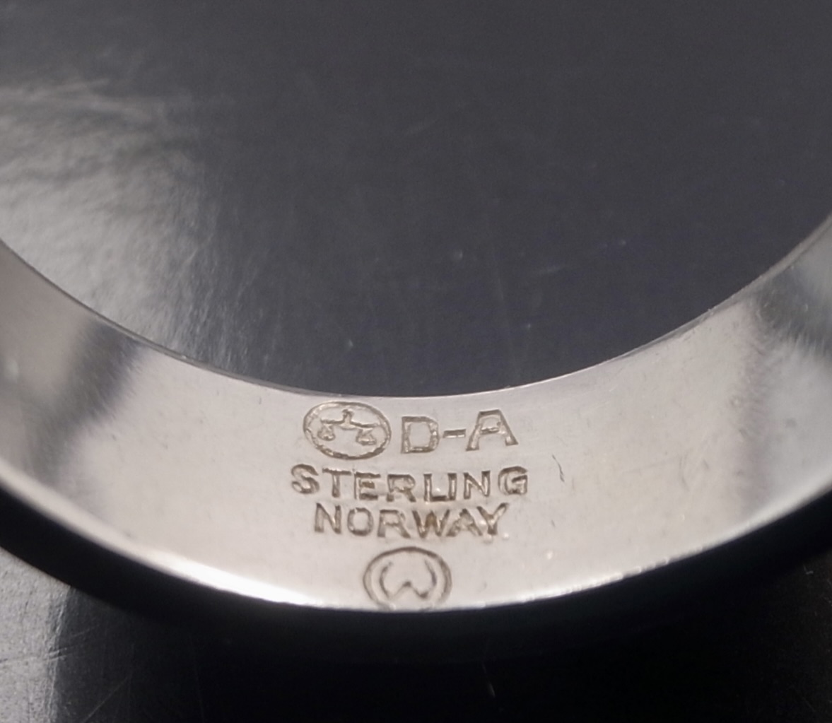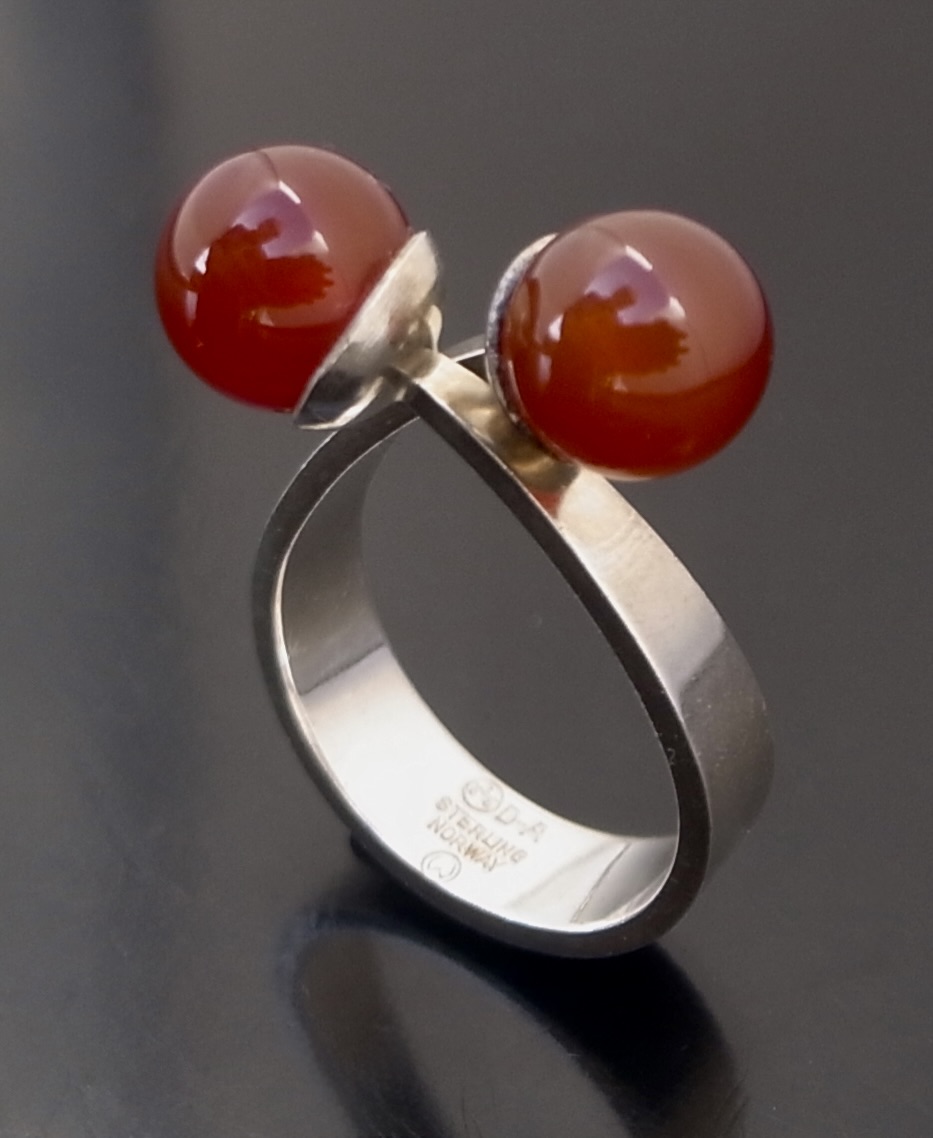Willy Winnaess for David-Andersen, a carnelian two bead set silver ring, Norway, circa 1965, stamped ‘D-A‘ for David-Andersen, balance scales trade mark for David-Andersen, ‘Norway -Sterling’ and ‘W’ within a circle for Willy Winnaess, the stones approximately 8 mm in diameter, finger size N, inner diameter approximately 16.5 mm (Ref S+2383) SOLD