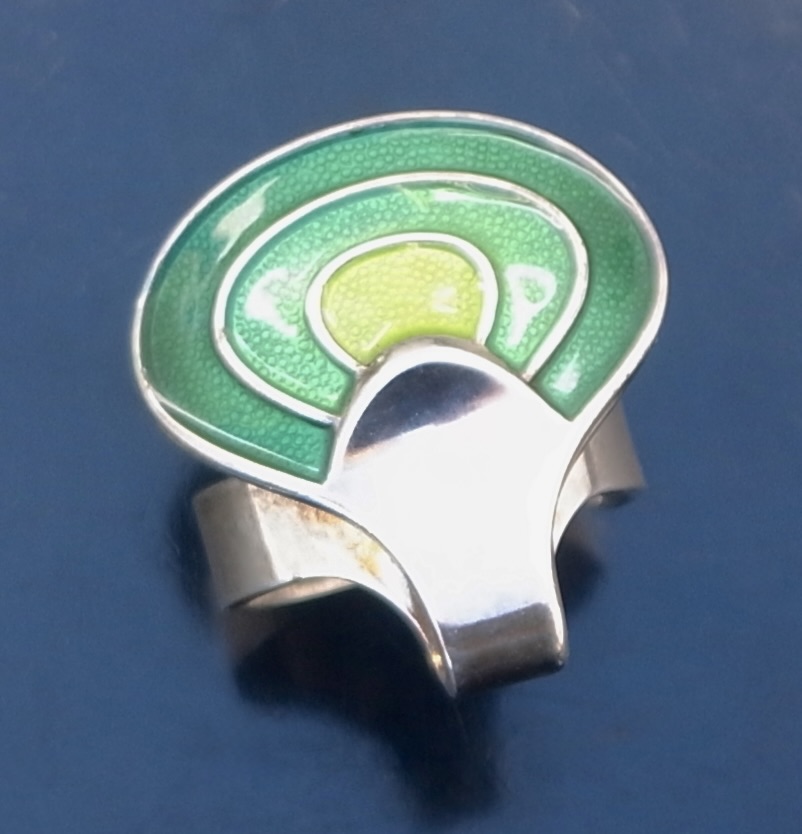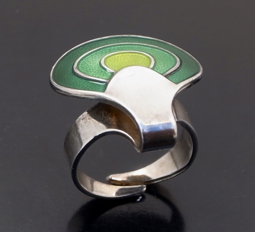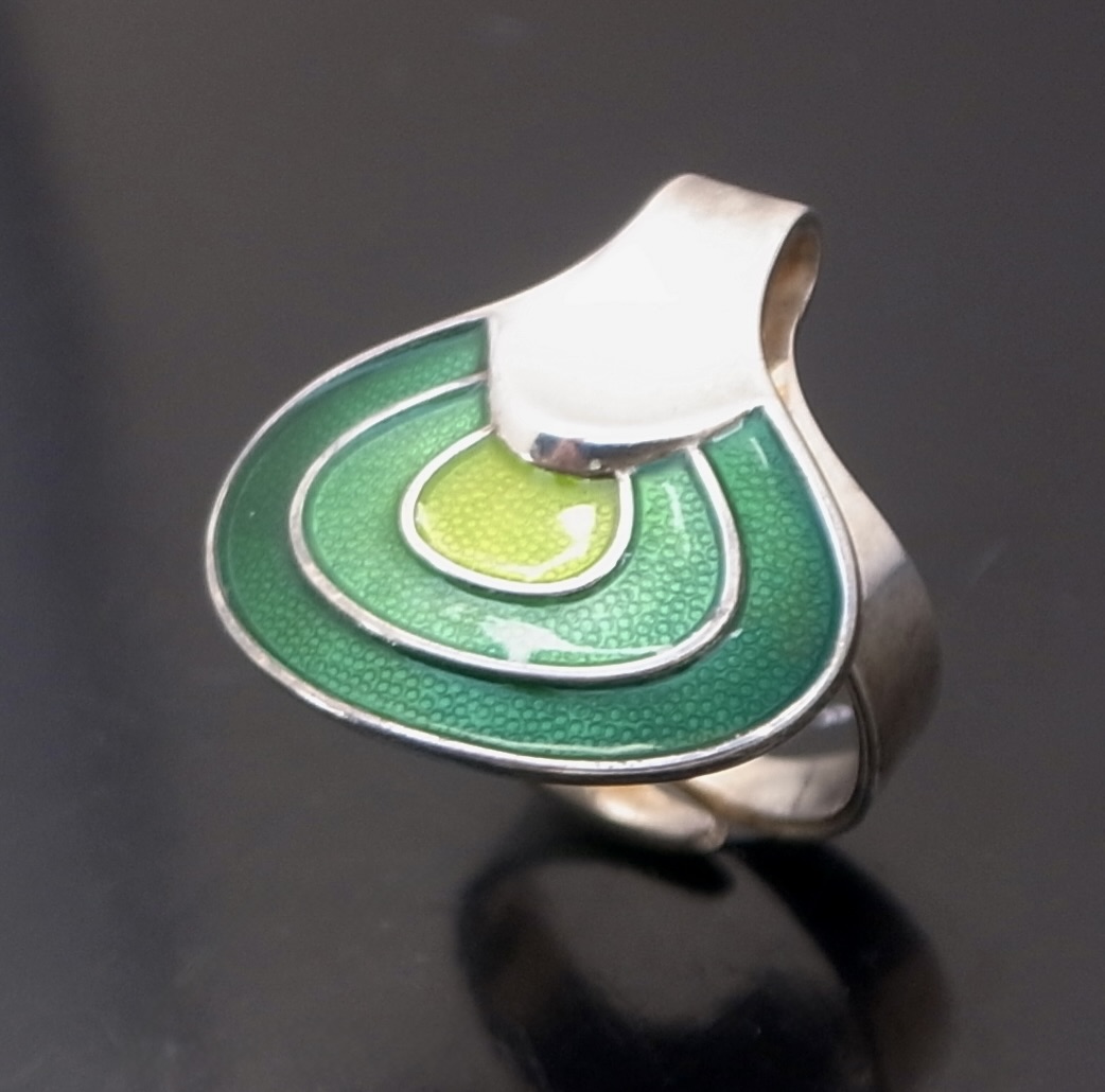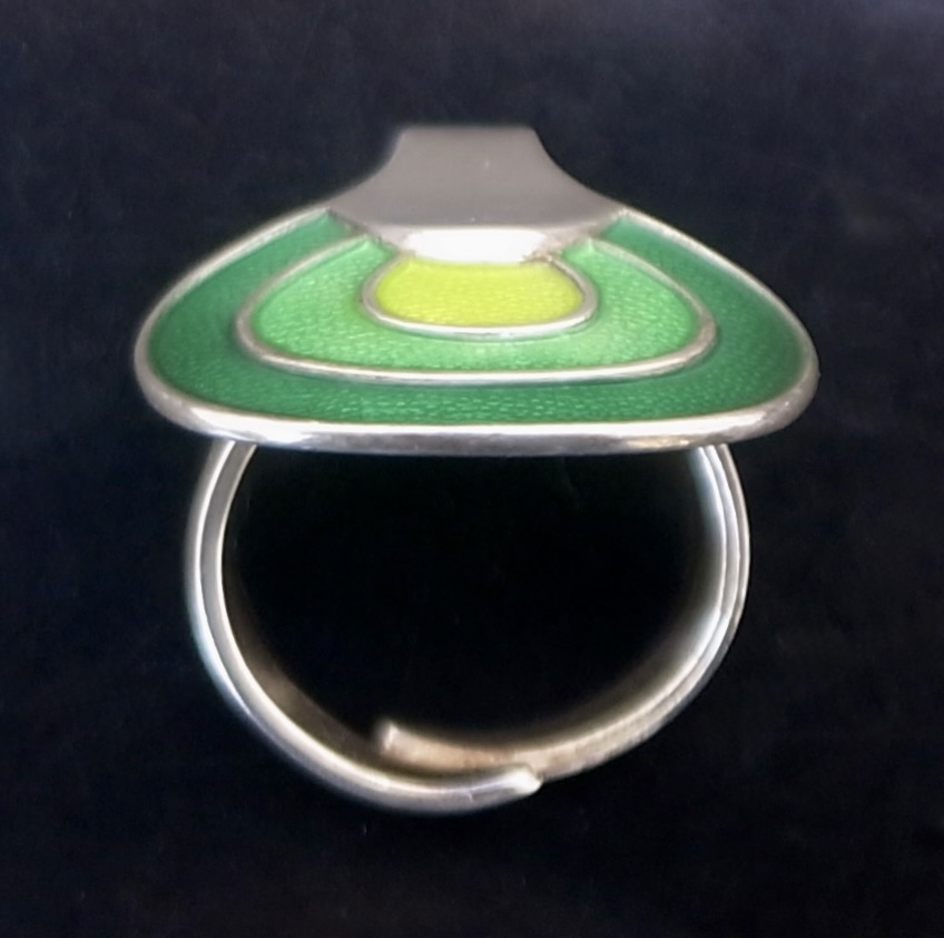 Toril Bjorg for David-Andersen, an enamel and silver ring, Norway, circa 1965, stamped ‘David-Andersen‘, ‘Norway‘, ‘Sterling’ and ‘925S’, the enamel panel above a split adjustable shank currently finger size P (Ref S+2378)
