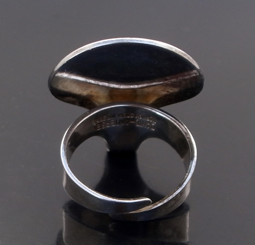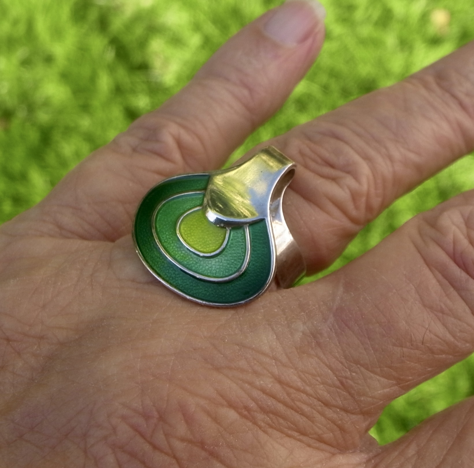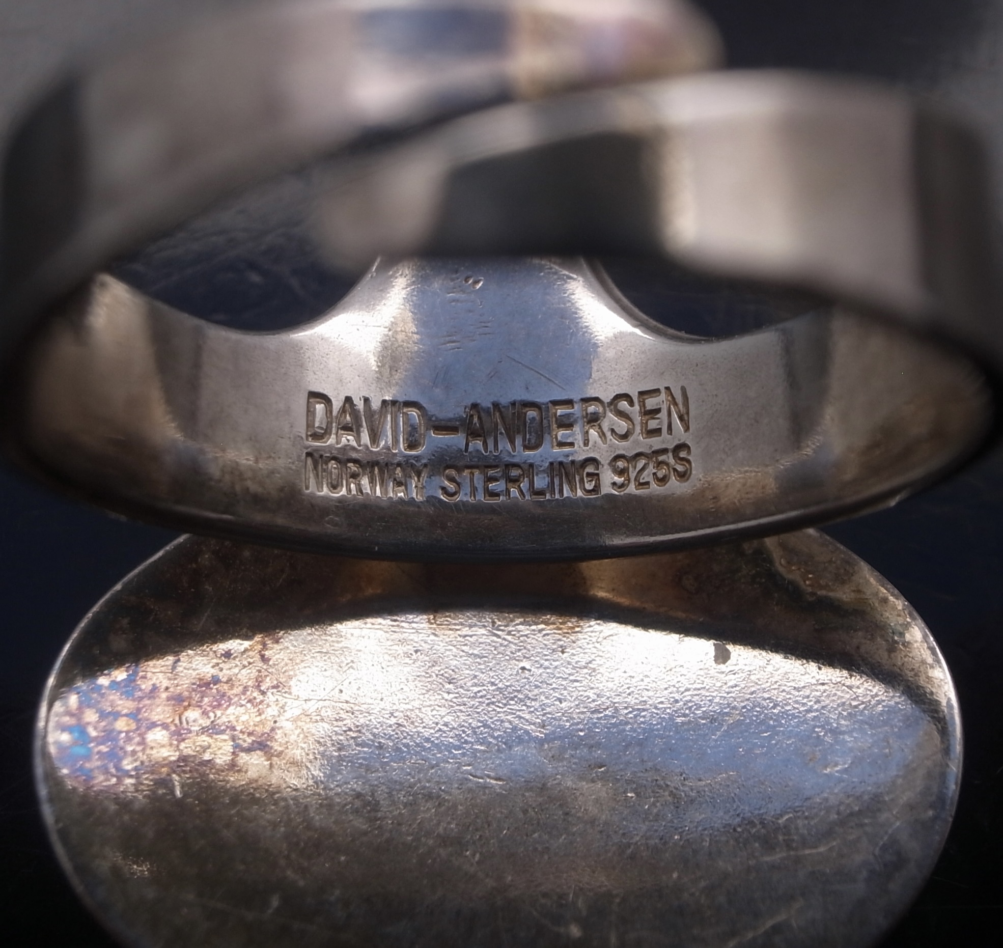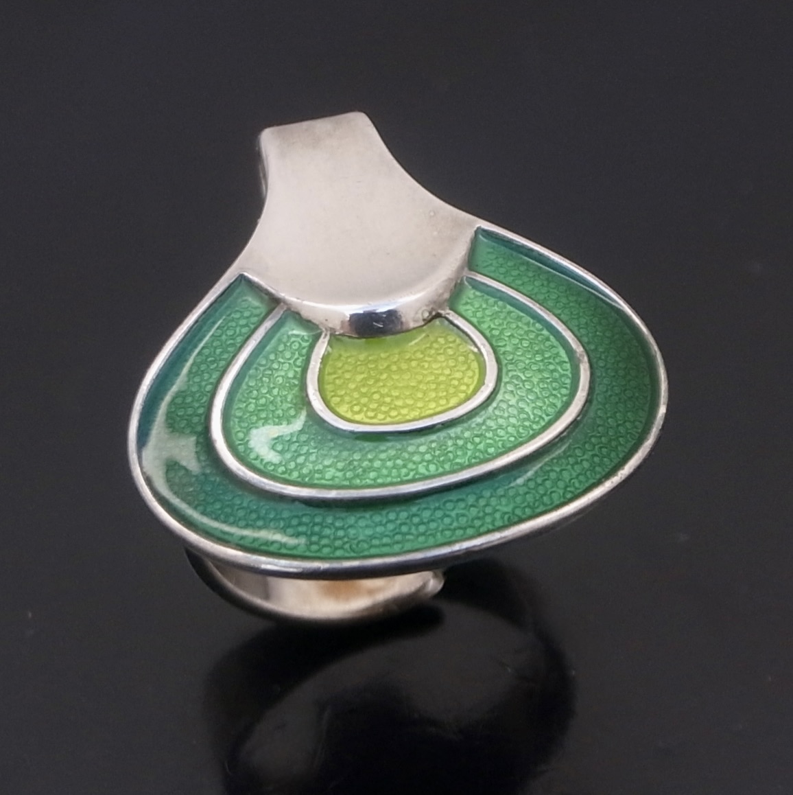 Toril Bjorg for David-Andersen, an enamel and silver ring, Norway, circa 1965, stamped ‘David-Andersen‘, ‘Norway‘, ‘Sterling’ and ‘925S’, the enamel panel above a split adjustable shank currently finger size P (Ref S+2378)