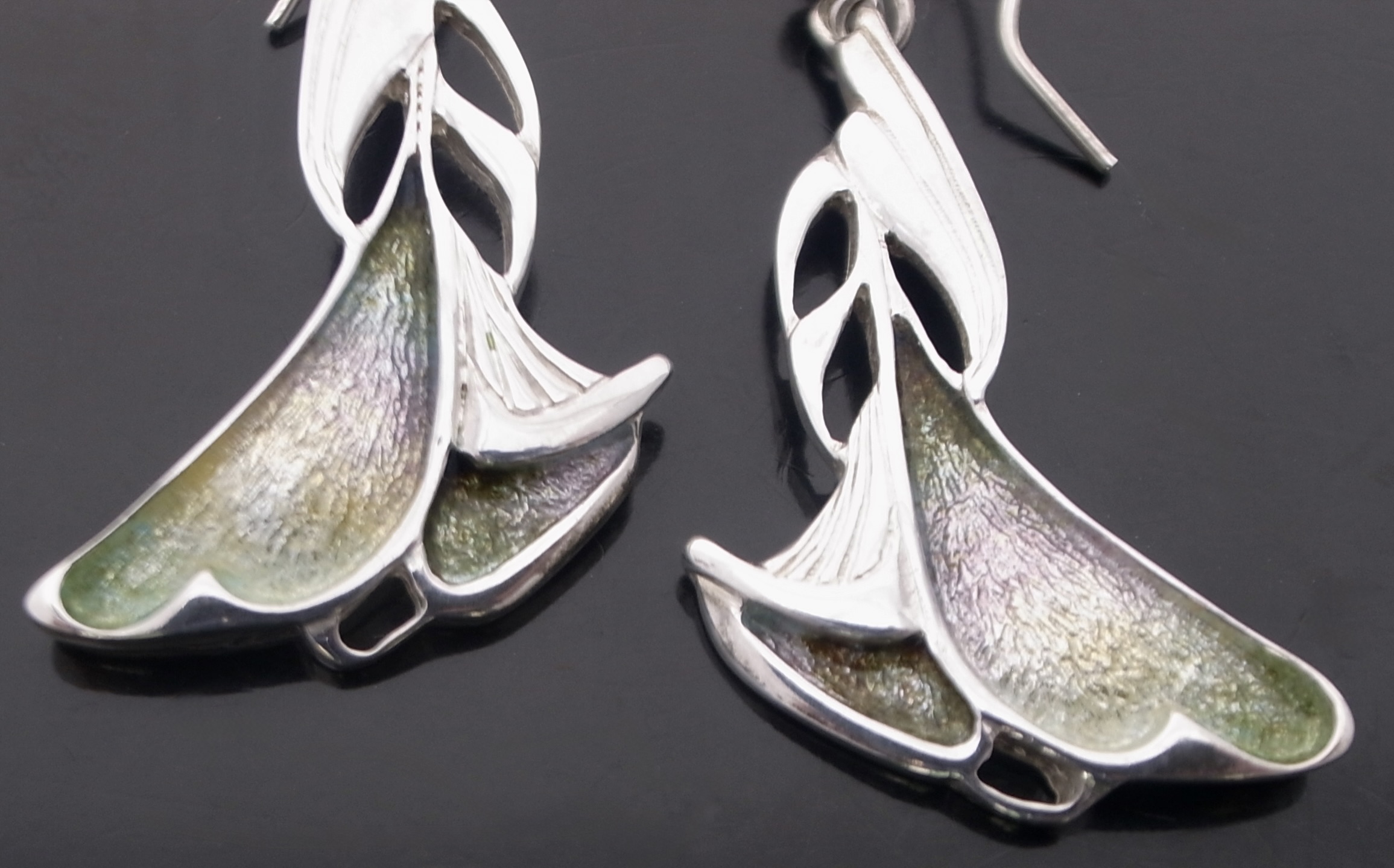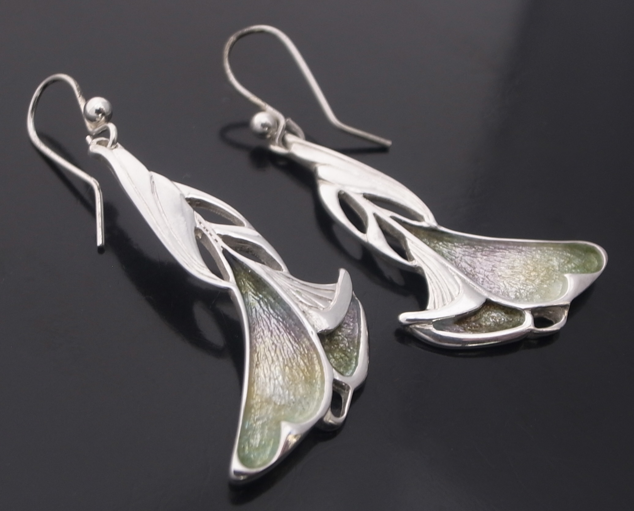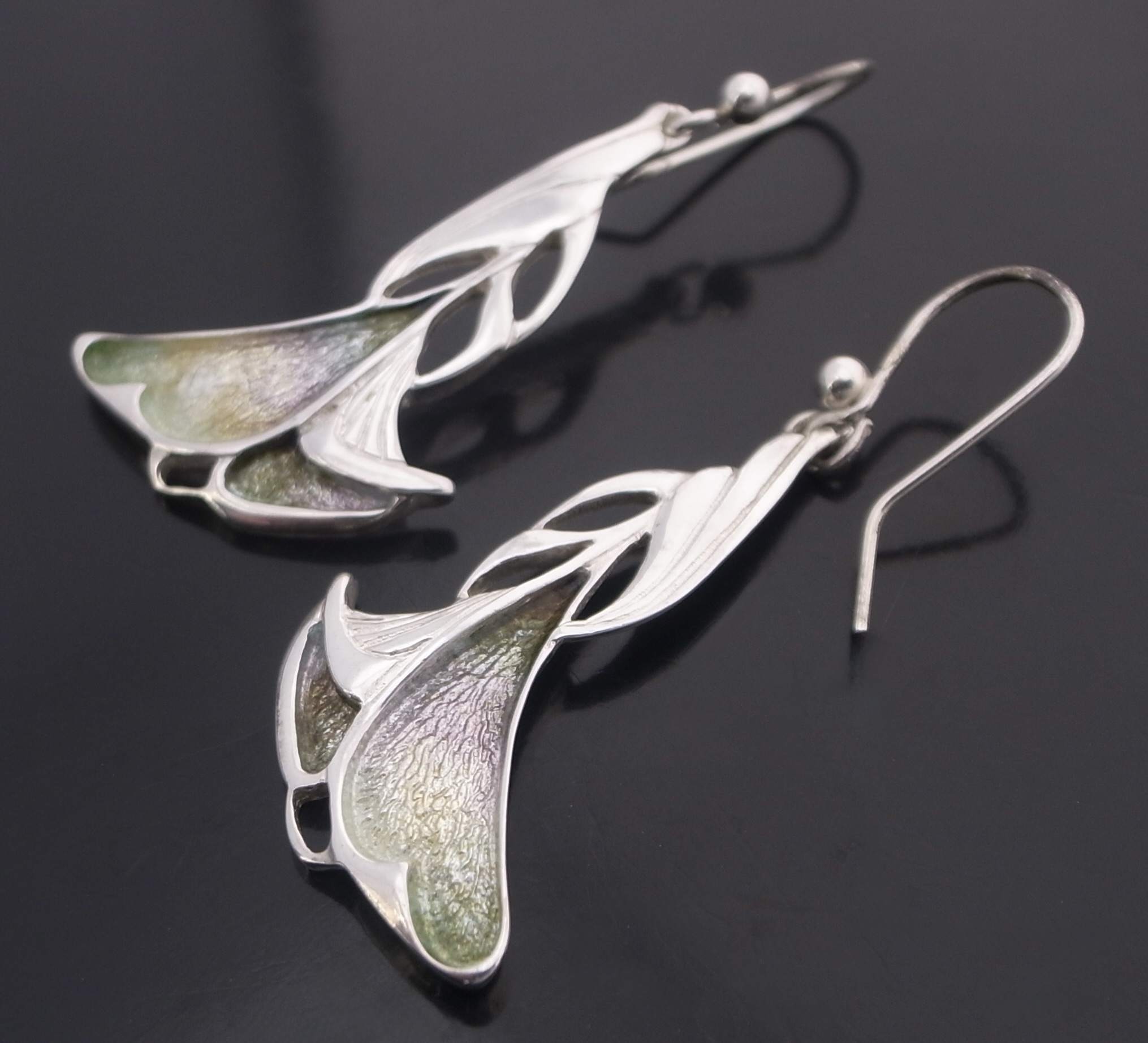 Dust Jewellery, a pair of enamel and silver drop earrings, Edinburgh 1998, stamped ‘DJ‘ for Dust Jewellery, the earrings approximately 3.5 cm long excluding the hook wires (Ref S+2393) SOLD
