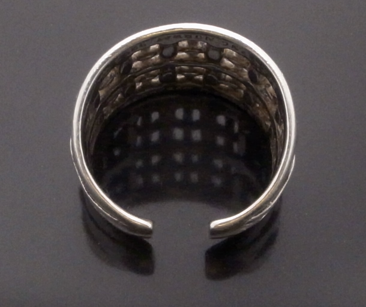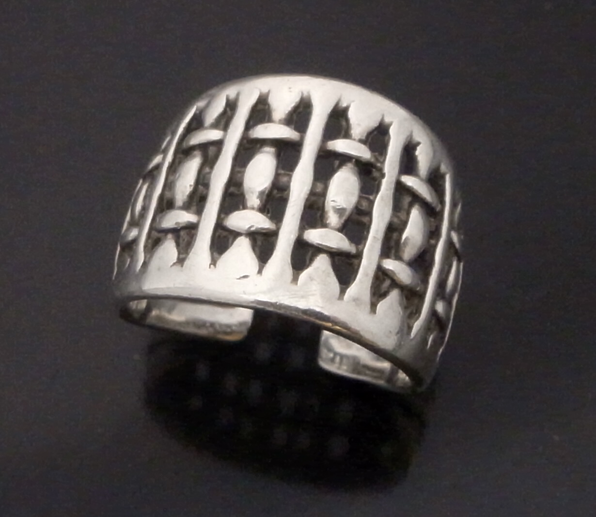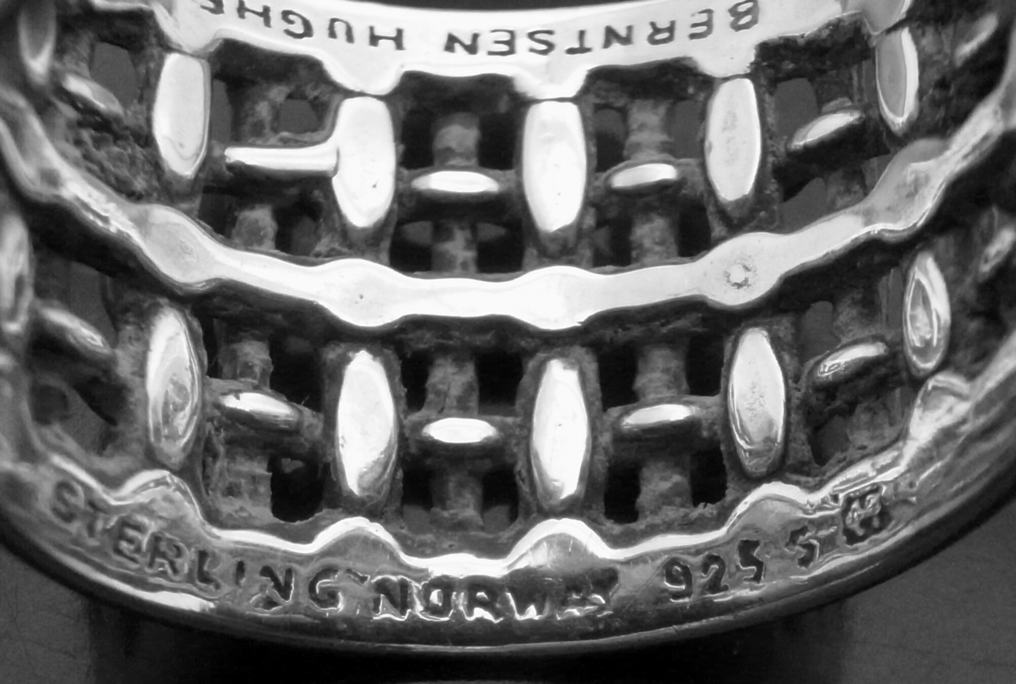 Else Berntsen Hughes, a cast silver ring, Norway, circa 1982, stamped ‘Berntsen Hughes‘, ‘Norway‘, ‘Sterling’, ‘925S’ and a letter H, split shank so adjustable to a small degree, currently finger size O, inner diameter approximately 18.5 mm, this is model number 371115 (Ref S+2276)