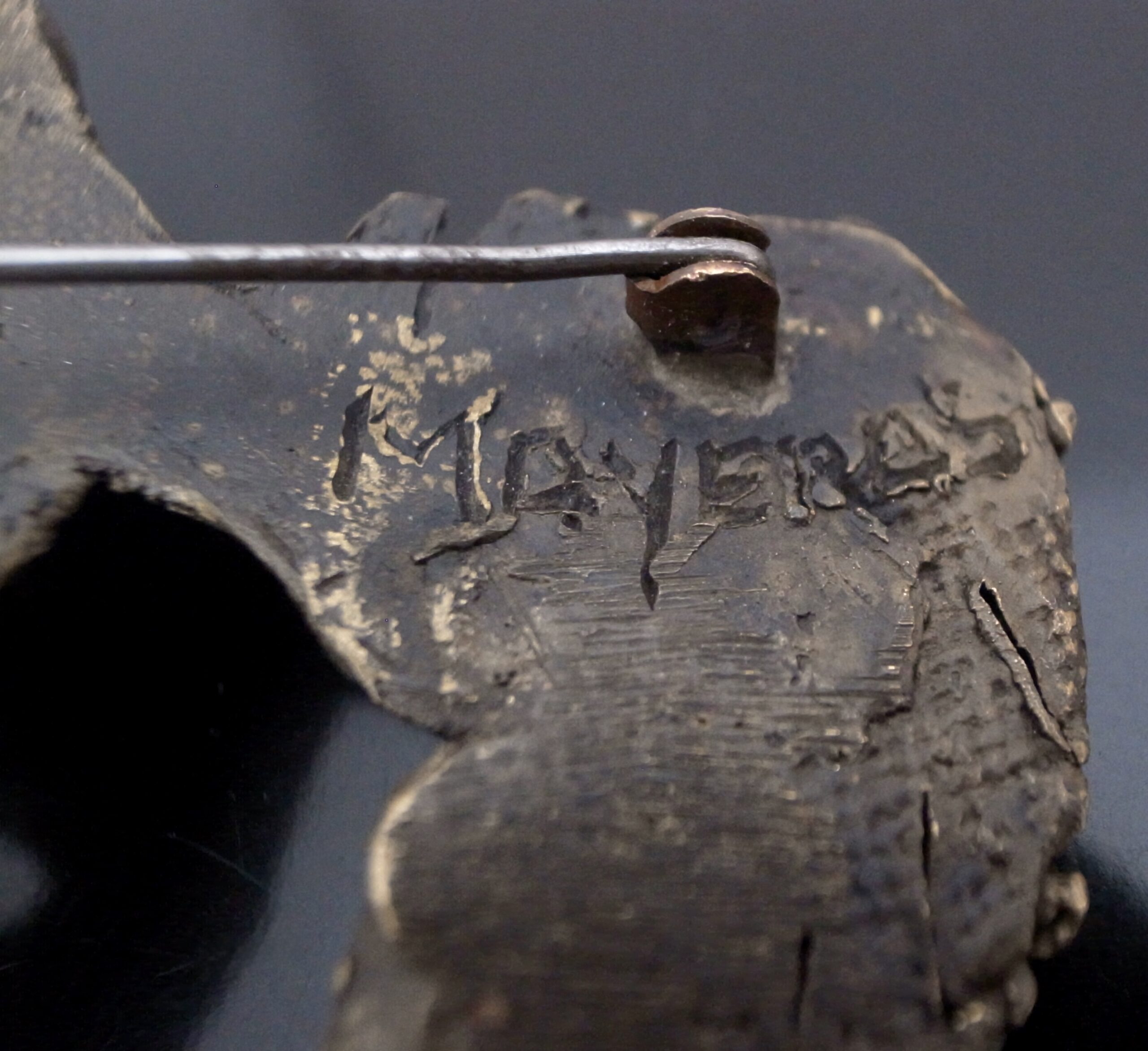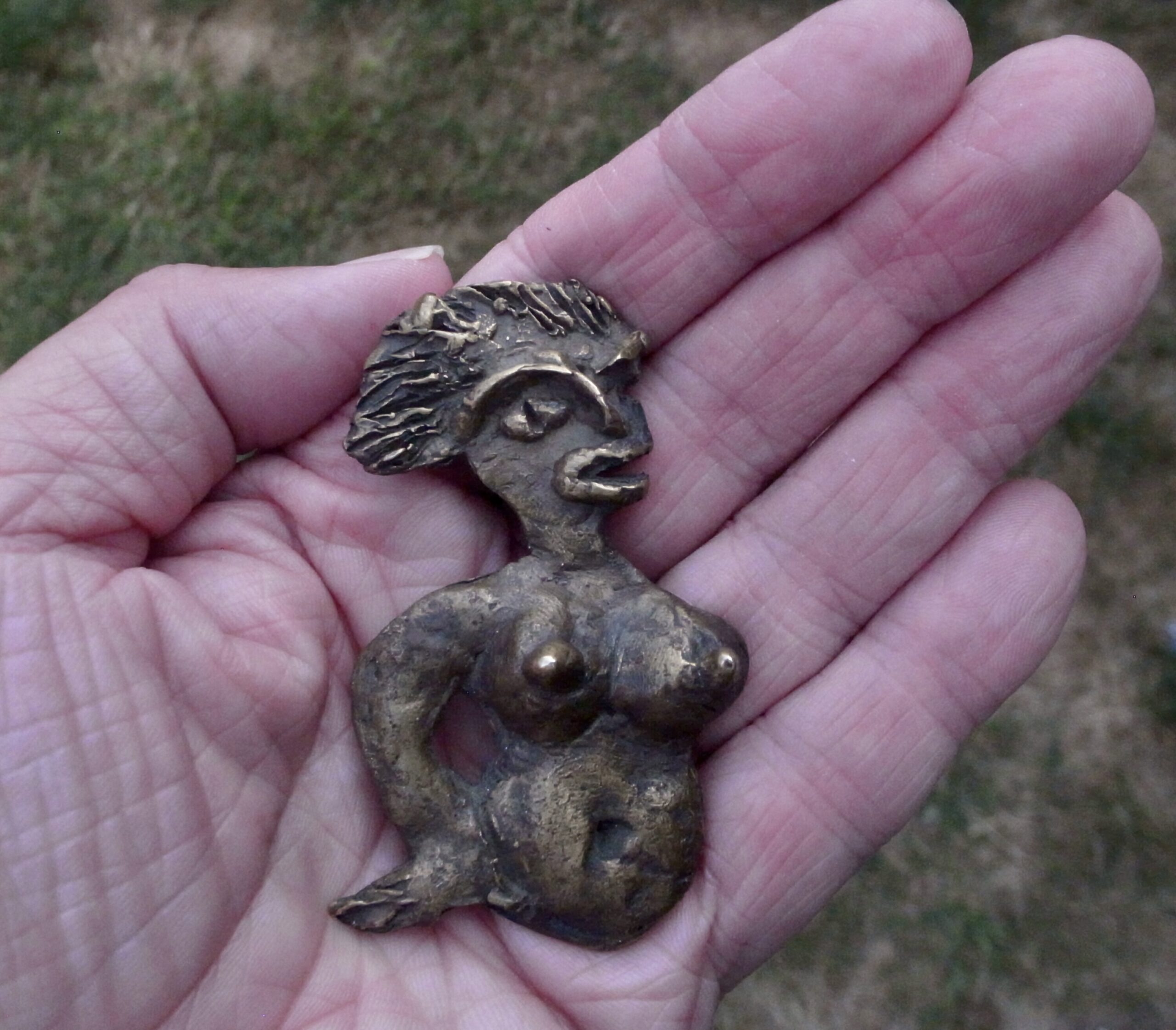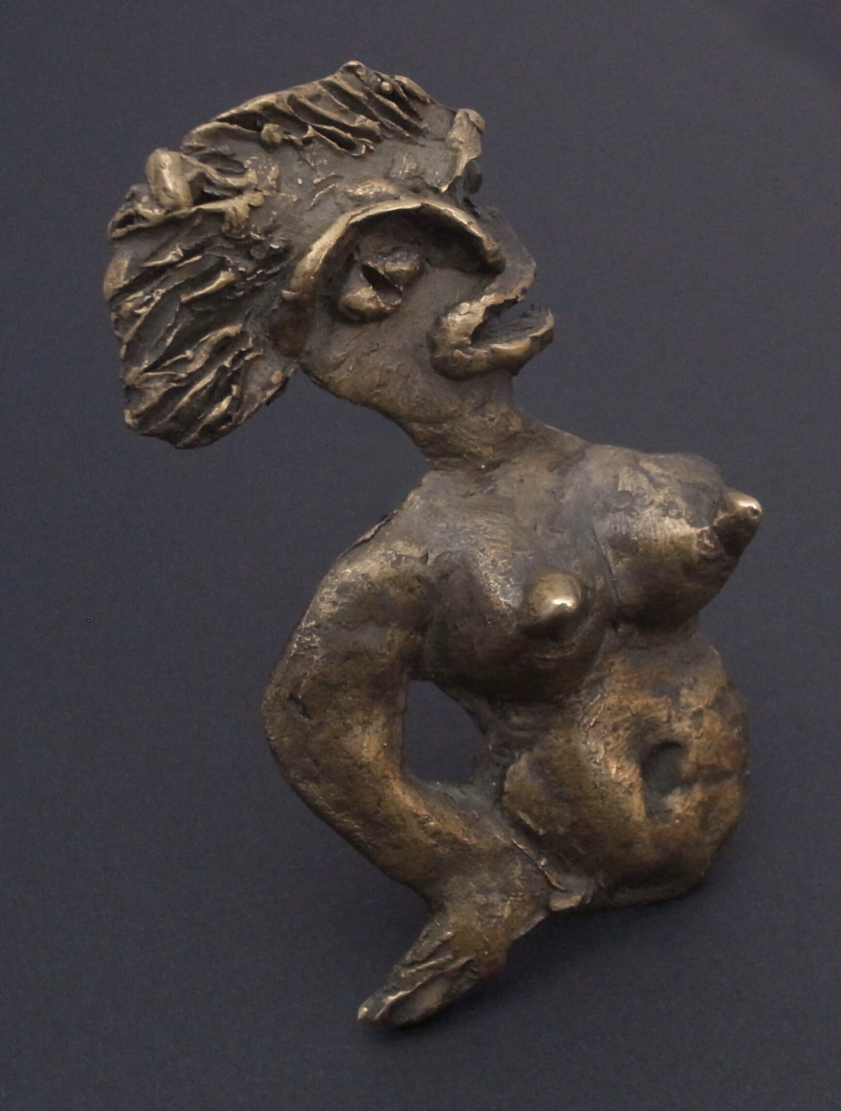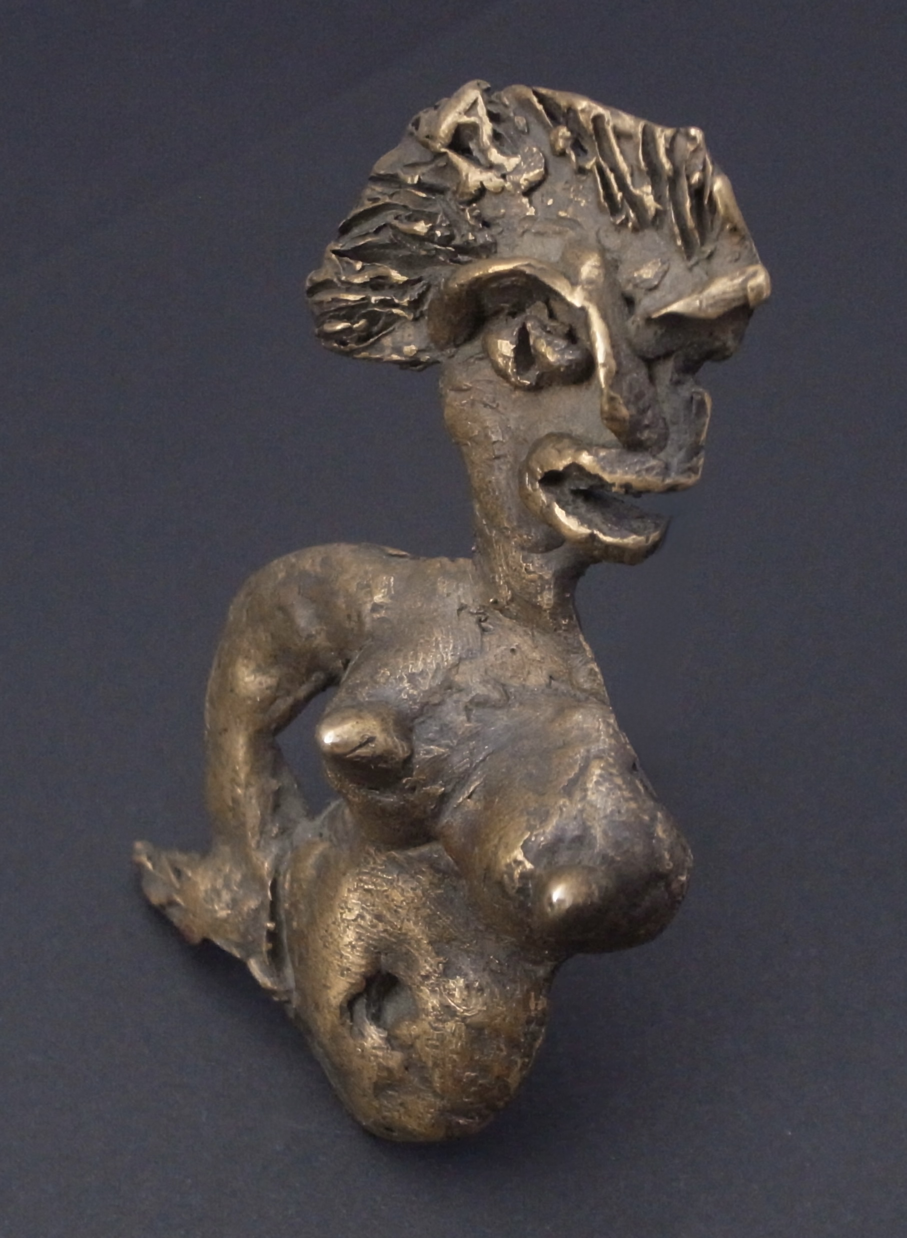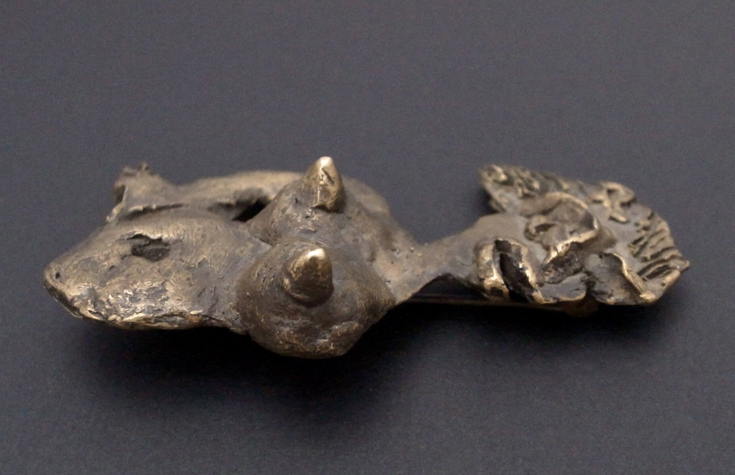 Francoise Mayeras (1942-), a bronze cast brooch of a naked female demi-figure, France, circa 1989, signed to the reverse ‘Mayeras‘, measuring approximately 6.9 cm long by 4.5 cm at widest overall (Ref S+2334) SOLD