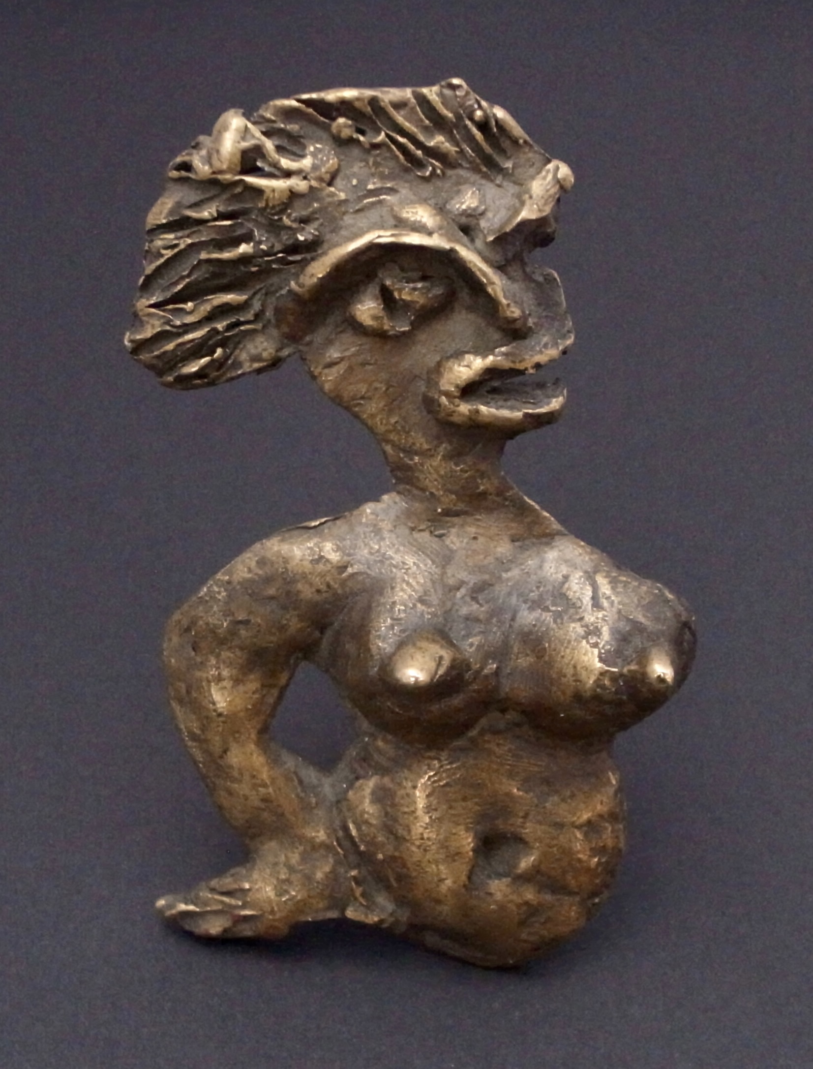 See her sculptures ‘Femme a l’oiseau’ and ‘Jeune Fille Dodue’ both dated to 1989 that bear similarities to this brooch, at this link https://www.artpulsion.com/artist.asp?artistID=247. Her work in jewellery is exceedingly small in number. This example appears to show a mix of naive art in the execution and style then African tribal art in the exaggeration of the body form.