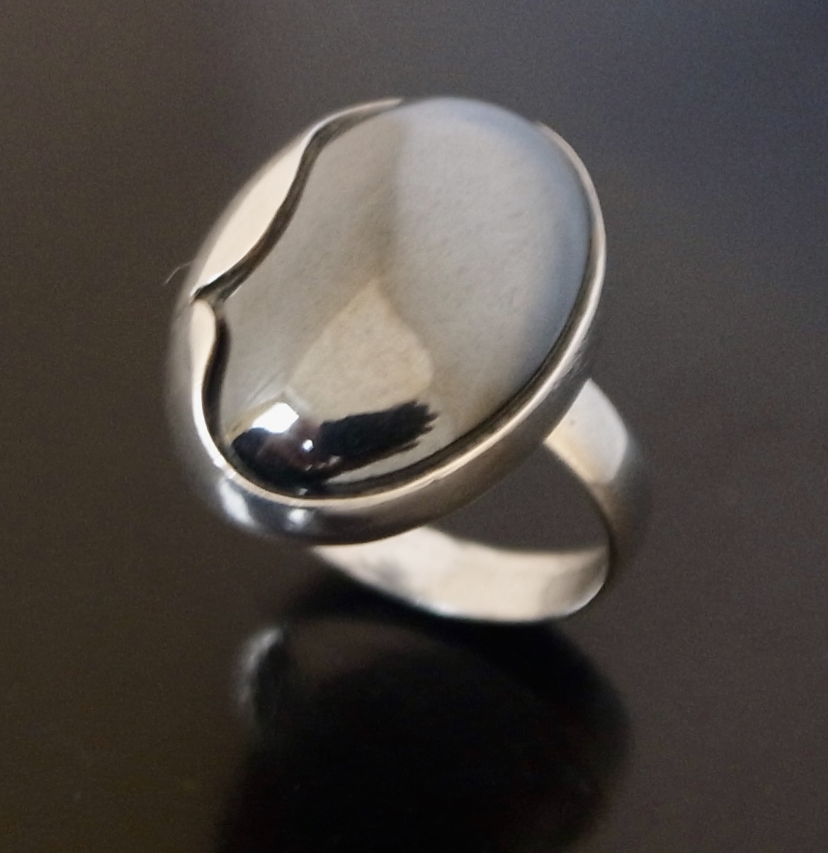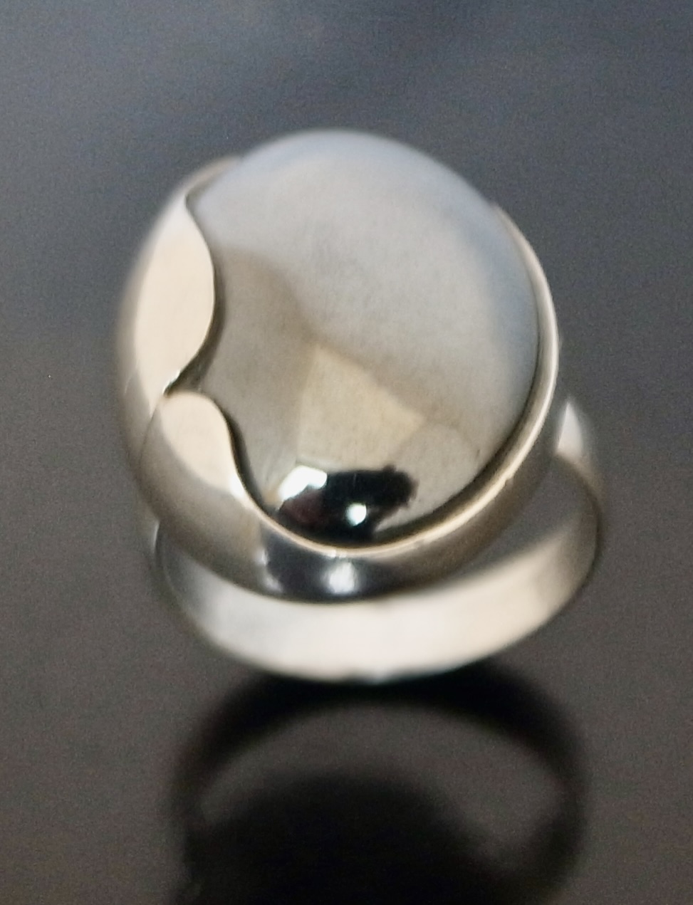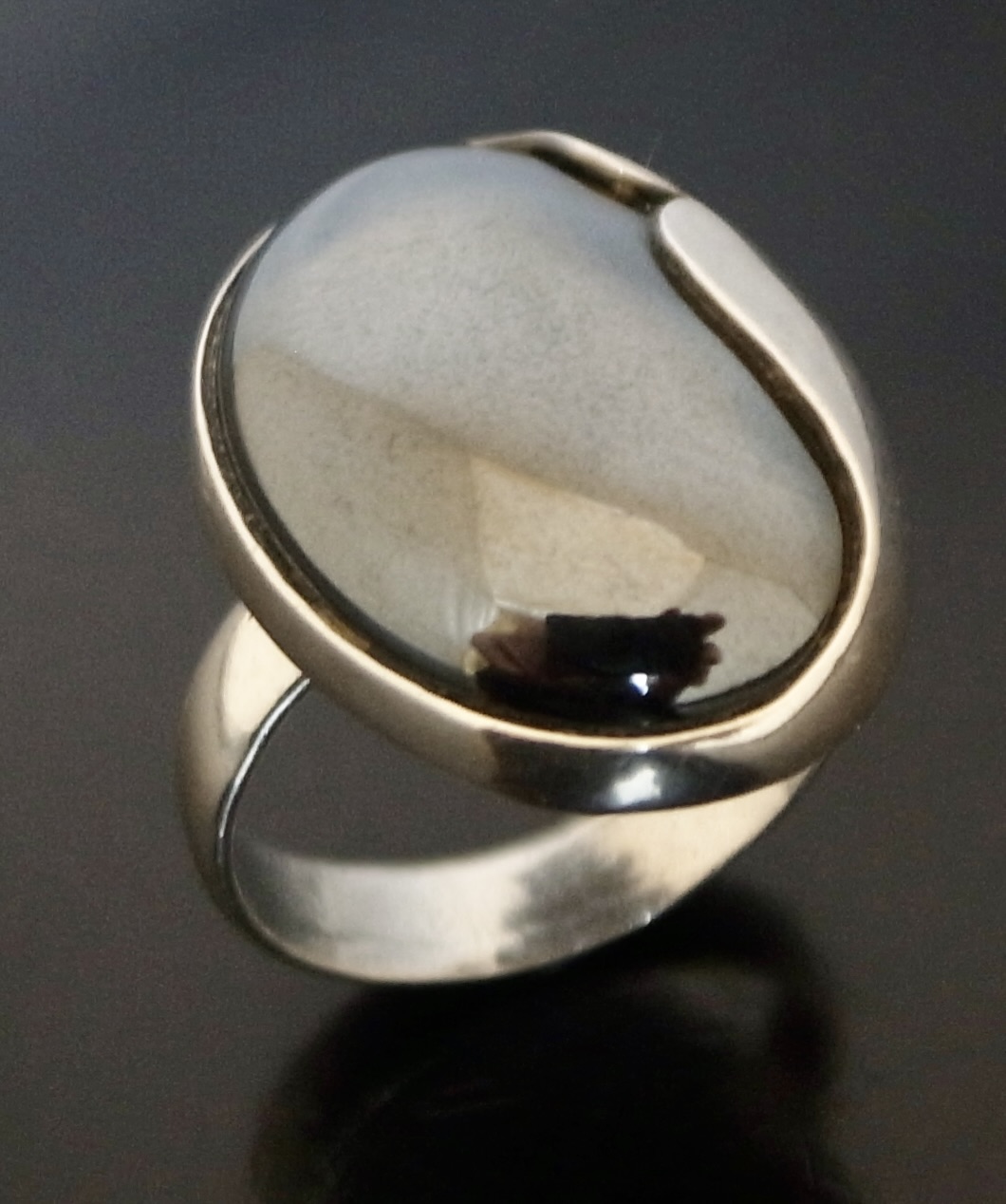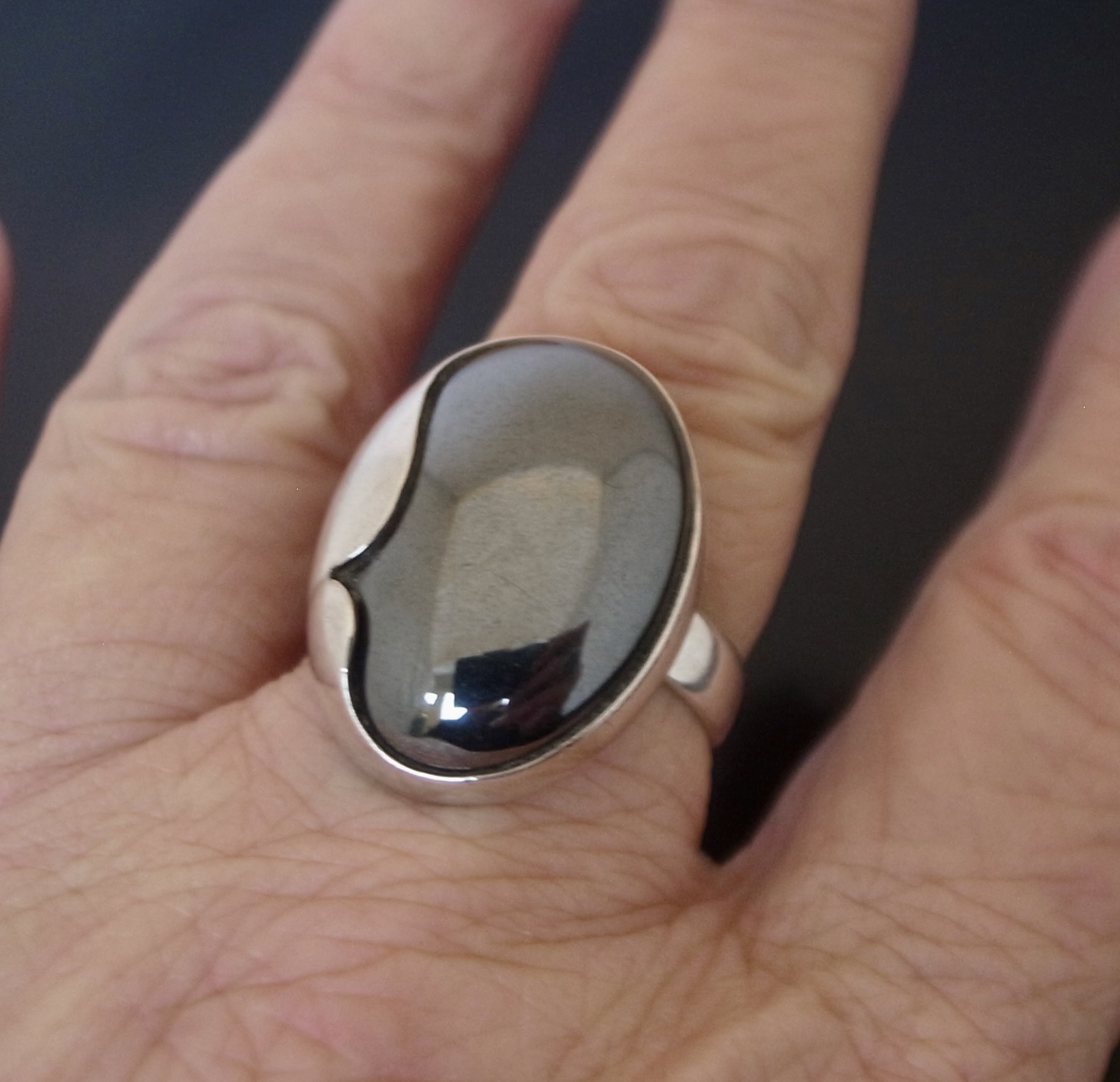 Hans Henrik Nygaard, a hematite set silver ring, Denmark, circa 1990, stamped ‘HHN‘ for Hans Henrik Nygaard, and ‘925’, the head measuring approximately 2.7 cm by 1.9 cm, finger size Q (Ref S+2473)