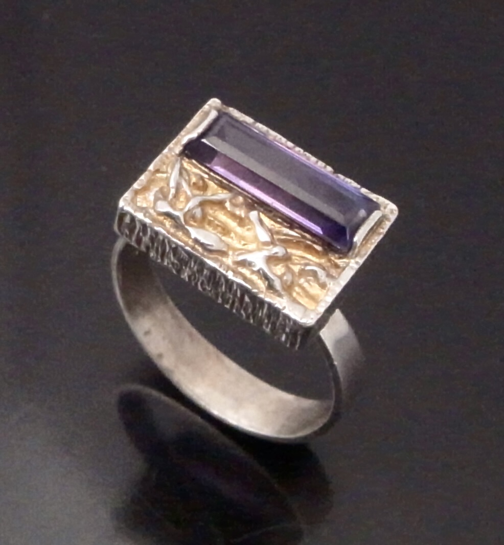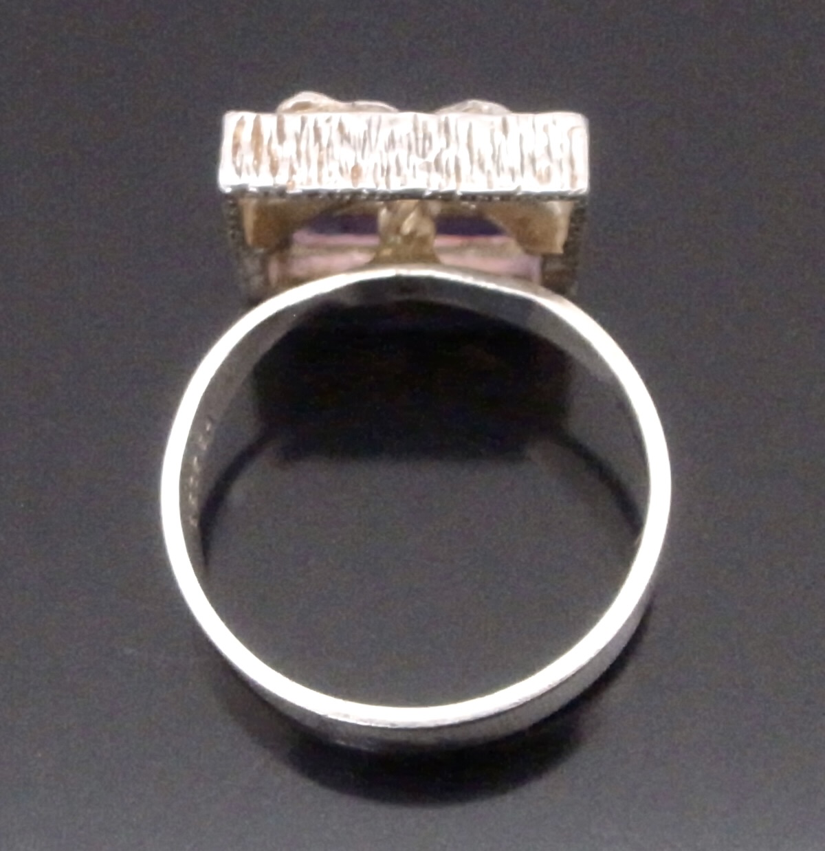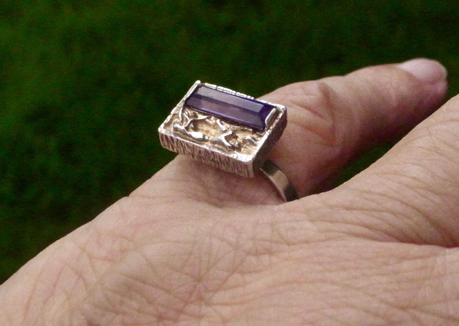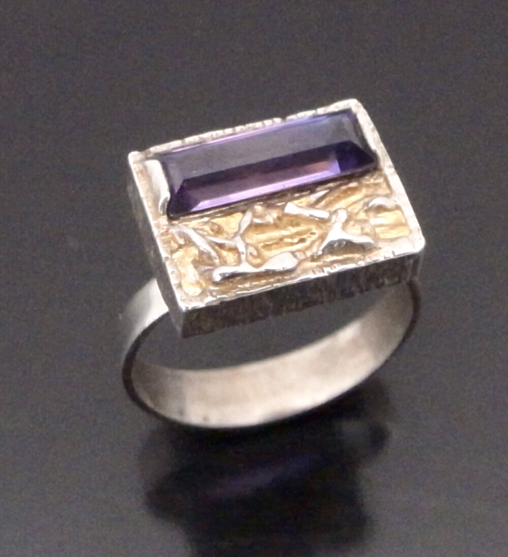 Hermann Siersbol, a purple paste set silver ring, Denmark, circa 1970, stamped ‘HS‘ for Hermann Siersbol, and ‘925S’, the rectangular shaped head approximately 14 mm long by 11 mm, with a step cut purple paste set to one side, also traces of gilding, finger size N 1/2 (Ref S+2377)