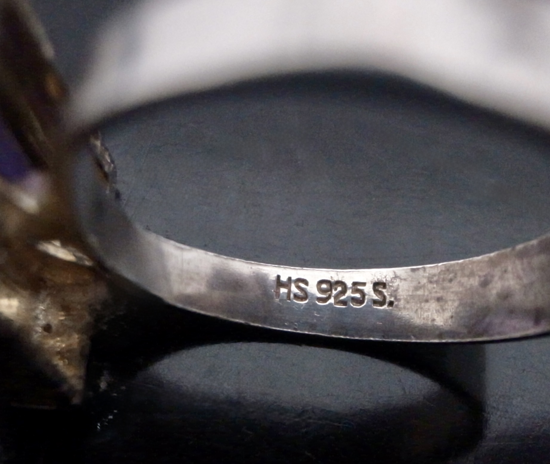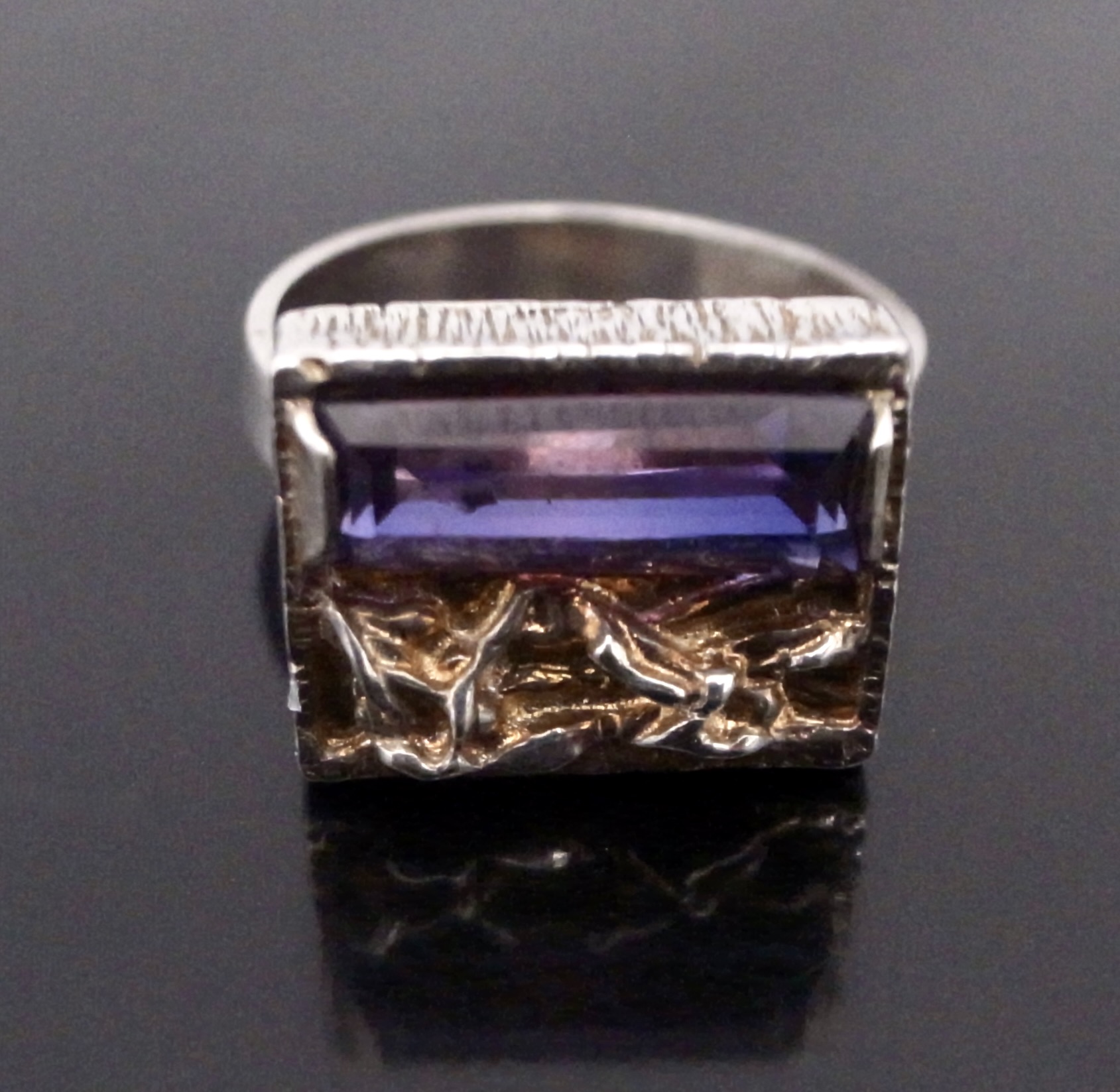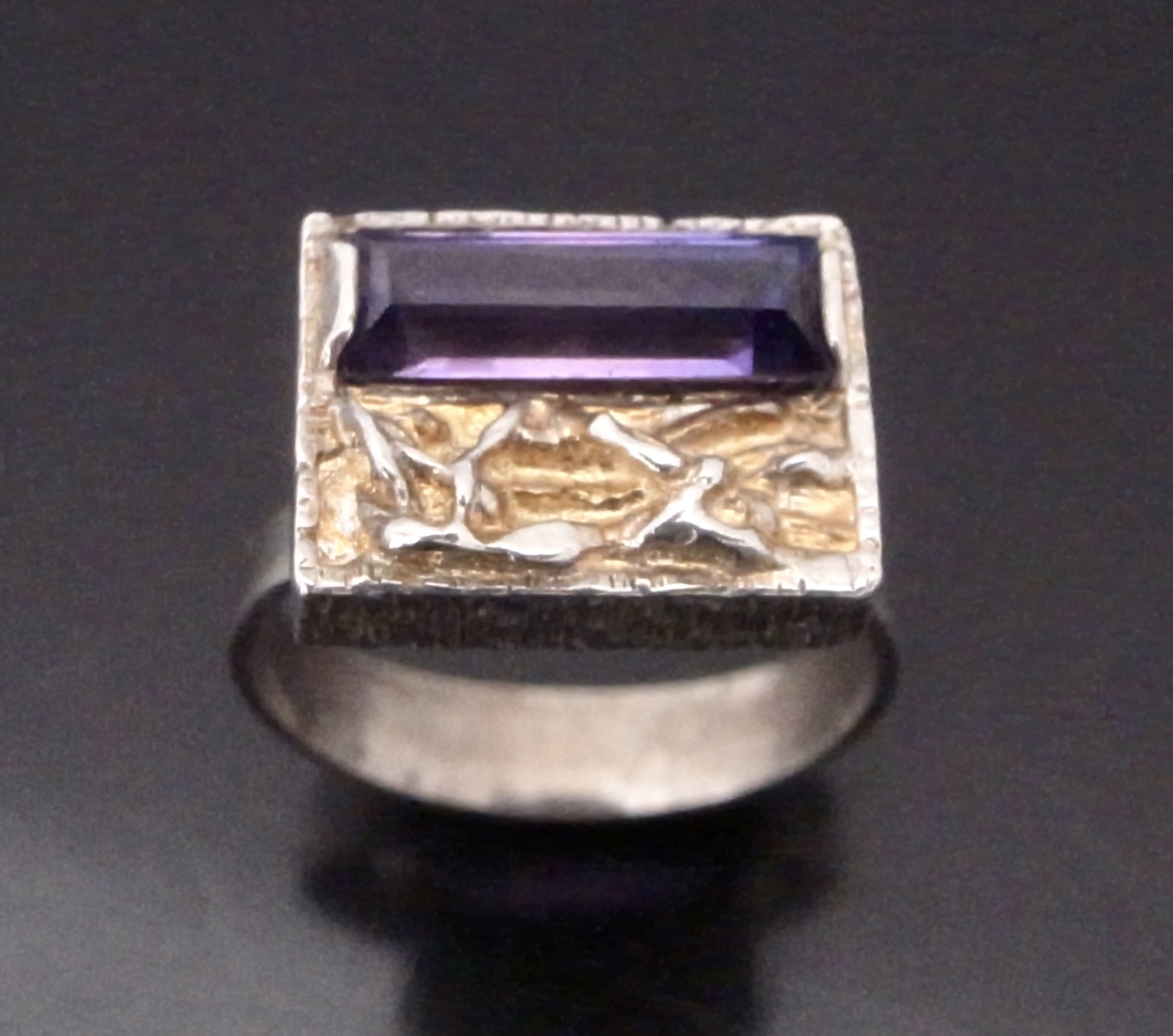 Hermann Siersbol, a purple paste set silver ring, Denmark, circa 1970, stamped ‘HS‘ for Hermann Siersbol, and ‘925S’, the rectangular shaped head approximately 14 mm long by 11 mm, with a step cut purple paste set to one side, also traces of gilding, finger size N 1/2 (Ref S+2377)