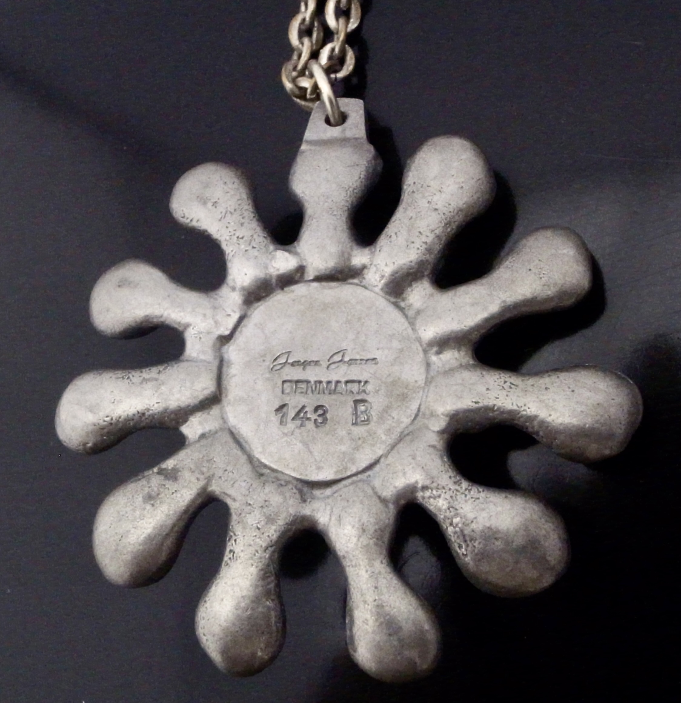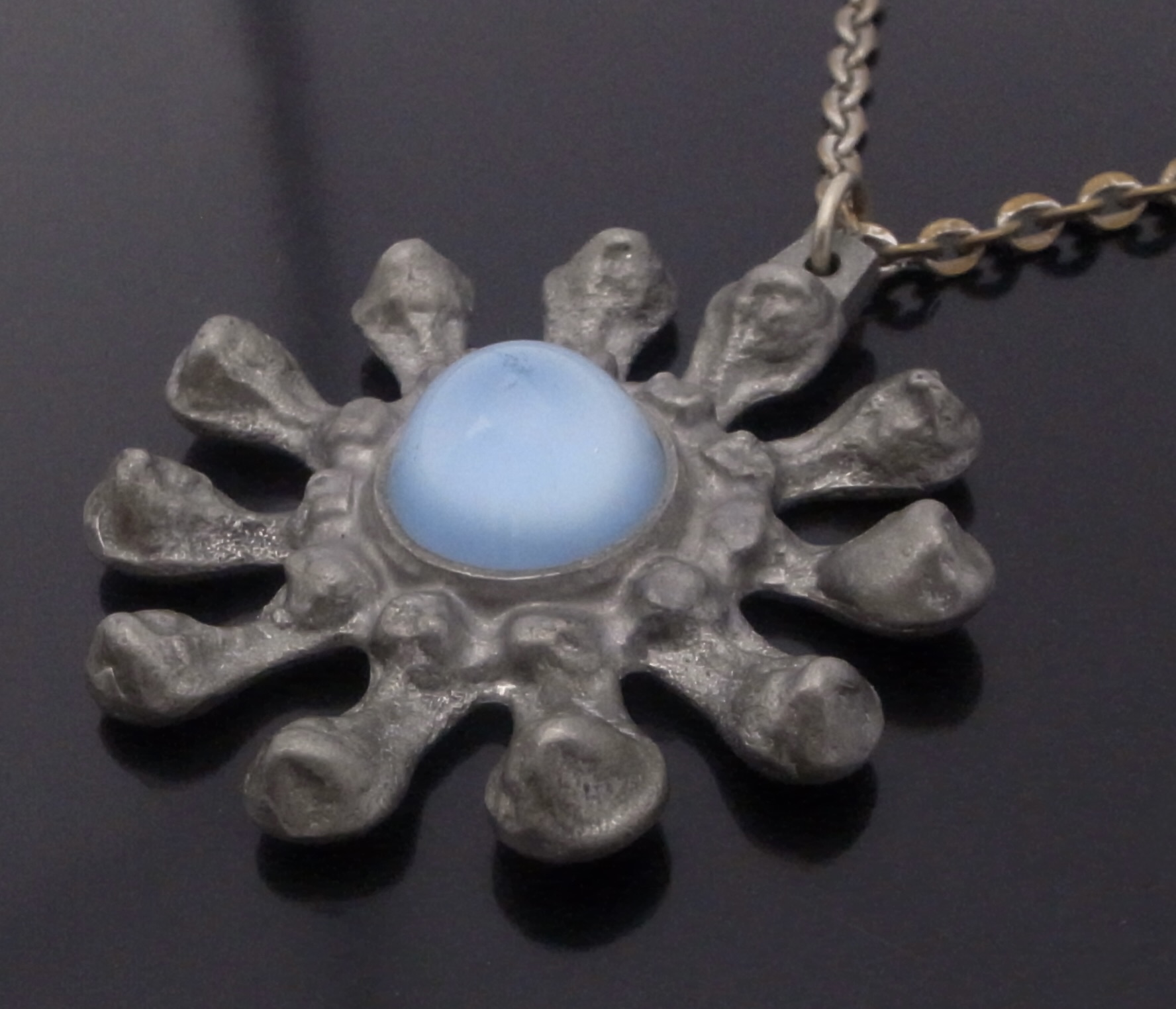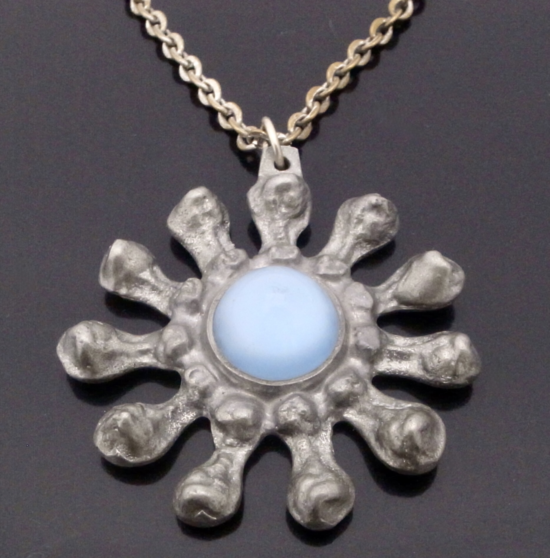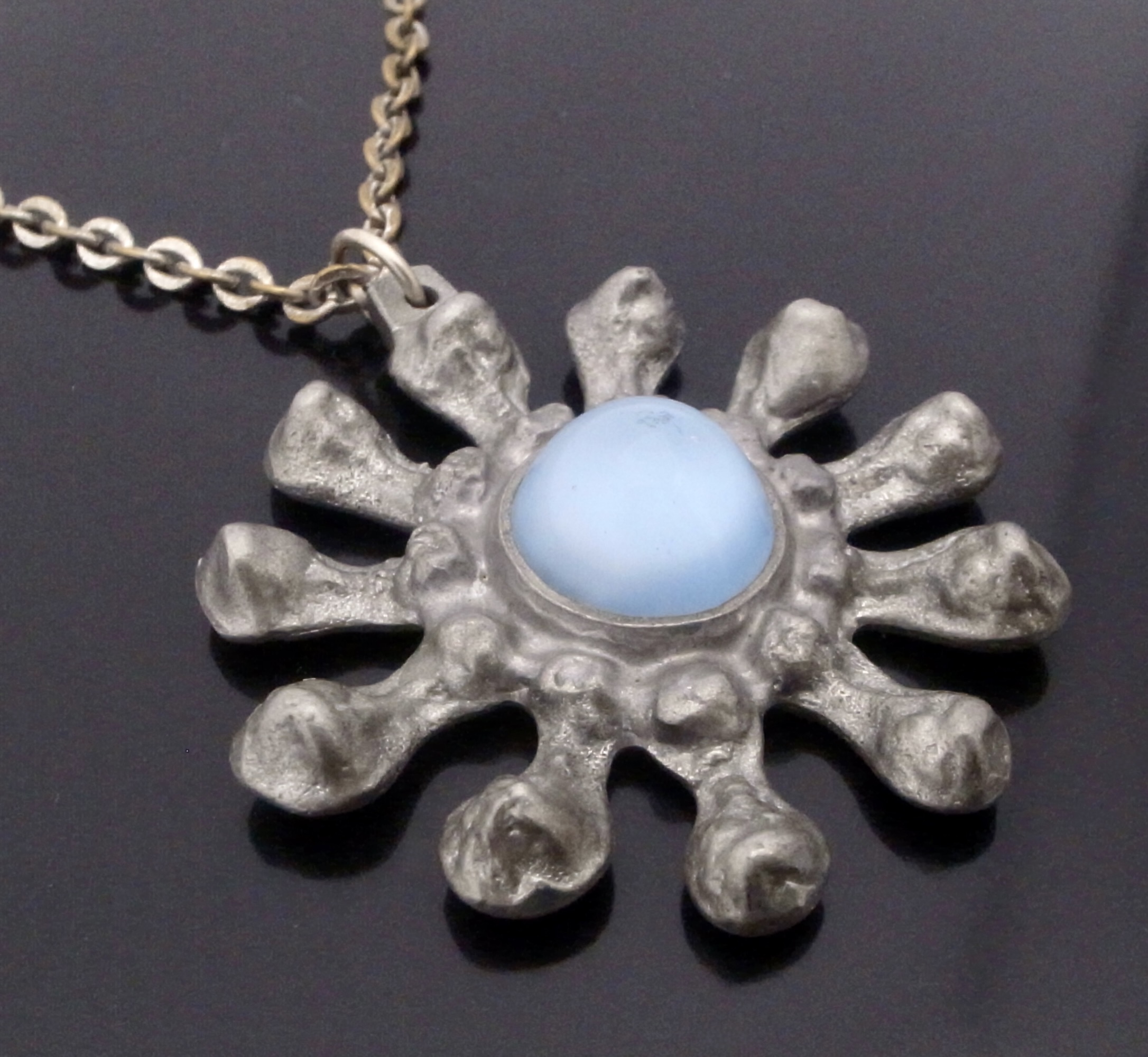 Jorgen Jensen, a pale blue cabochon paste set brutalist style pewter pendant on chain, Denmark, circa 1968, stamped with ‘Jorgen Jensen‘ facsimile signature, ‘Denmark‘ and ‘143B’, approximately 5 cm in diameter and the chain 64 cm long (Ref S+2326)