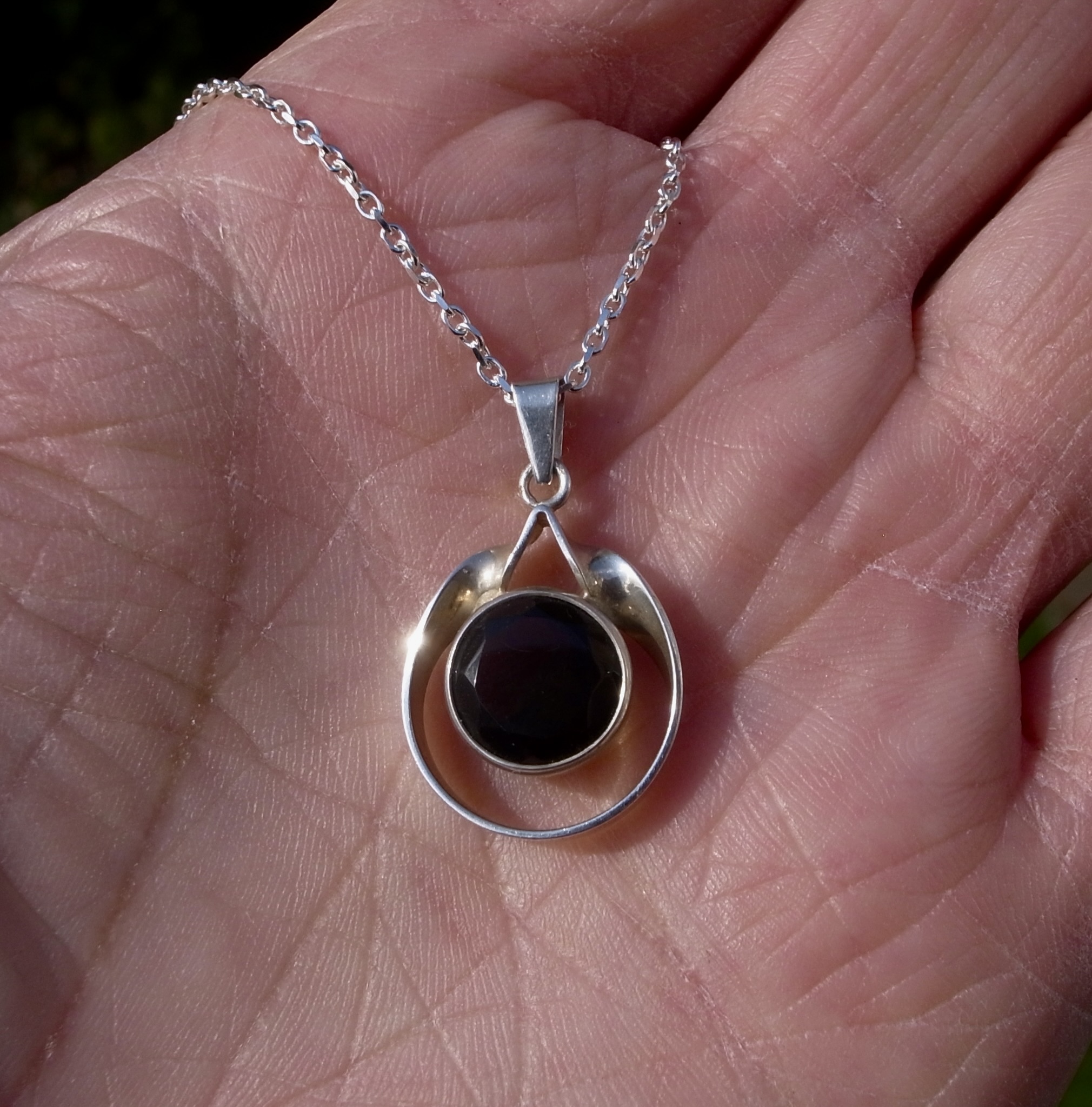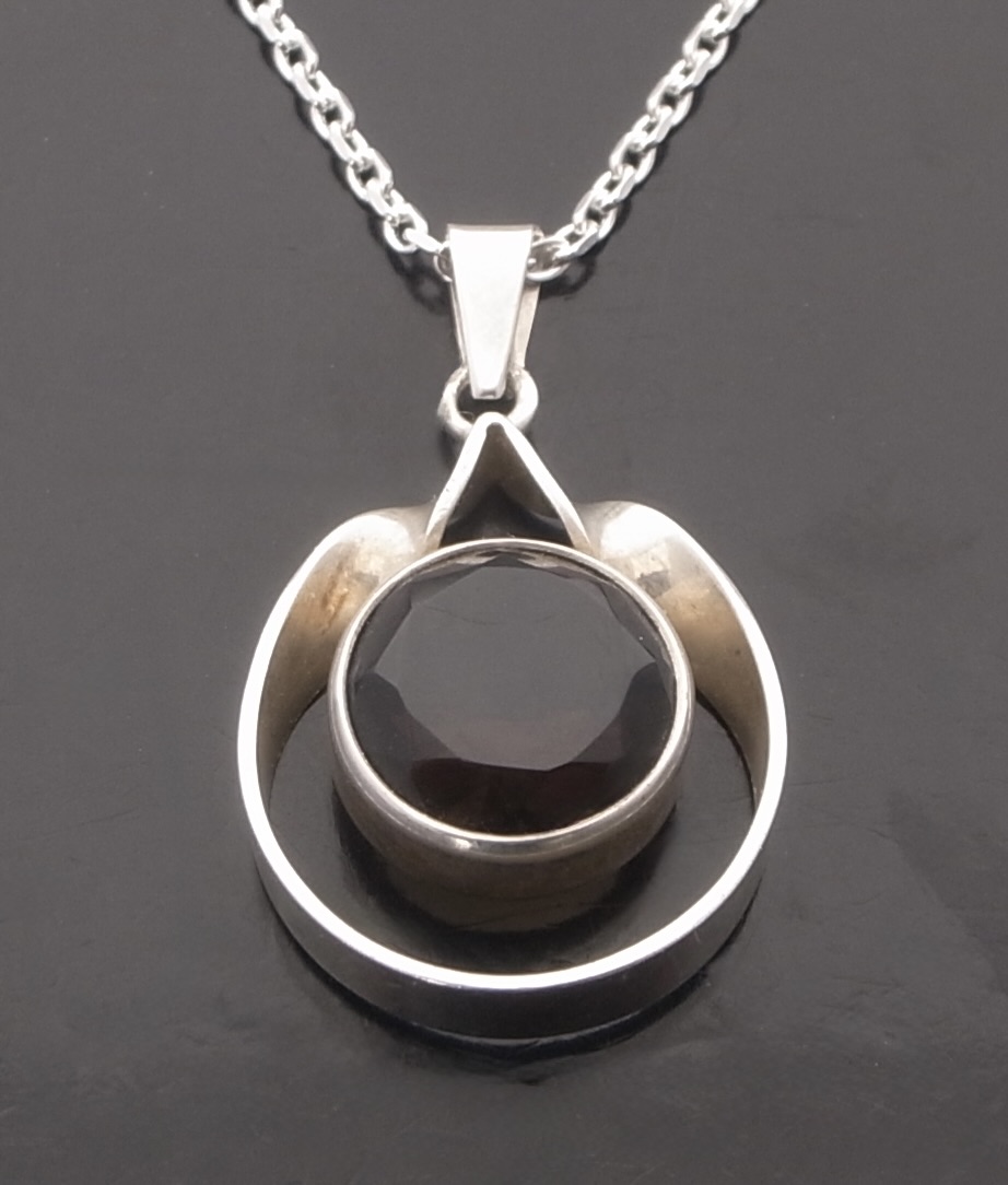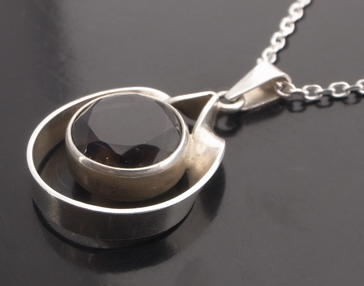 Kultaseppa Salovaara, a smoky quartz set silver pendant on a chain, Finland, circa 1965, stamped to the bale with the Polar Bear trade mark for Kultaseppa Salovaara, ‘925’ and ‘Finland‘, the round cut smoky quartz approximately 9 mm in diameter, the pendant itself approximately 1.6 cm in diameter, on a new sterling silver chain, 50 cm long (Ref S+2398) SOLD