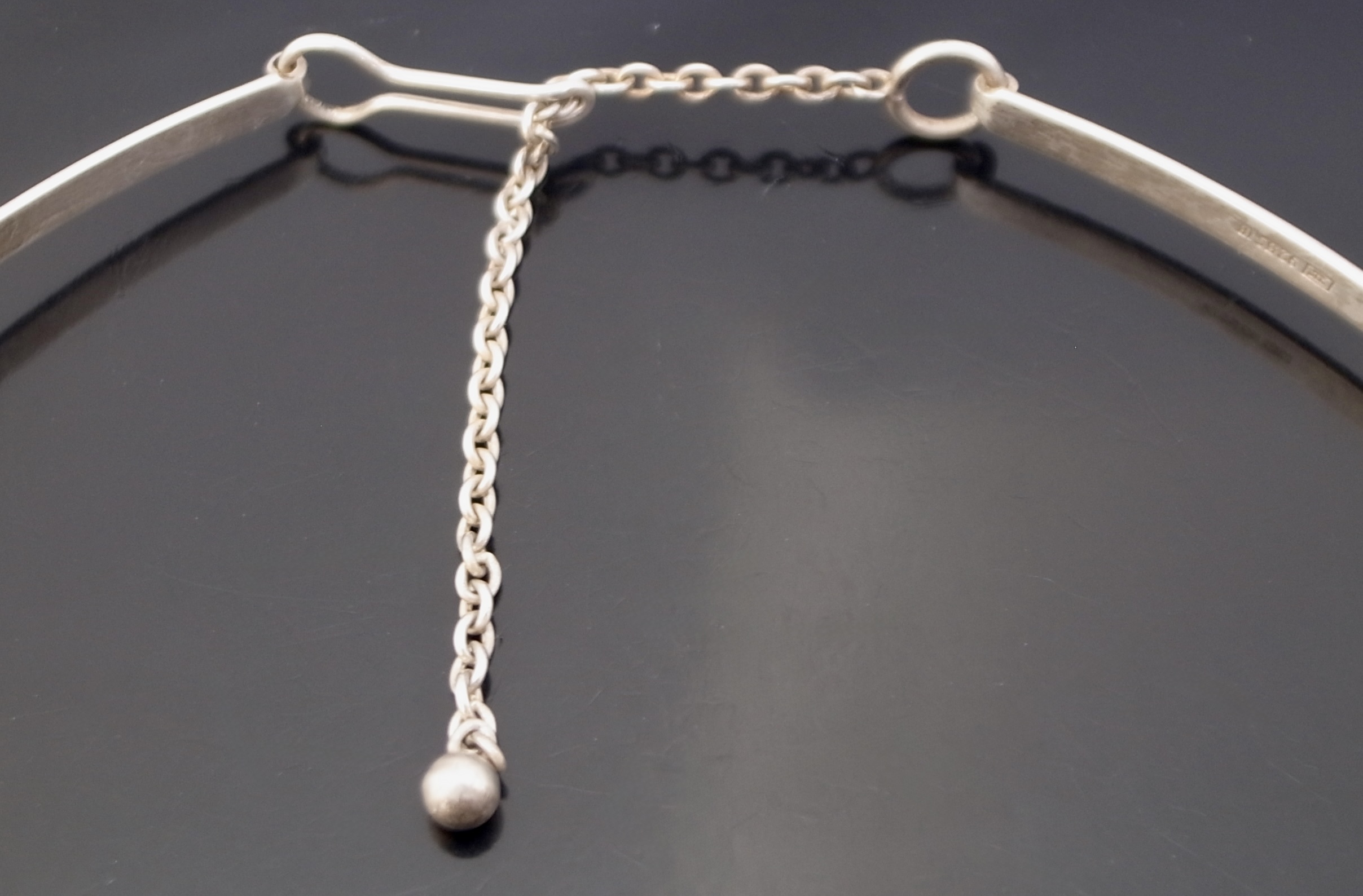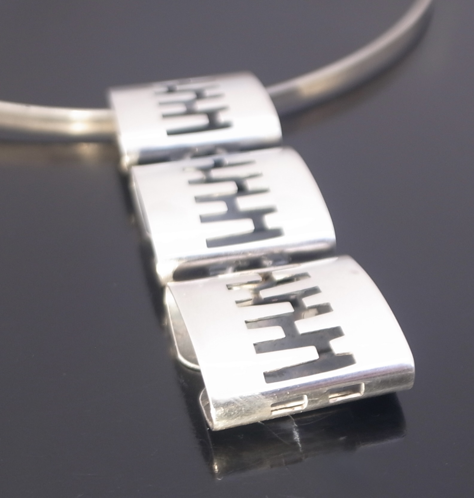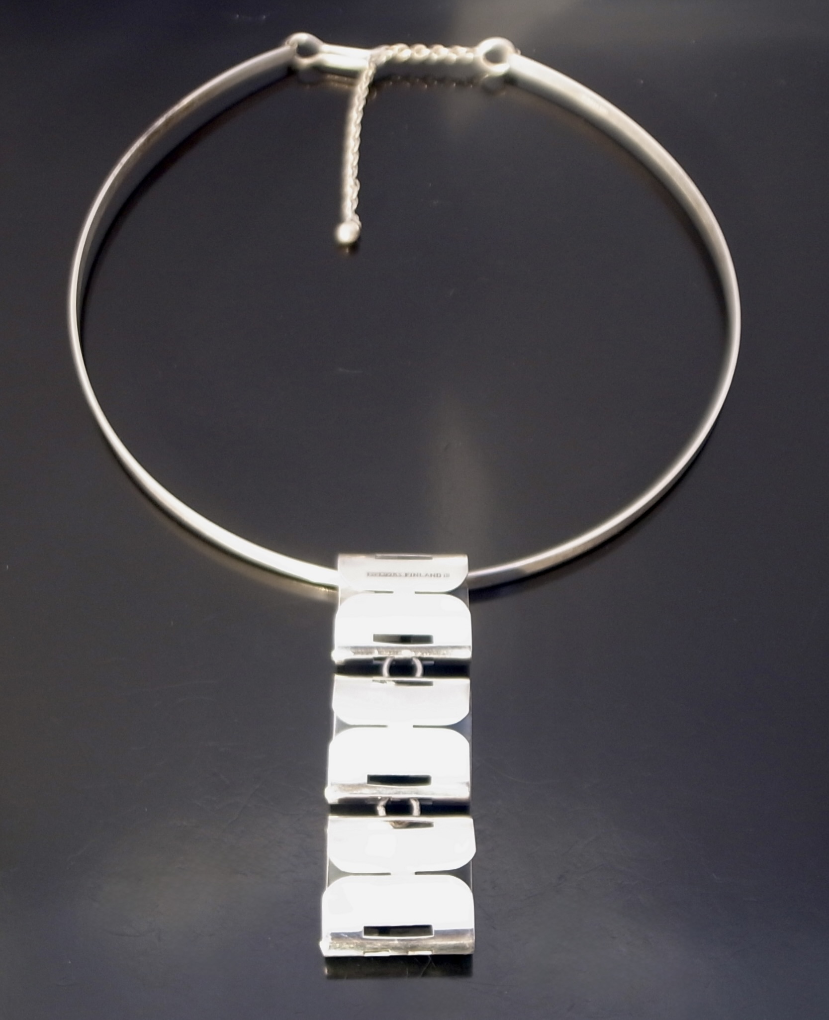 Kupittaan Kulta, silver pendant on an adjustable neck ring, Finland, circa 1970, stamped Kupittaan Kulta ‘anvil’ trade mark, ‘925S’, ‘Finland‘ and ‘IB’ for the retailer to the three part pendant and the adjustable neck ring, pendant aproximately 7 cm by 2.2 cm, (Ref S+2450)
