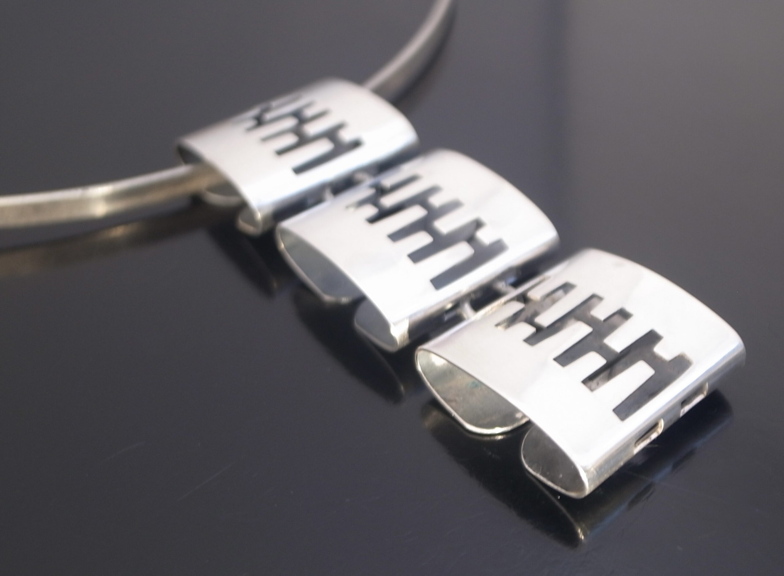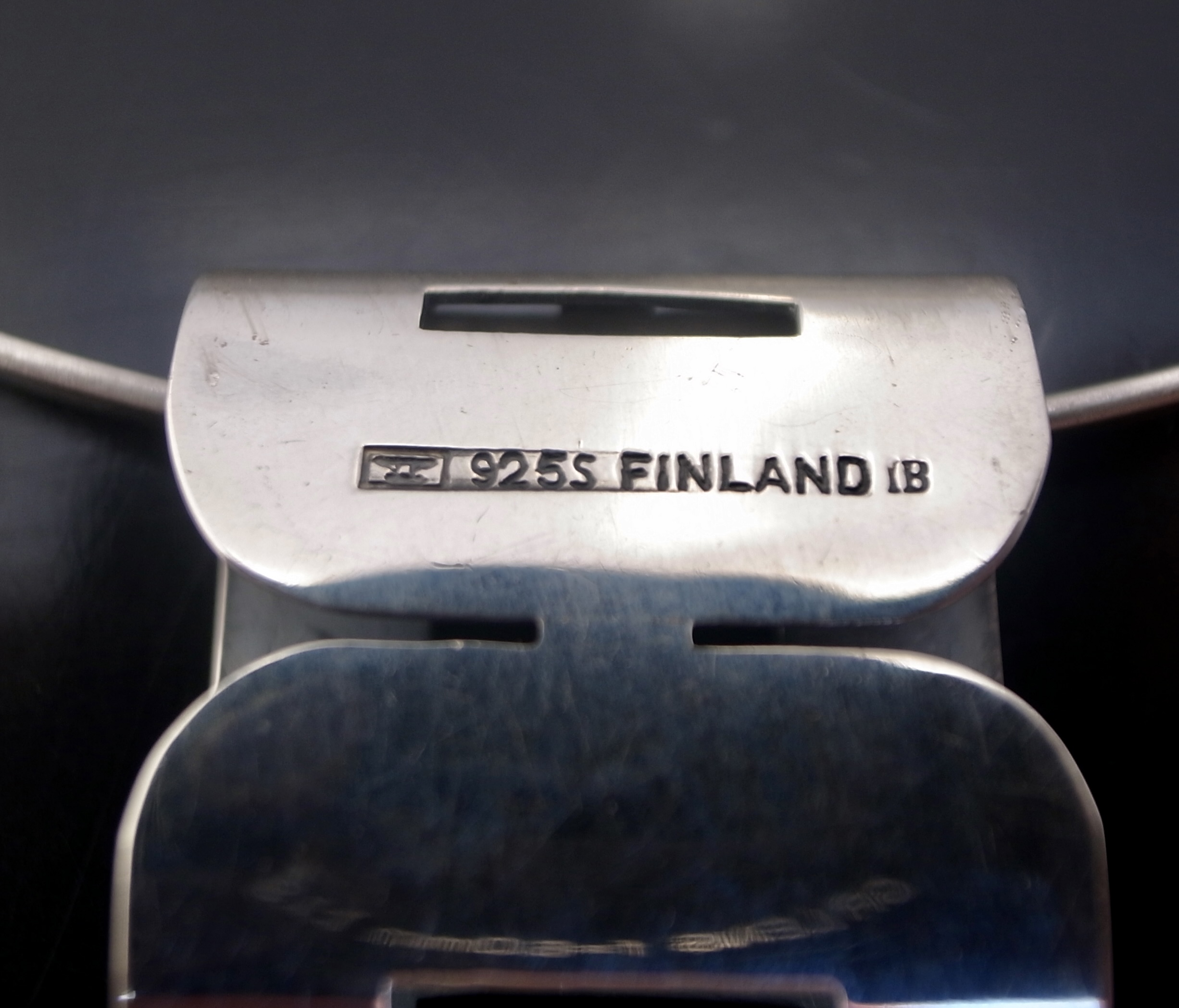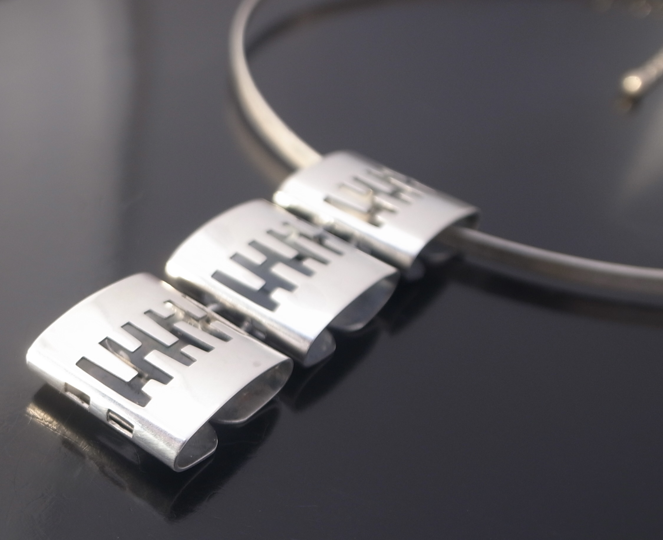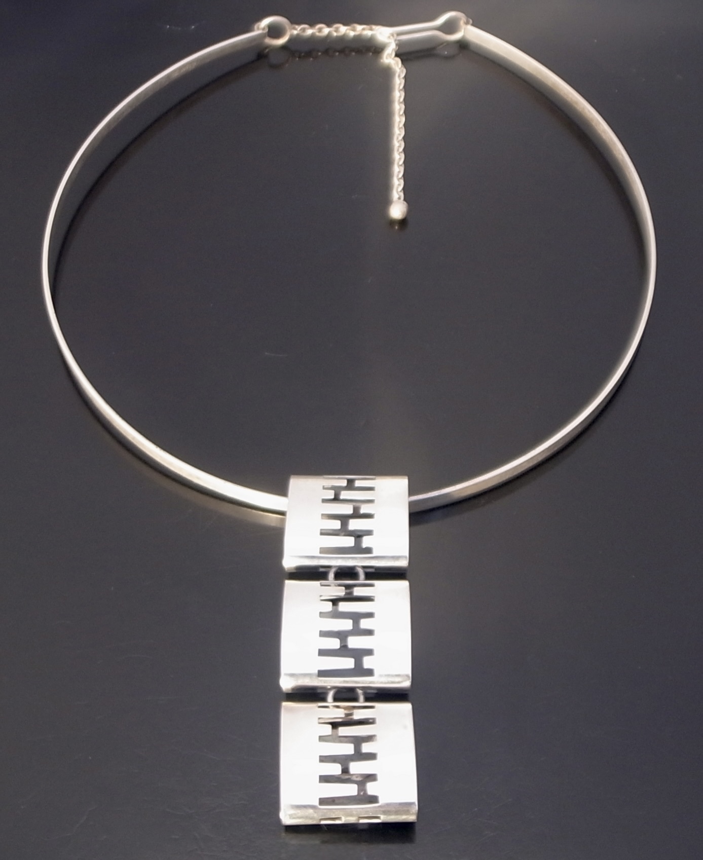 Kupittaan Kulta, silver pendant on an adjustable neck ring, Finland, circa 1970, stamped Kupittaan Kulta ‘anvil’ trade mark, ‘925S’, ‘Finland‘ and ‘IB’ for the retailer to the three part pendant and the adjustable neck ring, pendant aproximately 7 cm by 2.2 cm, (Ref S+2450)
