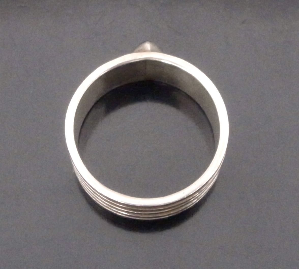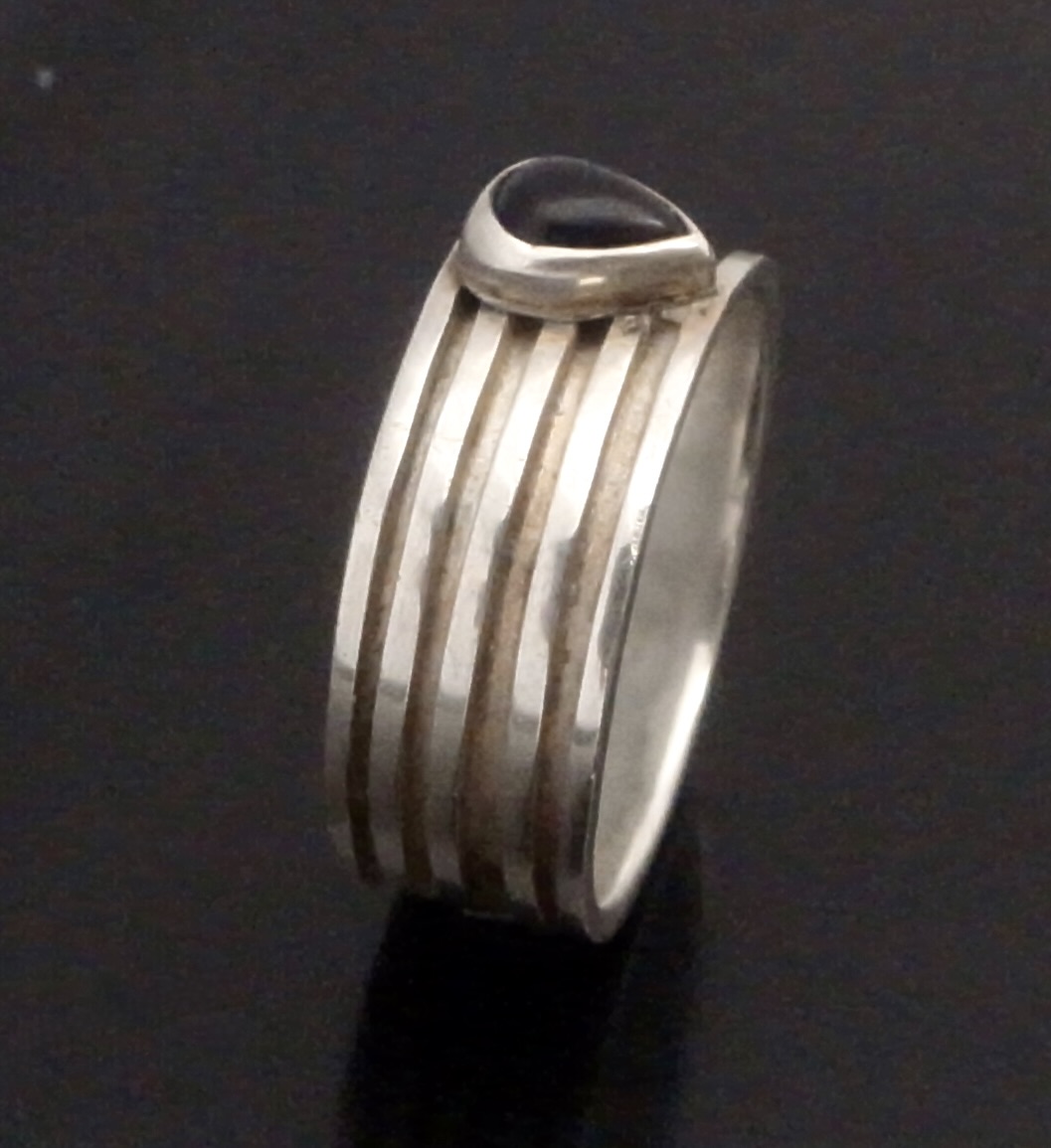 Leigh Fotheringham, an amethyst set silver ring, Edinburgh 1996, stamped ‘LMF‘ for Leigh Fotheringham, the makers mark is inverted to the hallmark, the tear shaped dark amethyst collet set to a reeded band of approximately 9 mm in width and finger size X 1/2, inner diameter approximately 21.5 mm (Ref S+2351) SOLD