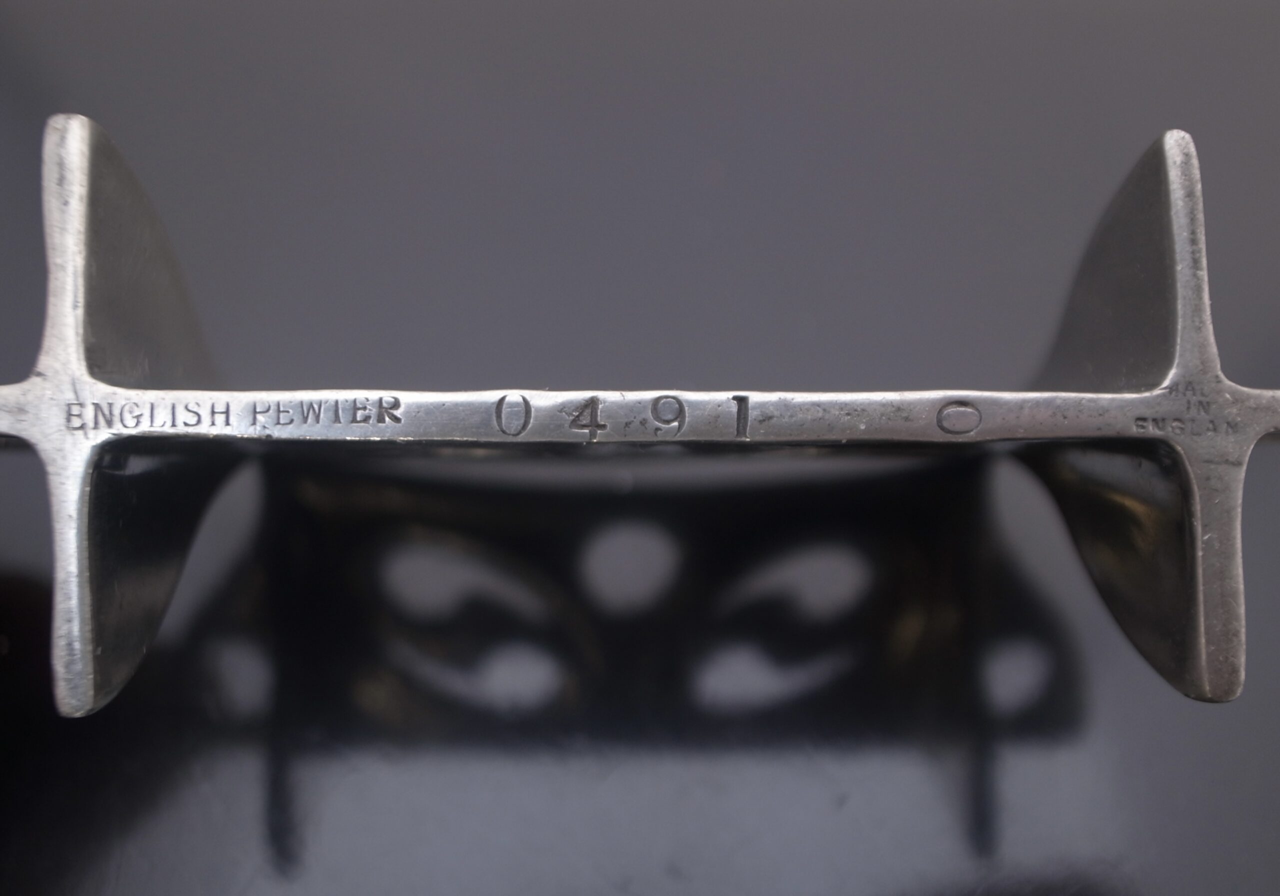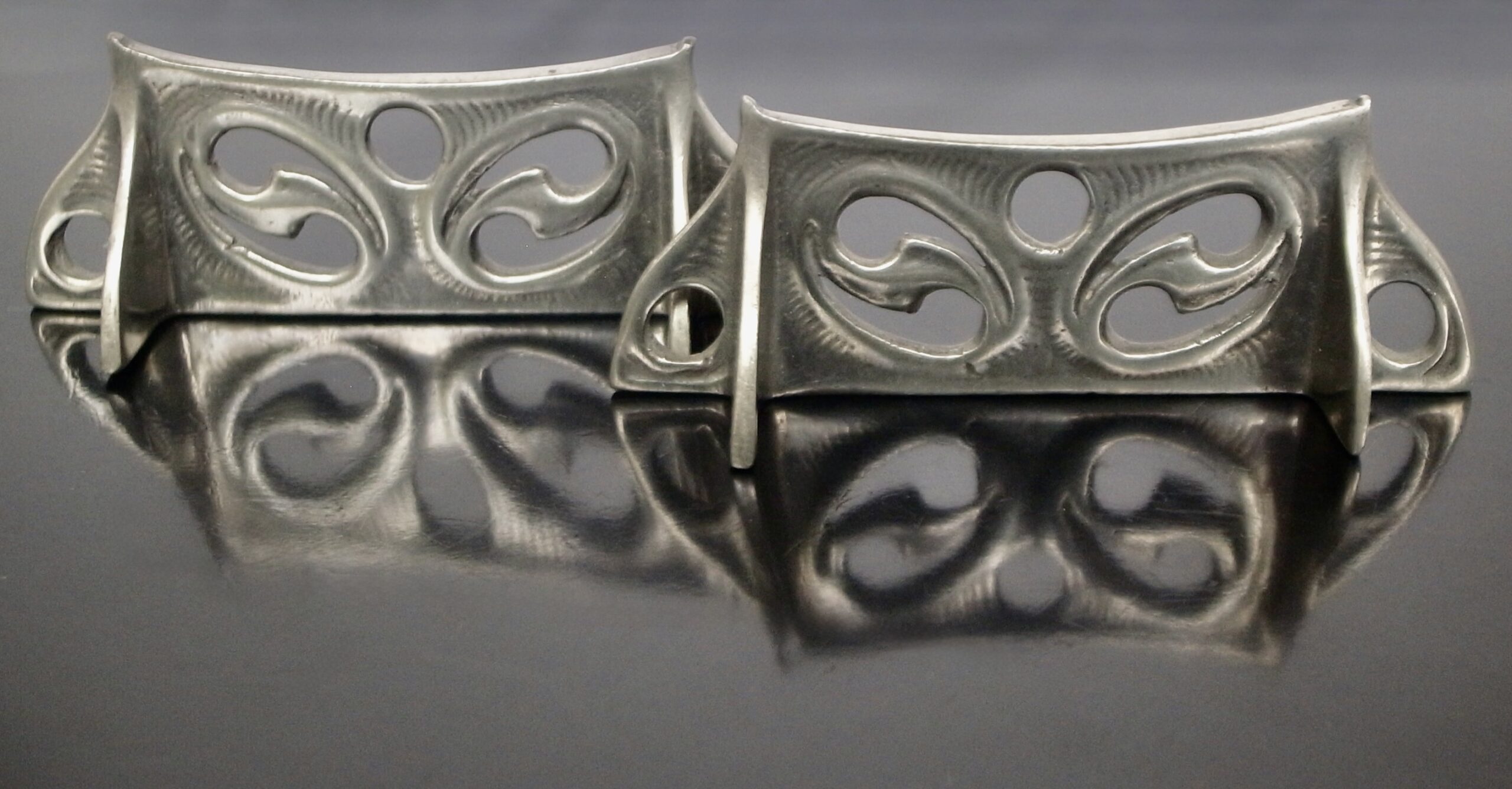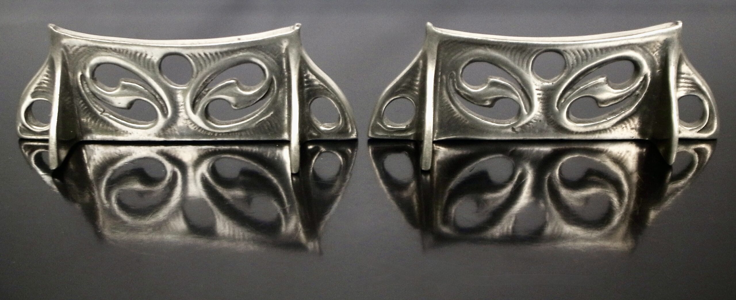 Liberty & Co, a pair of Art Nouveau pewter knife rests, circa 1904, stamped ‘English Pewter’, ‘0491’, and ‘Made in England’, 8.3 cm long and 3 cm high (Ref S+2443)