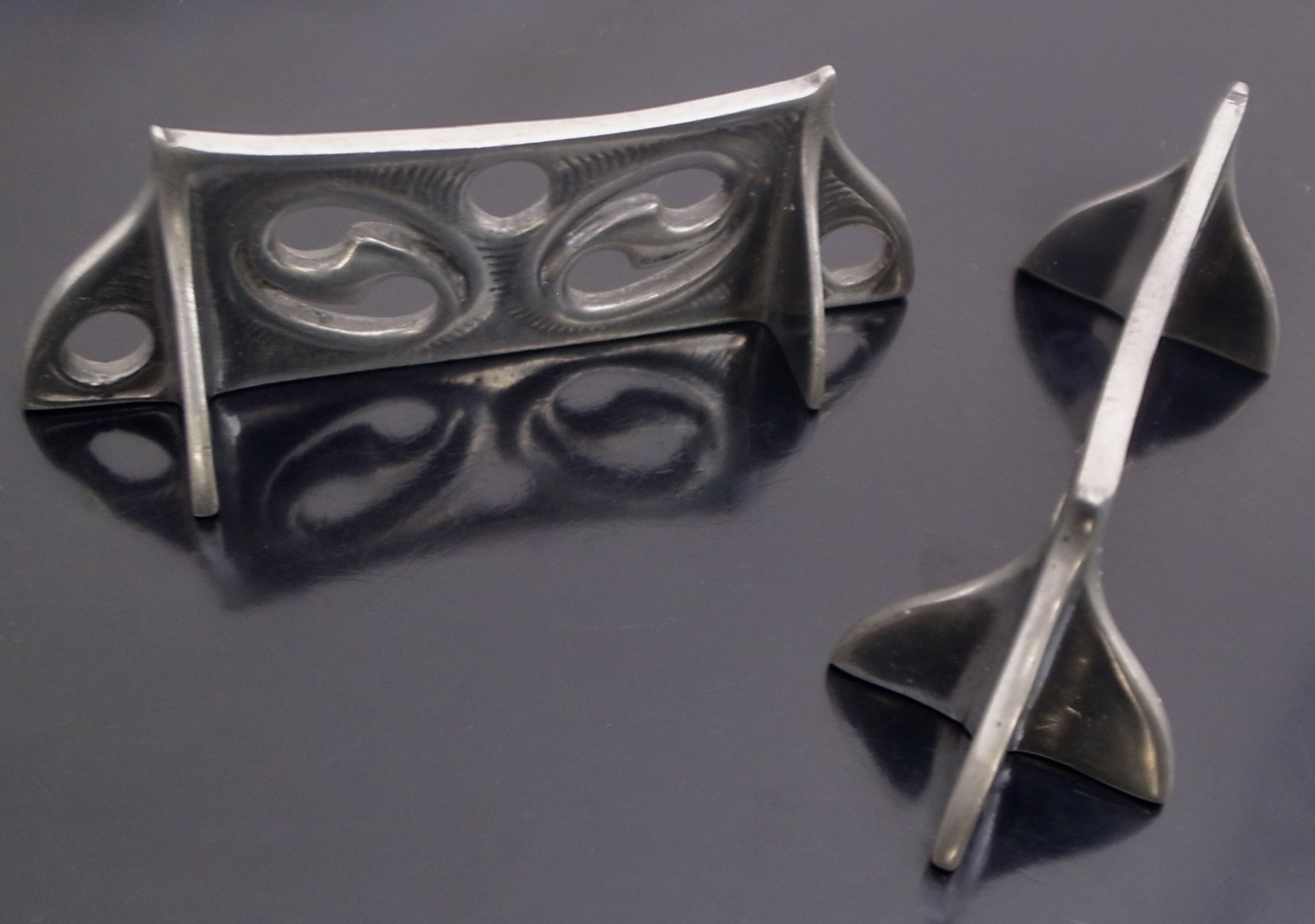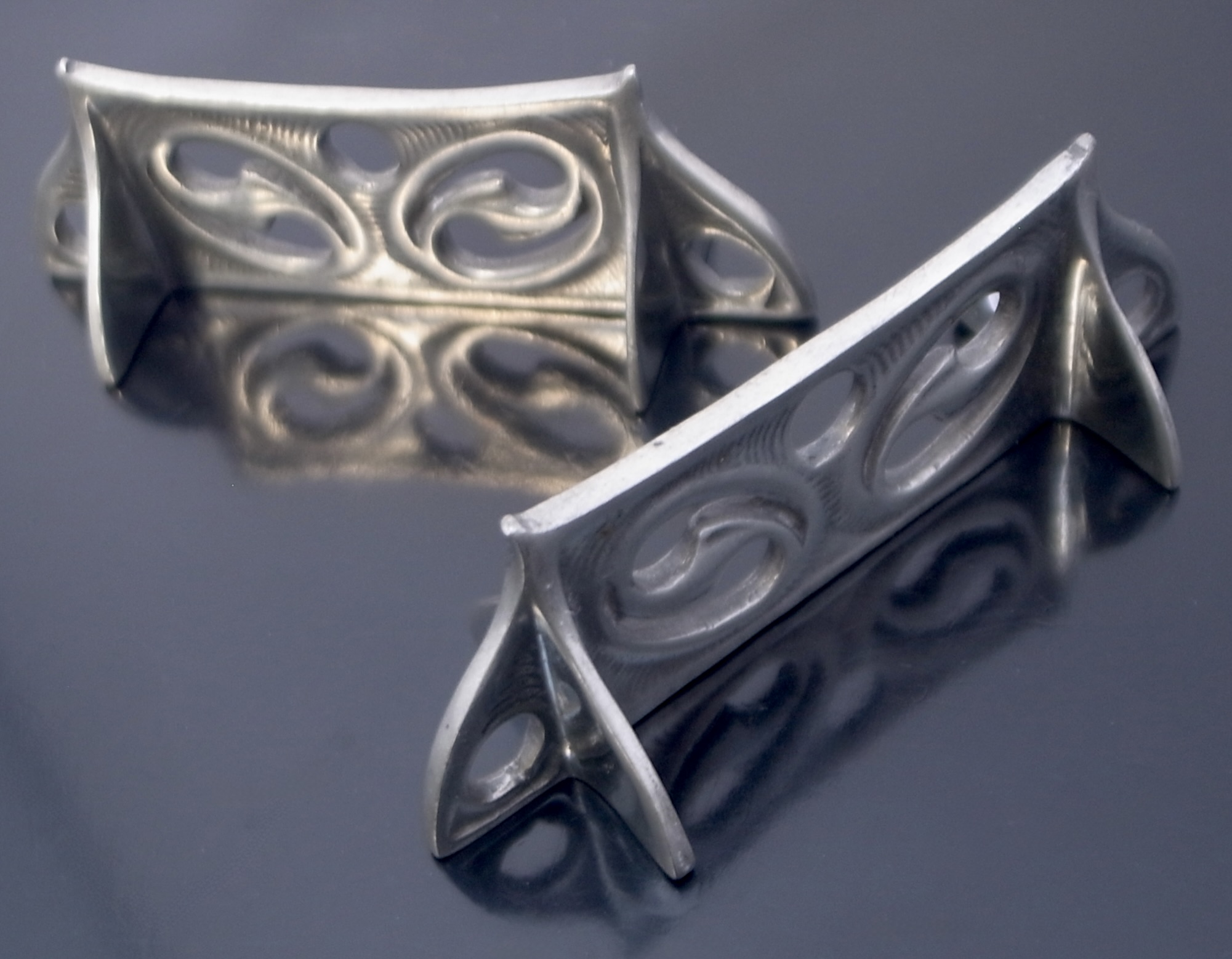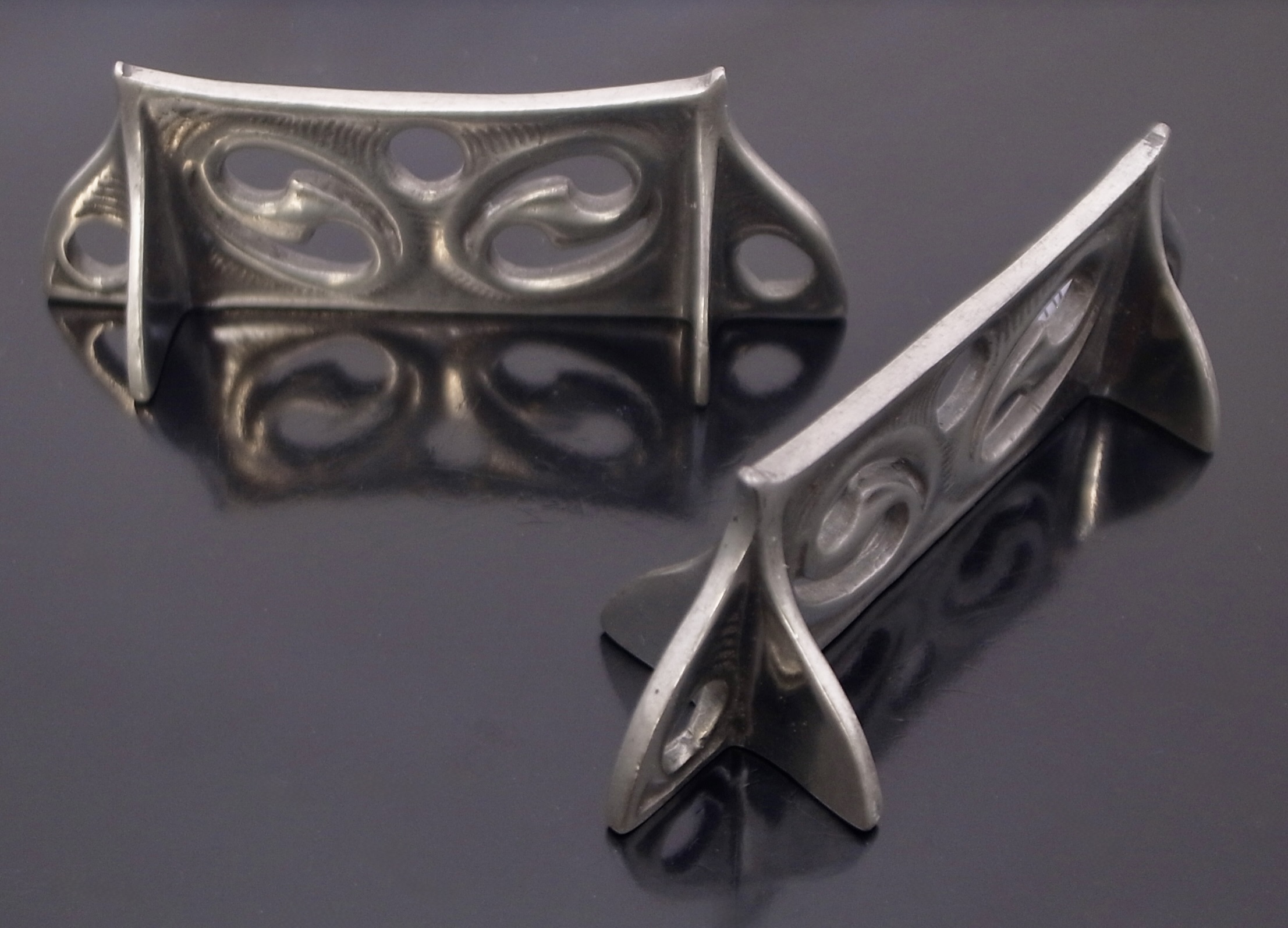 Liberty & Co, a pair of Art Nouveau pewter knife rests, circa 1904, stamped ‘English Pewter’, ‘0491’, and ‘Made in England’, 8.3 cm long and 3 cm high (Ref S+2443)