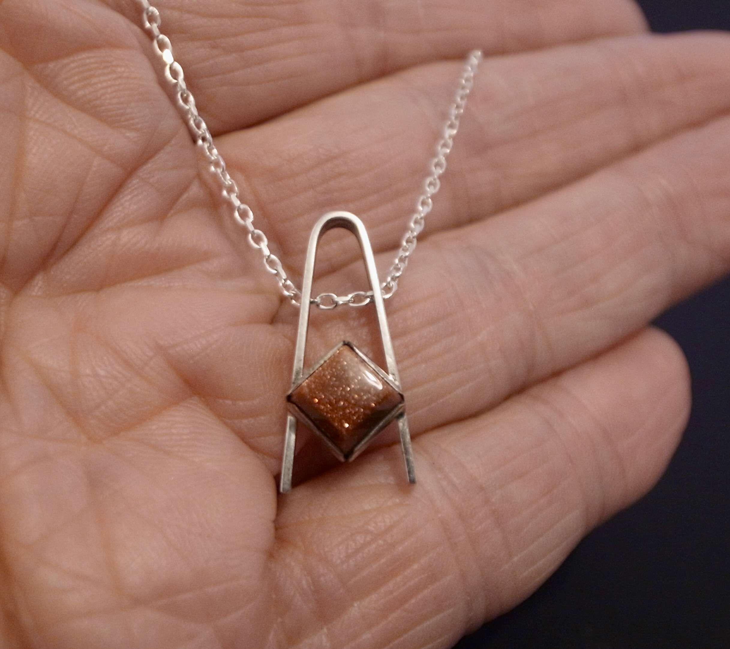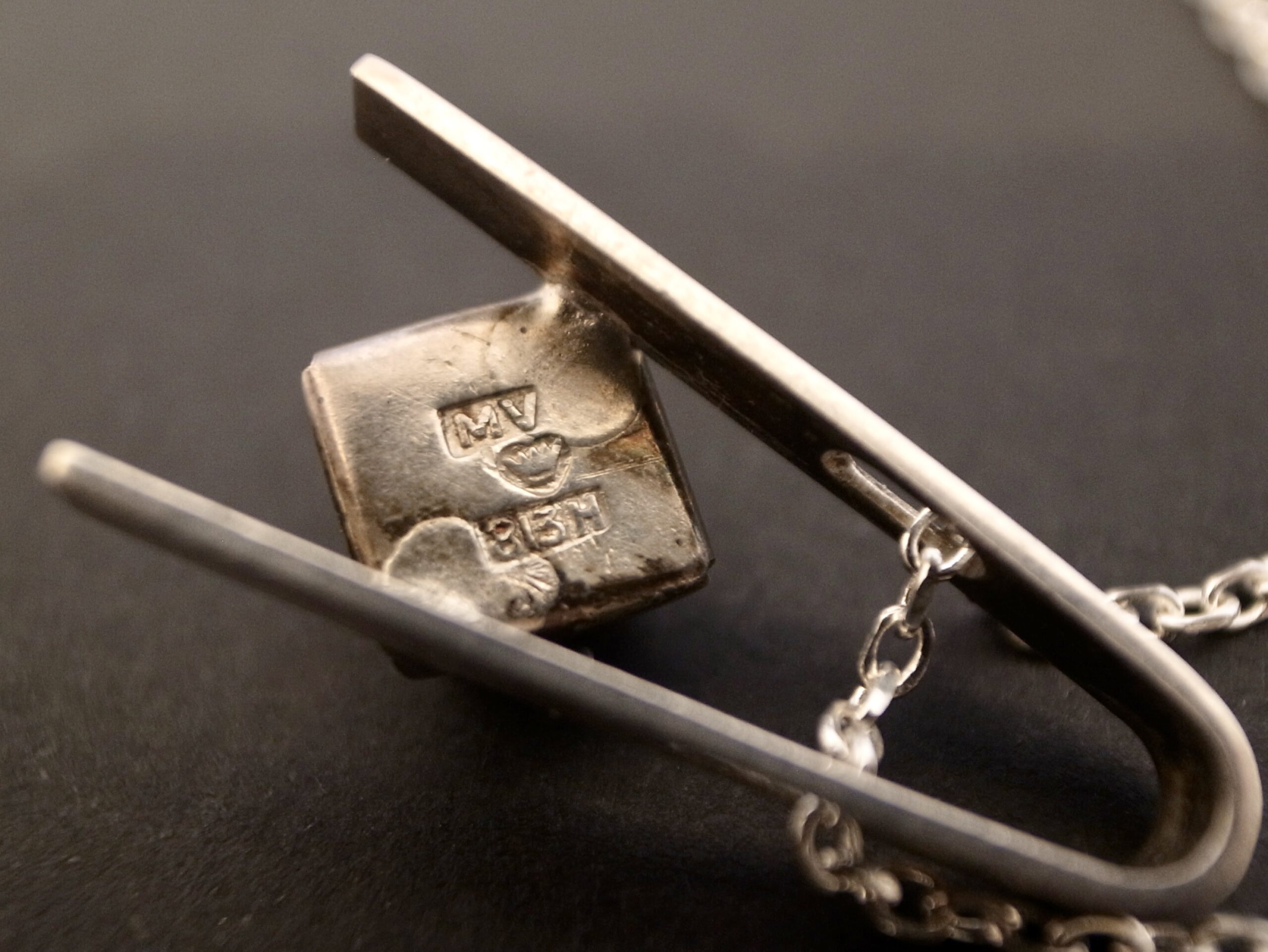 Martti Viikinniemi, a goldstone set 813 standard silver pendant on a chain, Finland, circa 1975, stamped ‘MV‘ for Martti Viikinniemi, ‘813H’ and Crown mark for Finland, the 5 mm square goldstone to a V shaped mount 2.3 cm long and 1.1 cm at the widest point, on a new sterling silver chain, 50 cm long (Ref S+2507)