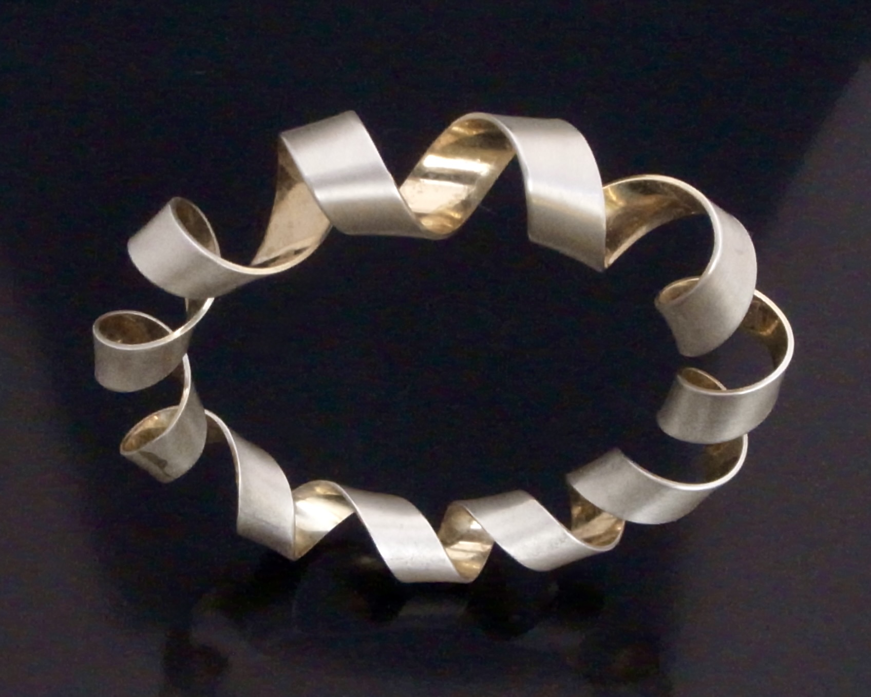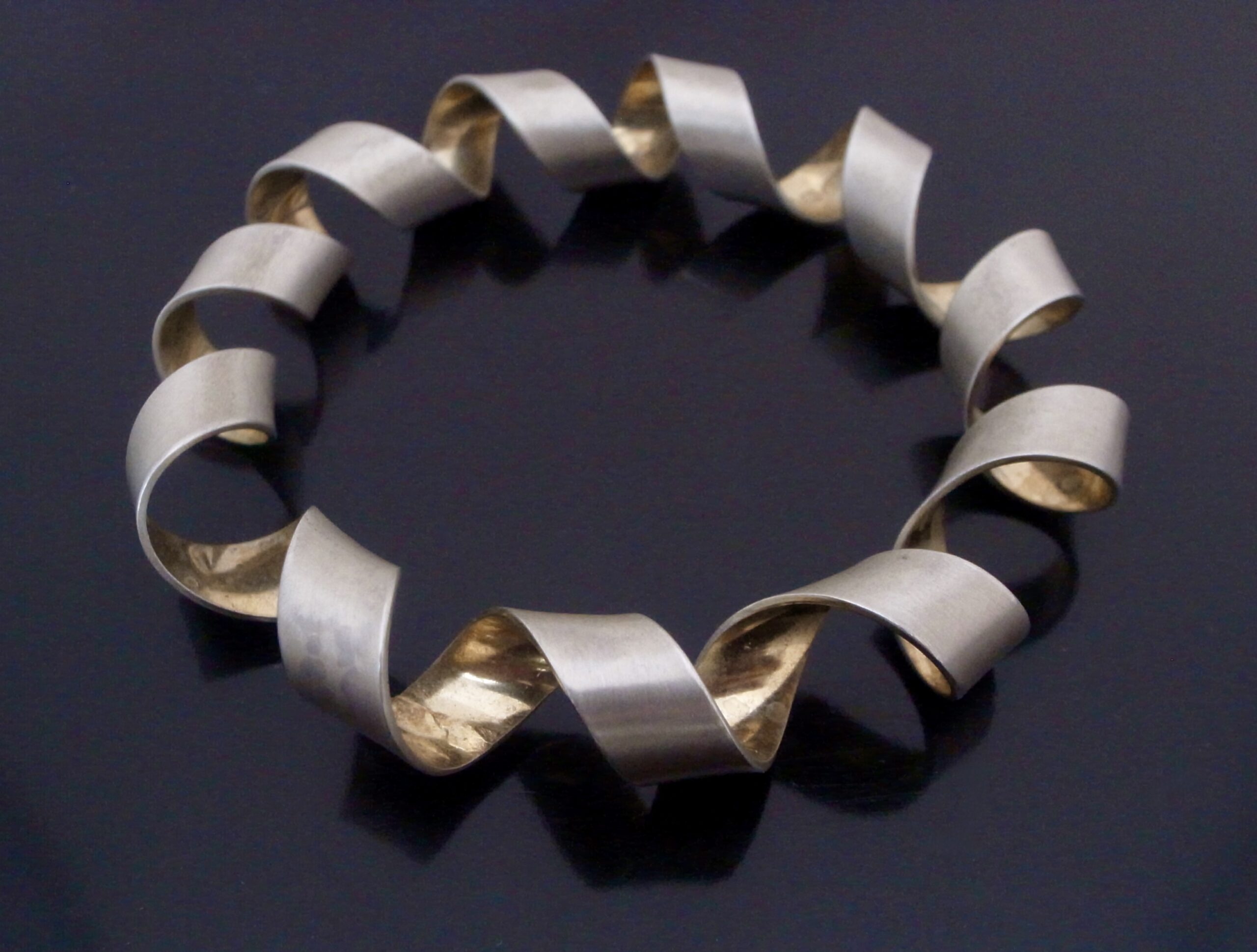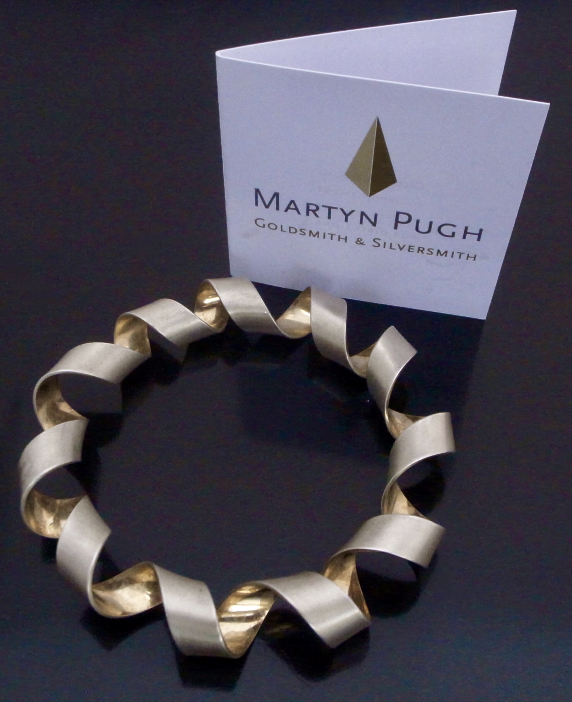 Martyn Pugh, a silver and silver gilt Coil Bangle, Birmingham, circa 2000, stamped ‘MJP‘ for Martyn Pugh, the bangle is formed by a coil of silver with a gold plated interior, approximately 6 cm diameter, with card box and business card (Ref S+2347) SOLD