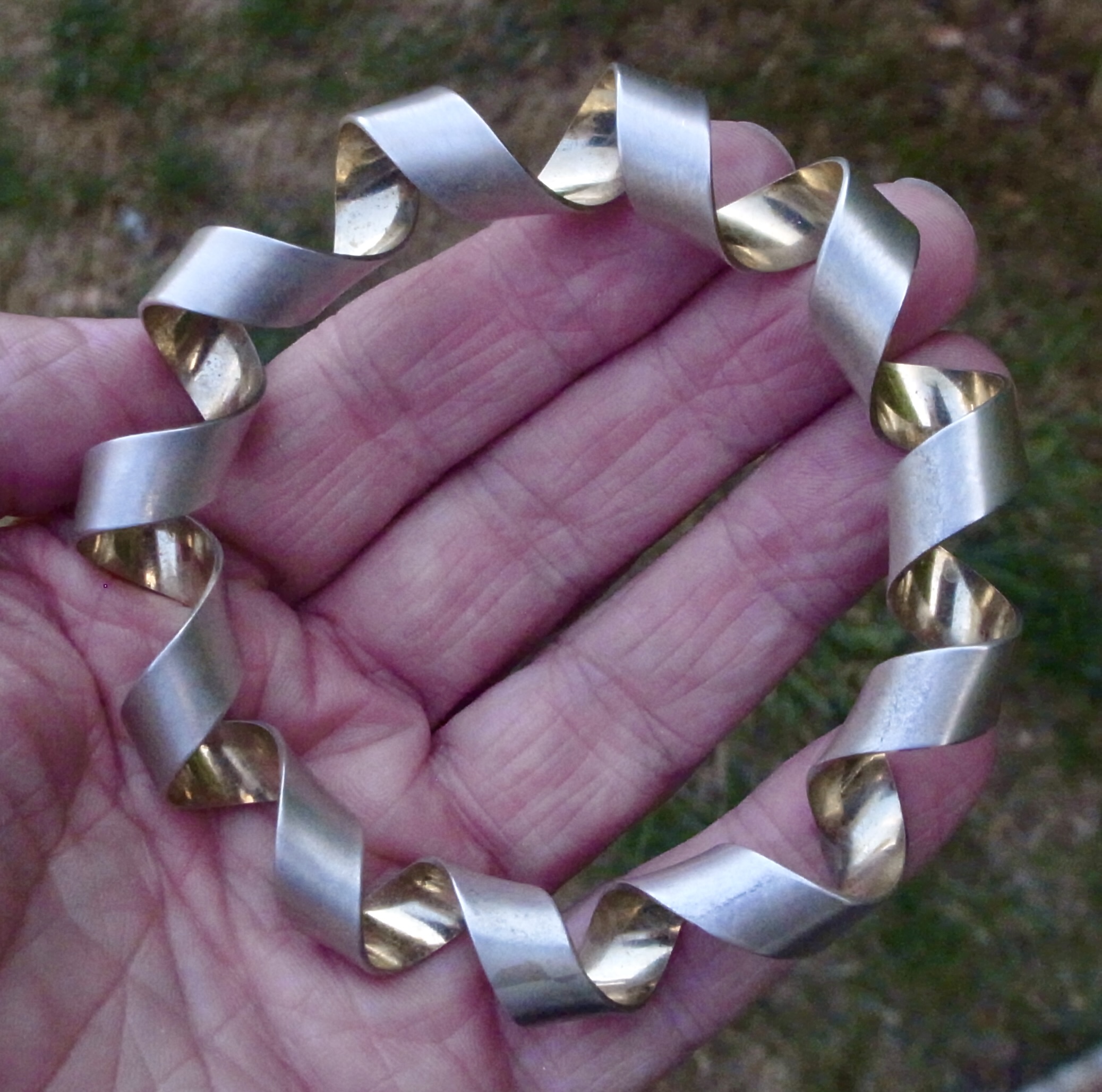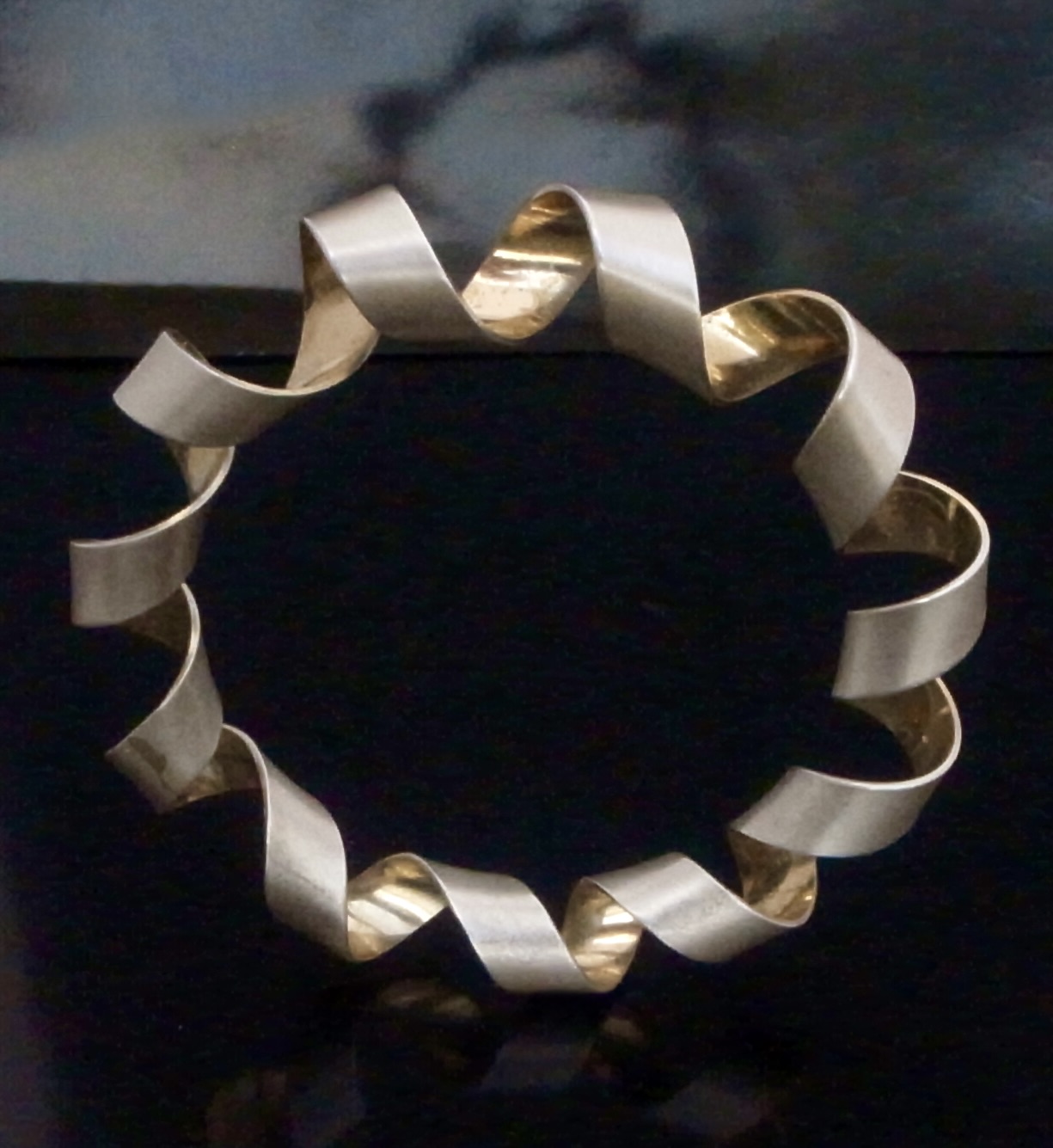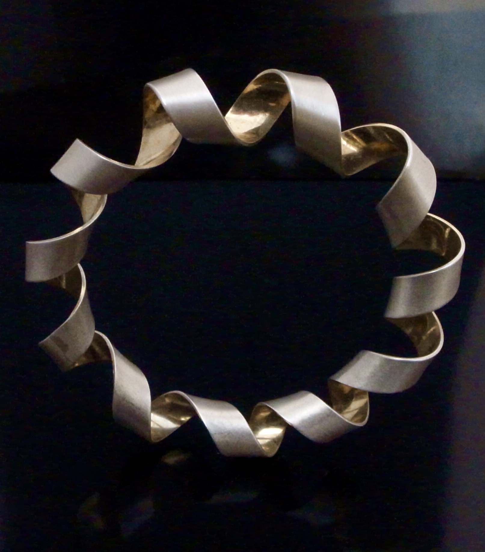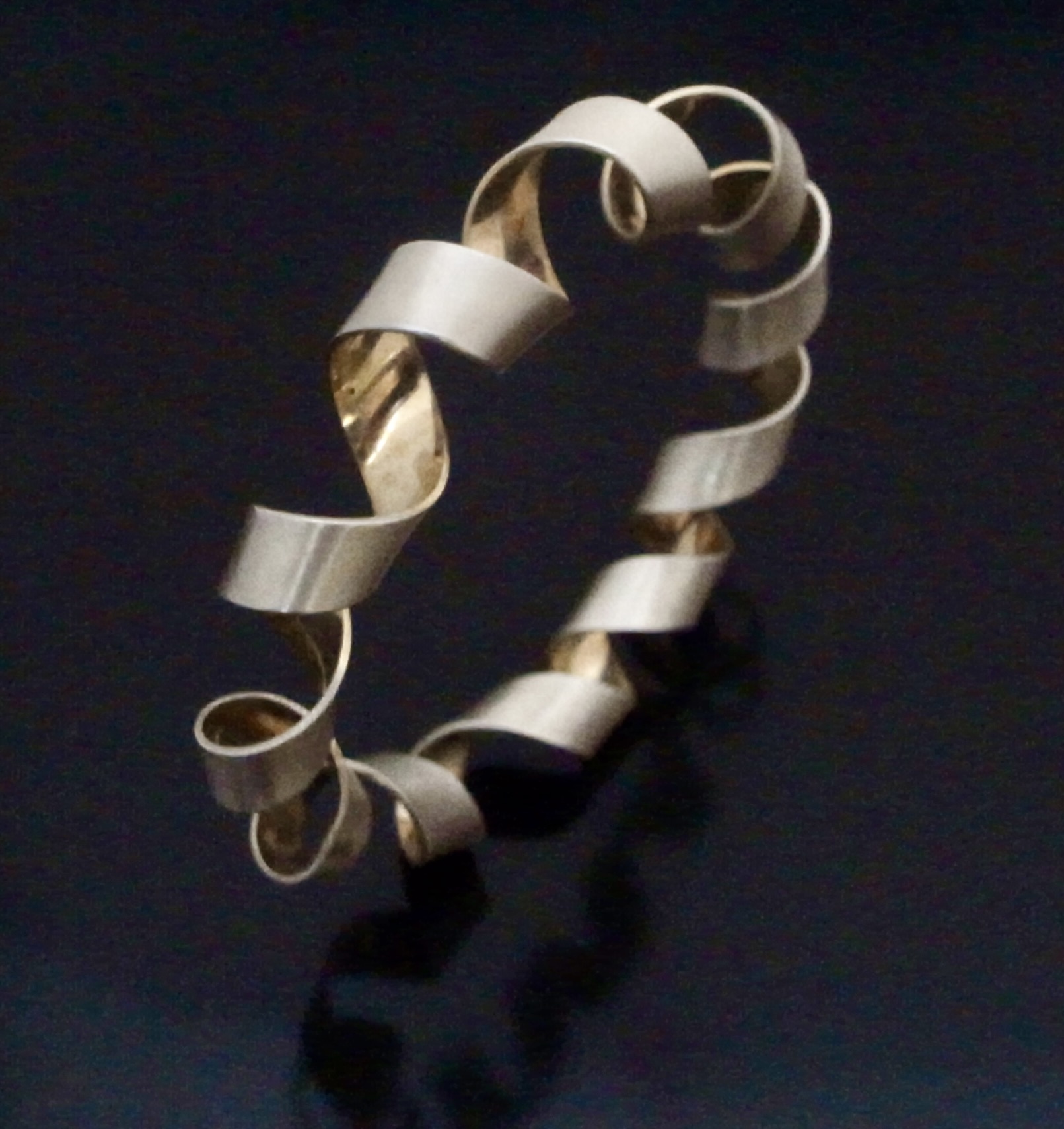 Martyn Pugh, a silver and silver gilt Coil Bangle, Birmingham, circa 2000, stamped ‘MJP‘ for Martyn Pugh, the bangle is formed by a coil of silver with a gold plated interior, approximately 6 cm diameter, with card box and business card (Ref S+2347) SOLD