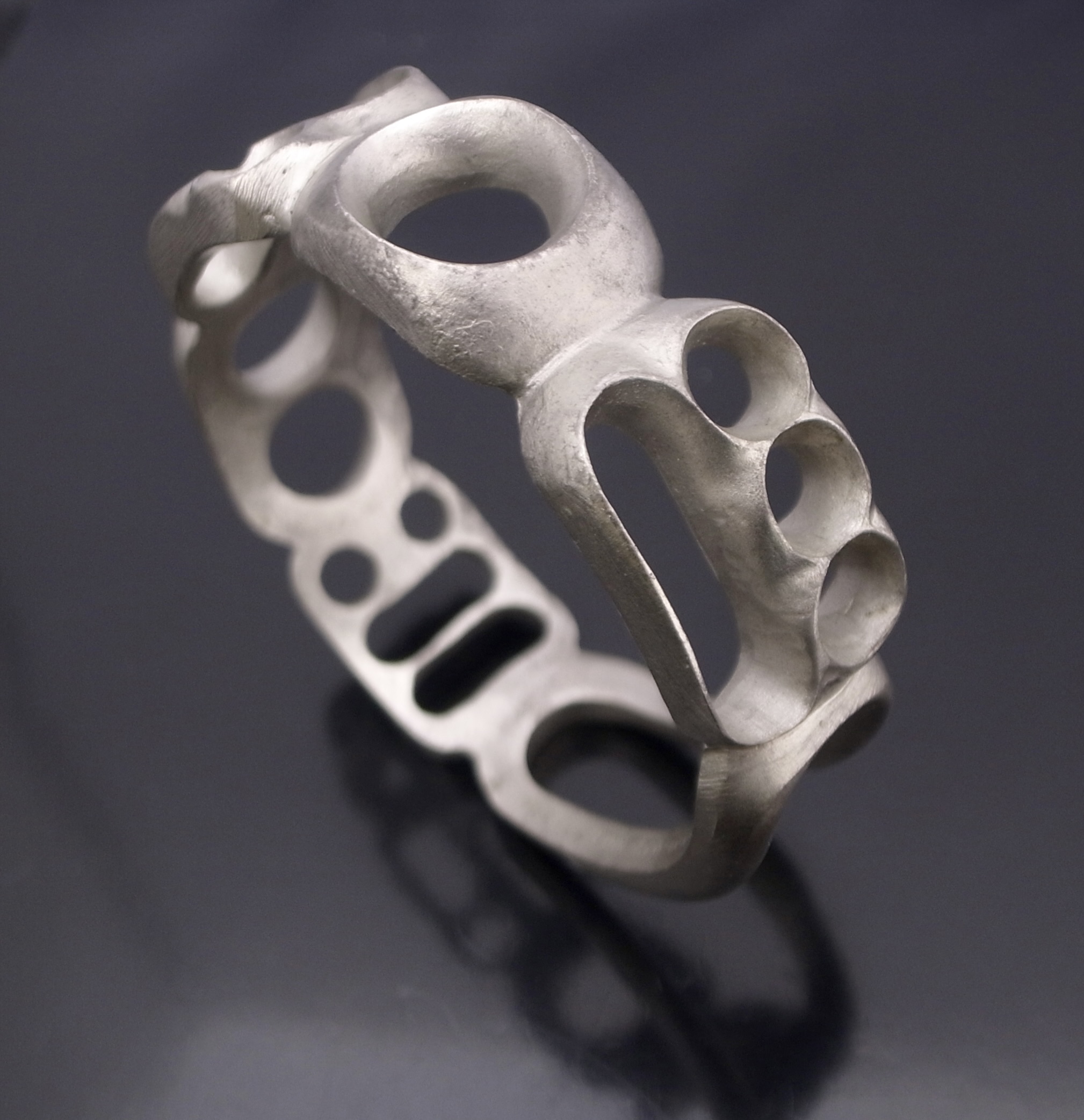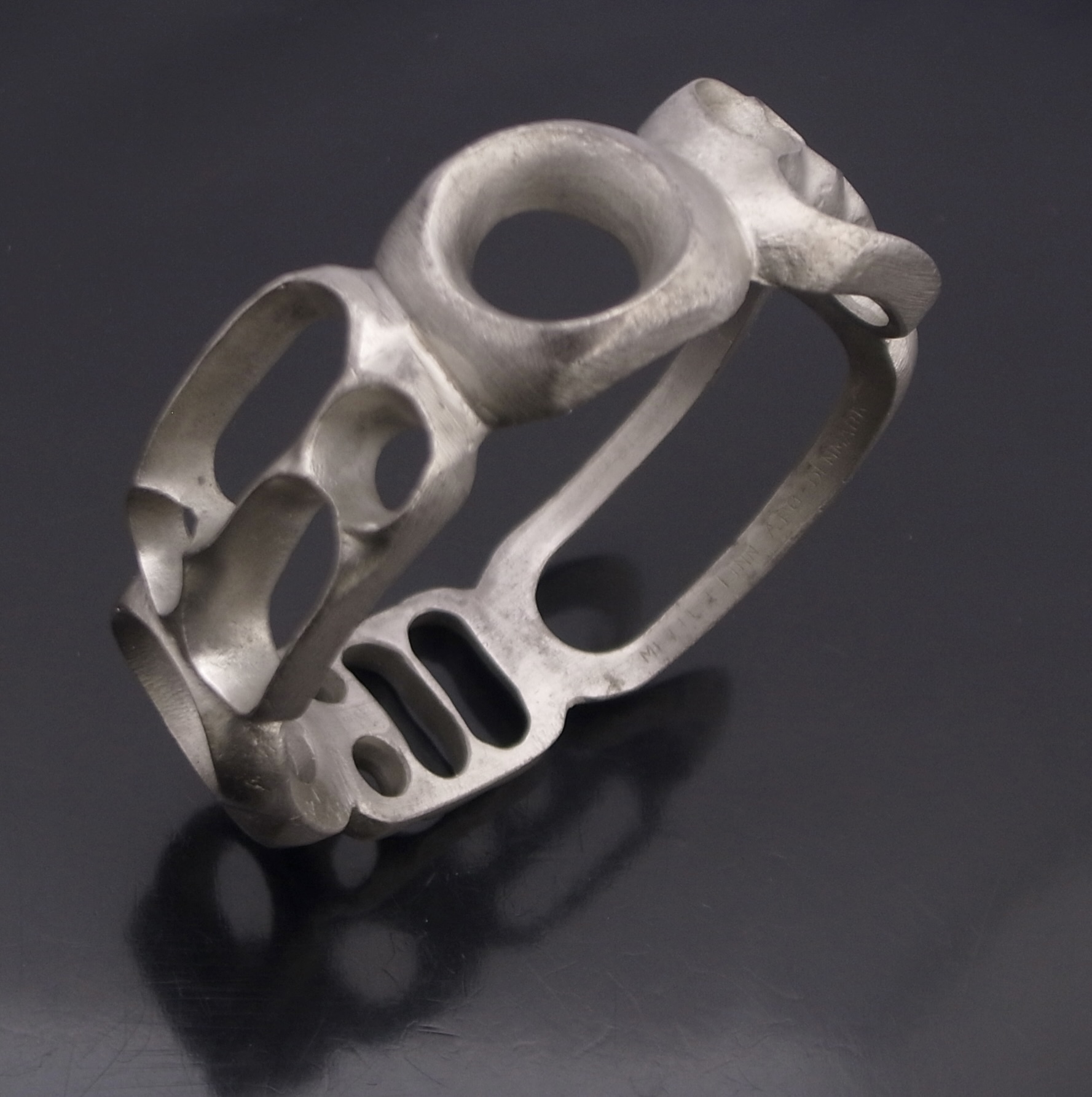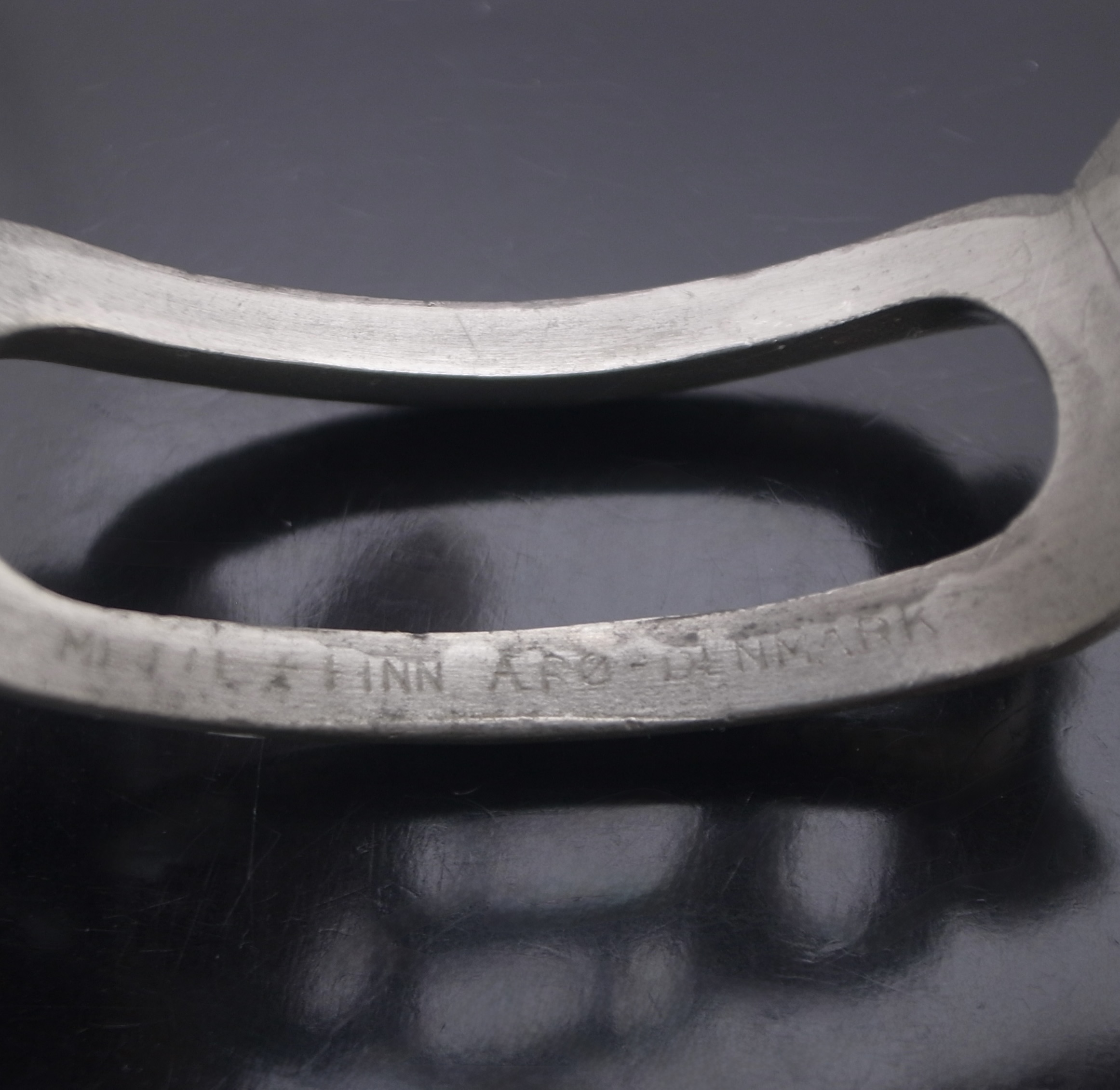 Mette + Finn, a heavy pewter modernist bangle, Denmark, circa 1970, indistinctly stamped ‘Mette + Finn‘, ‘Arø‘ and ‘Denmark‘, approximately 2.2 cm wide and 6.4 cm internal diameter (Ref S+2543) SOLD