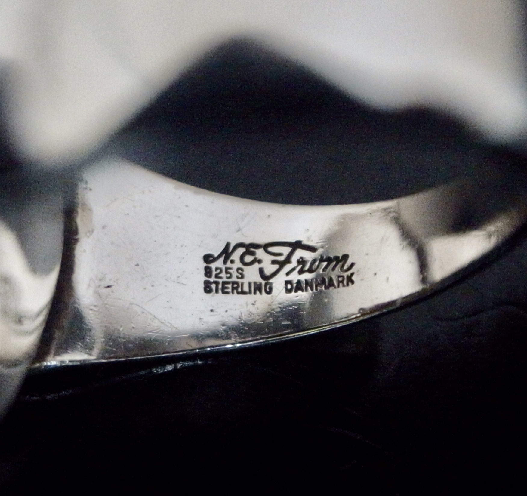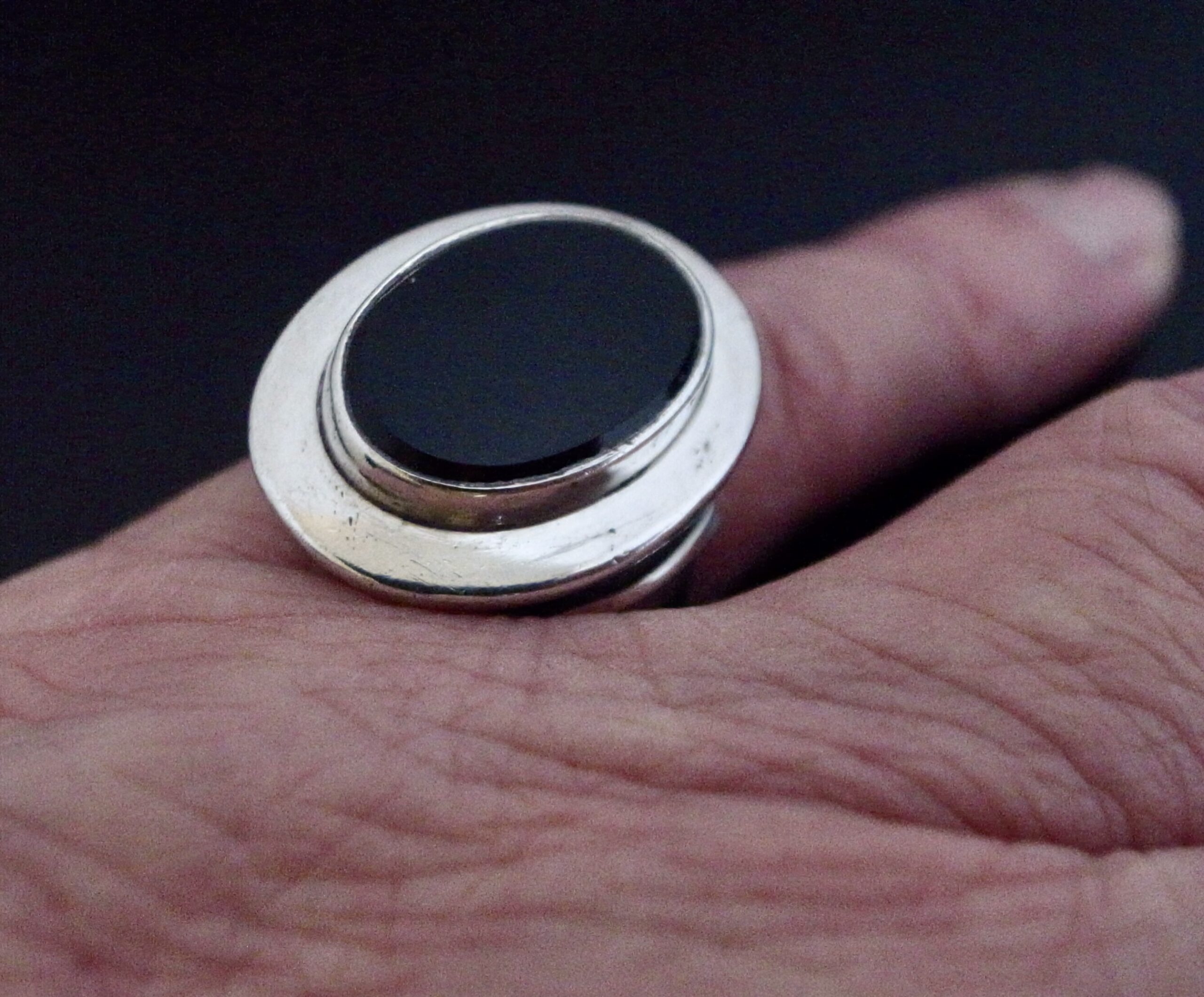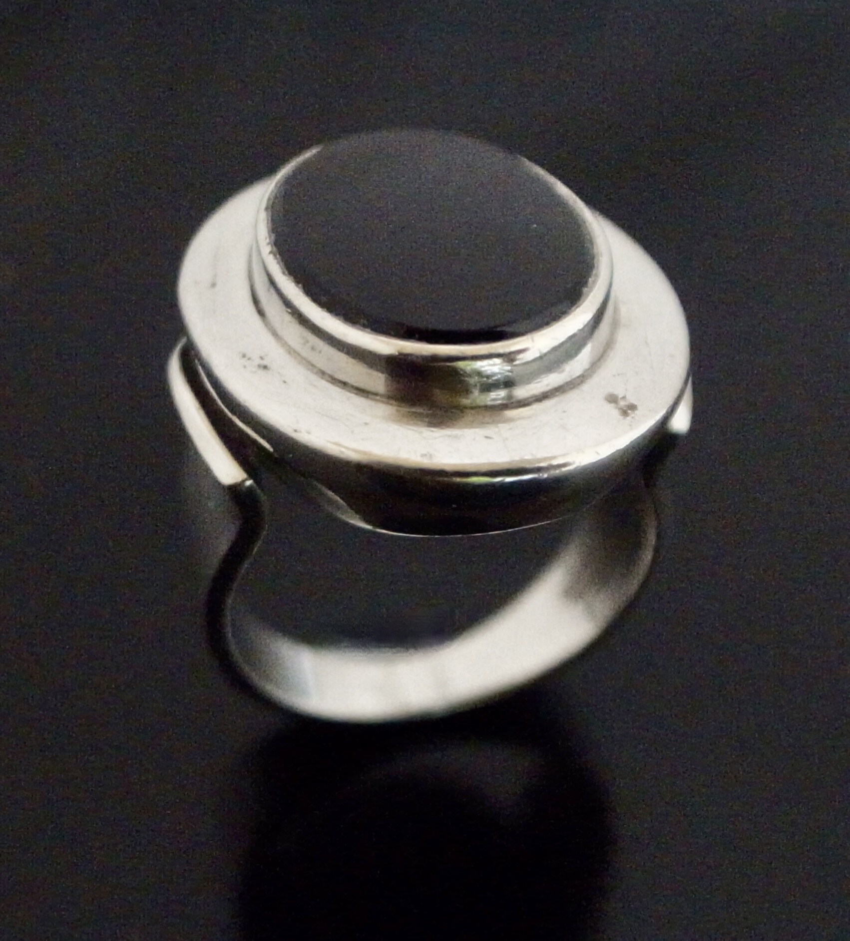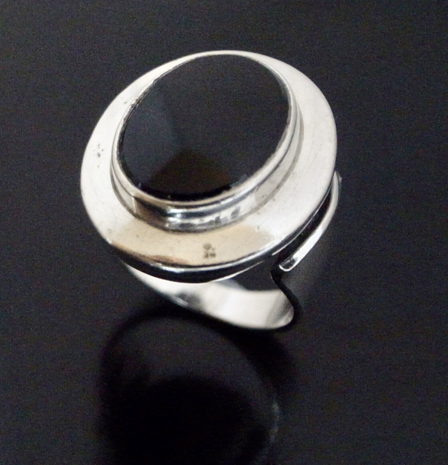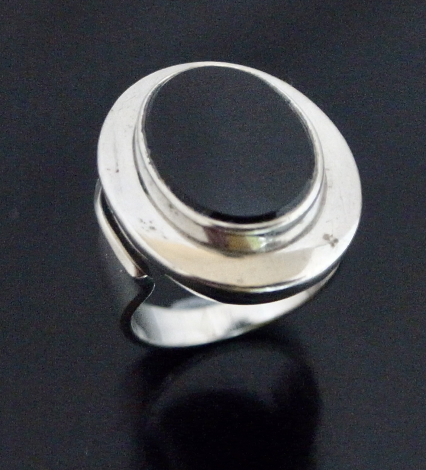 Niels Erik From, a black onyx set silver ring, Denmark, circa 1980, stamped ‘N E From‘, ‘Danmark‘, ‘Sterling’ and ‘925S, the oval onyx approximately 14.5 mm by 11 mm, finger size O, inner diameter approximately 17.7 mm (Ref S+2142)