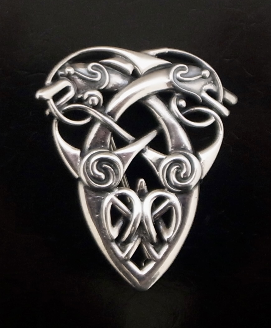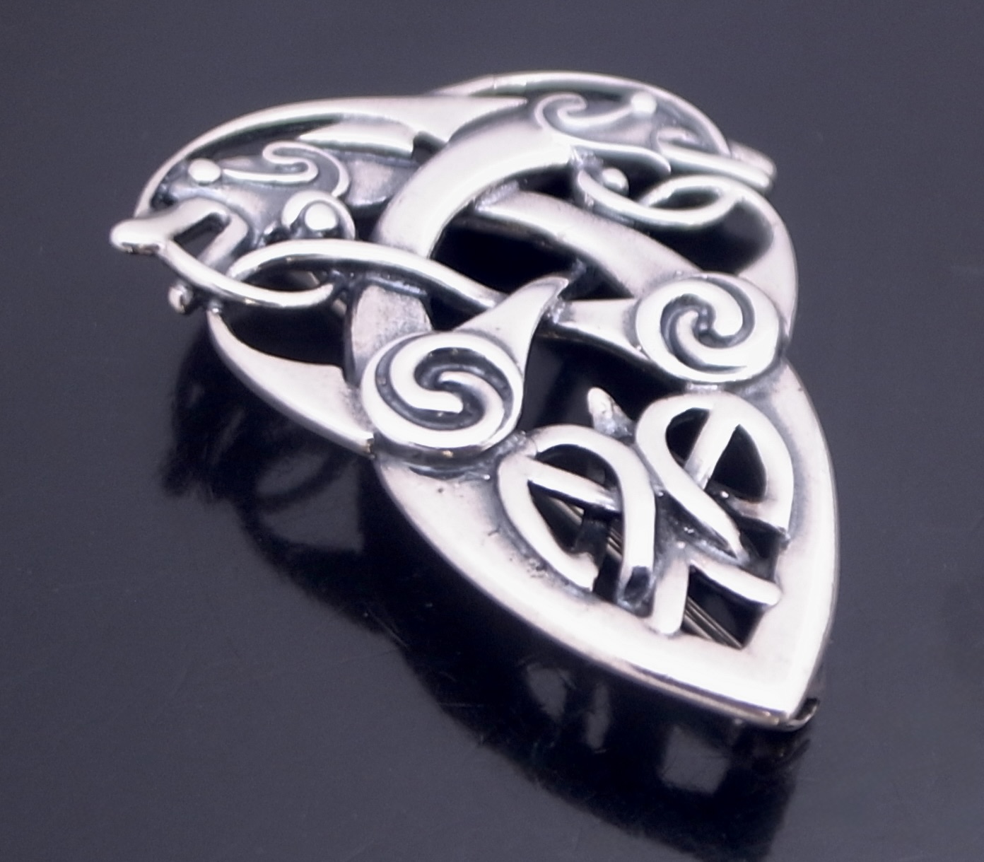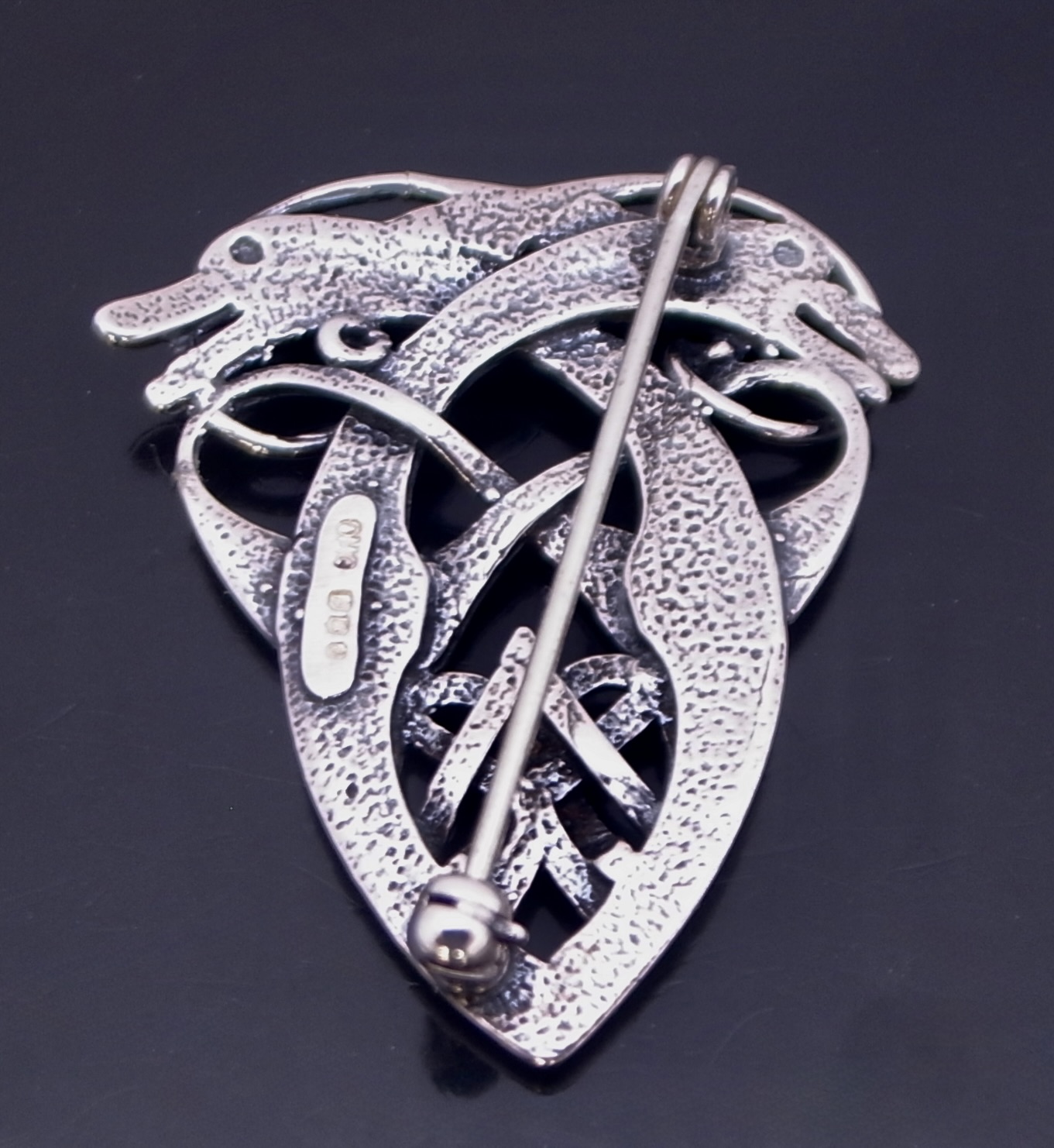 Ola Gorie, a silver Celtic dogs brooch, Edinburgh 1988, makers mark ‘OMG‘ for Ola Gorie, approximately 3.7 cm long by 3.3 cm at widest point (Ref S+2438)