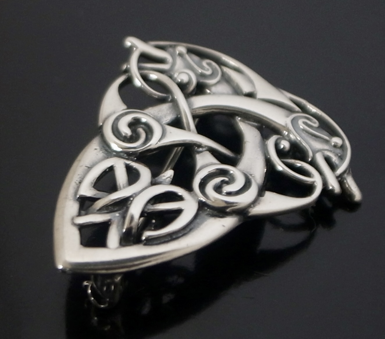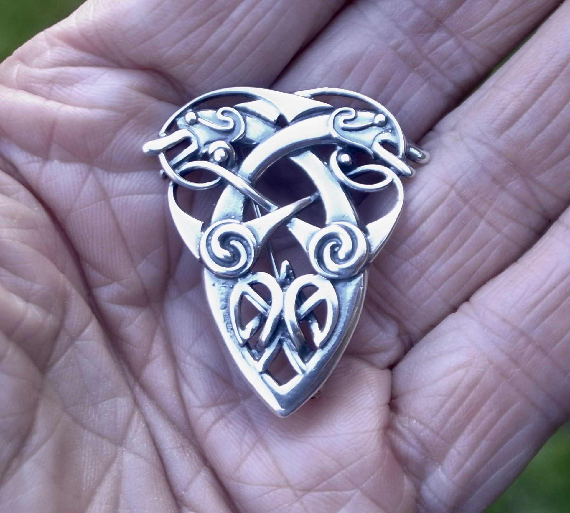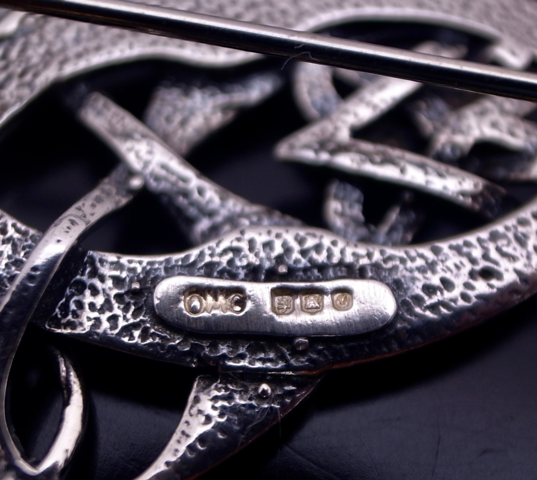 Ola Gorie, a silver Celtic dogs brooch, Edinburgh 1988, makers mark ‘OMG‘ for Ola Gorie, approximately 3.7 cm long by 3.3 cm at widest point (Ref S+2438)
