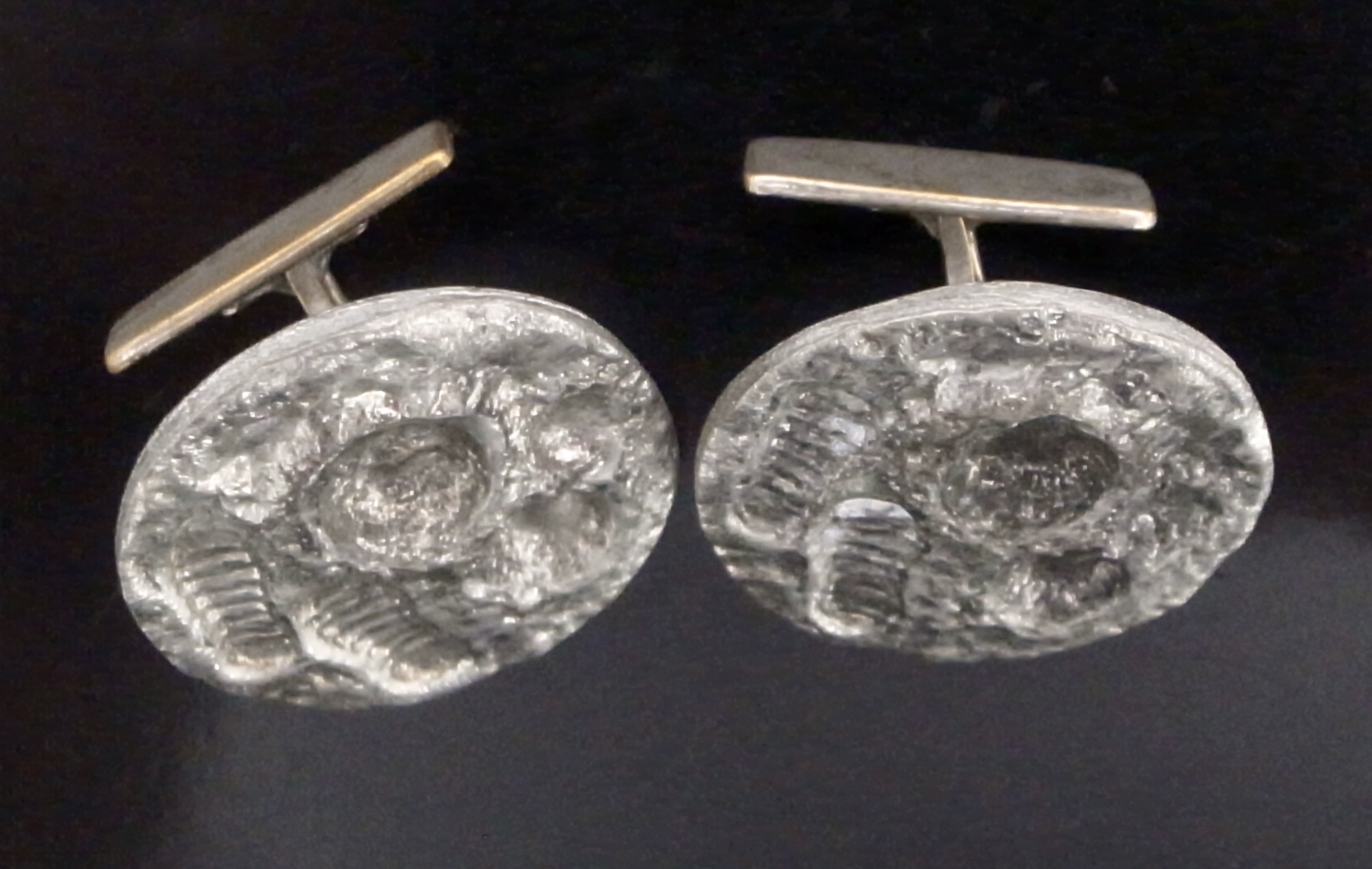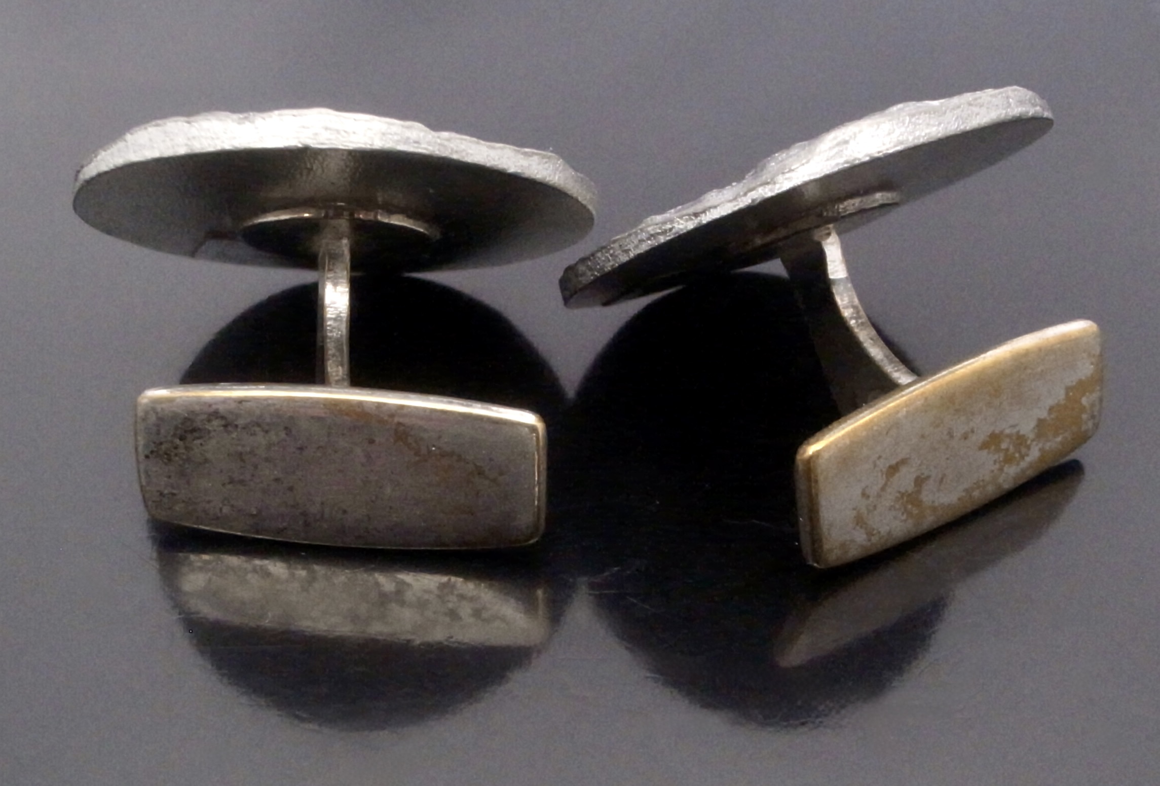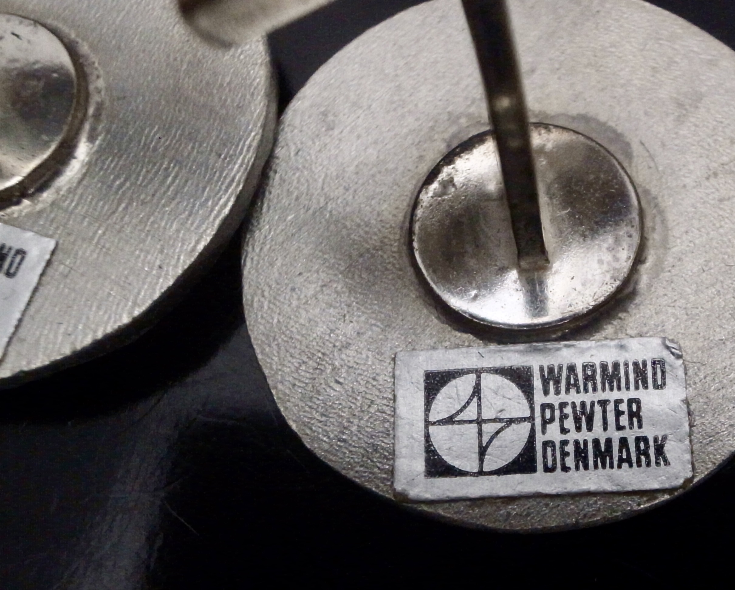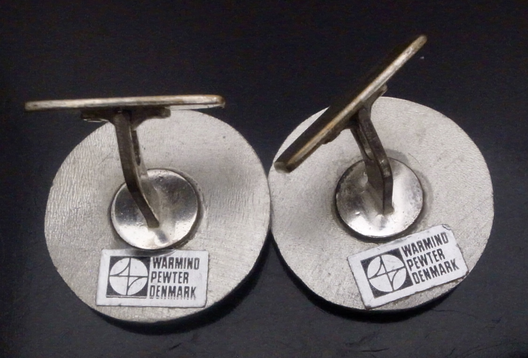 Poul Warmind, a pair of pewter ‘Man Walking on the Moon’ cufflinks, Denmark, circa 1969, with adhesive label reading ‘Warmind-Pewter-Denmark‘ and trade mark, the circular panels, approximately 2.6 cm diameter, cast with three craters and two moon boot impressions on the surface, probably produced to commemorate the first manned landing on the moon in July 1969 (Ref S+2392)