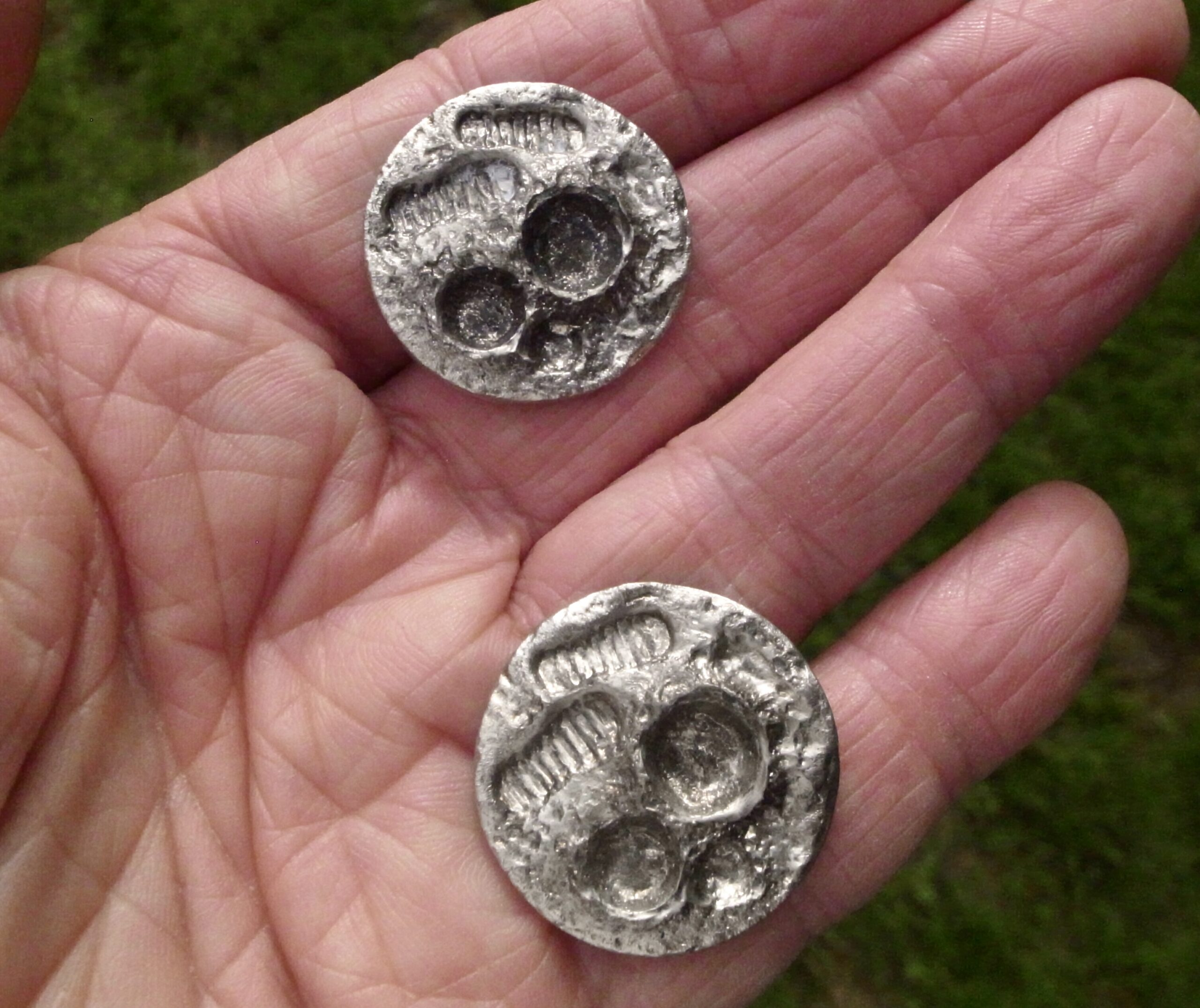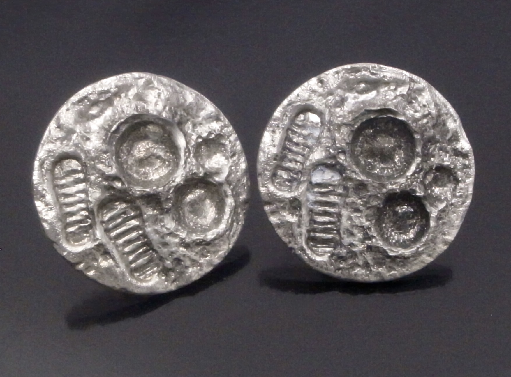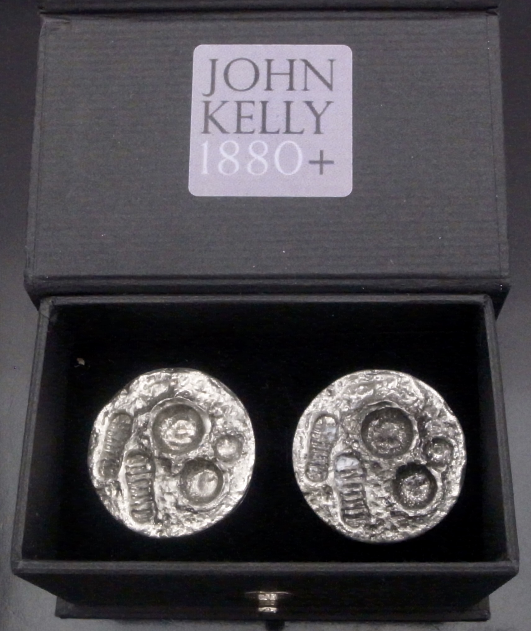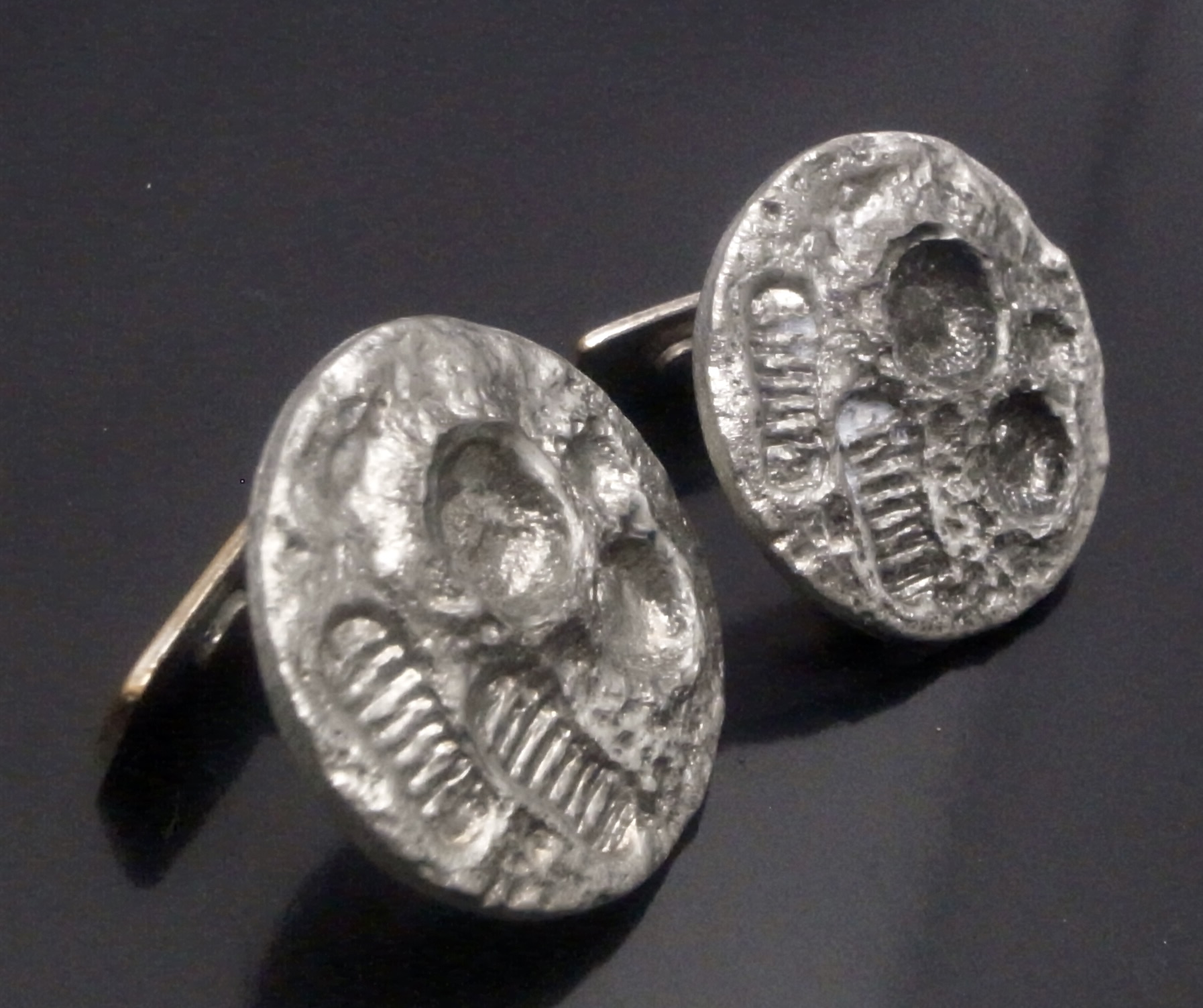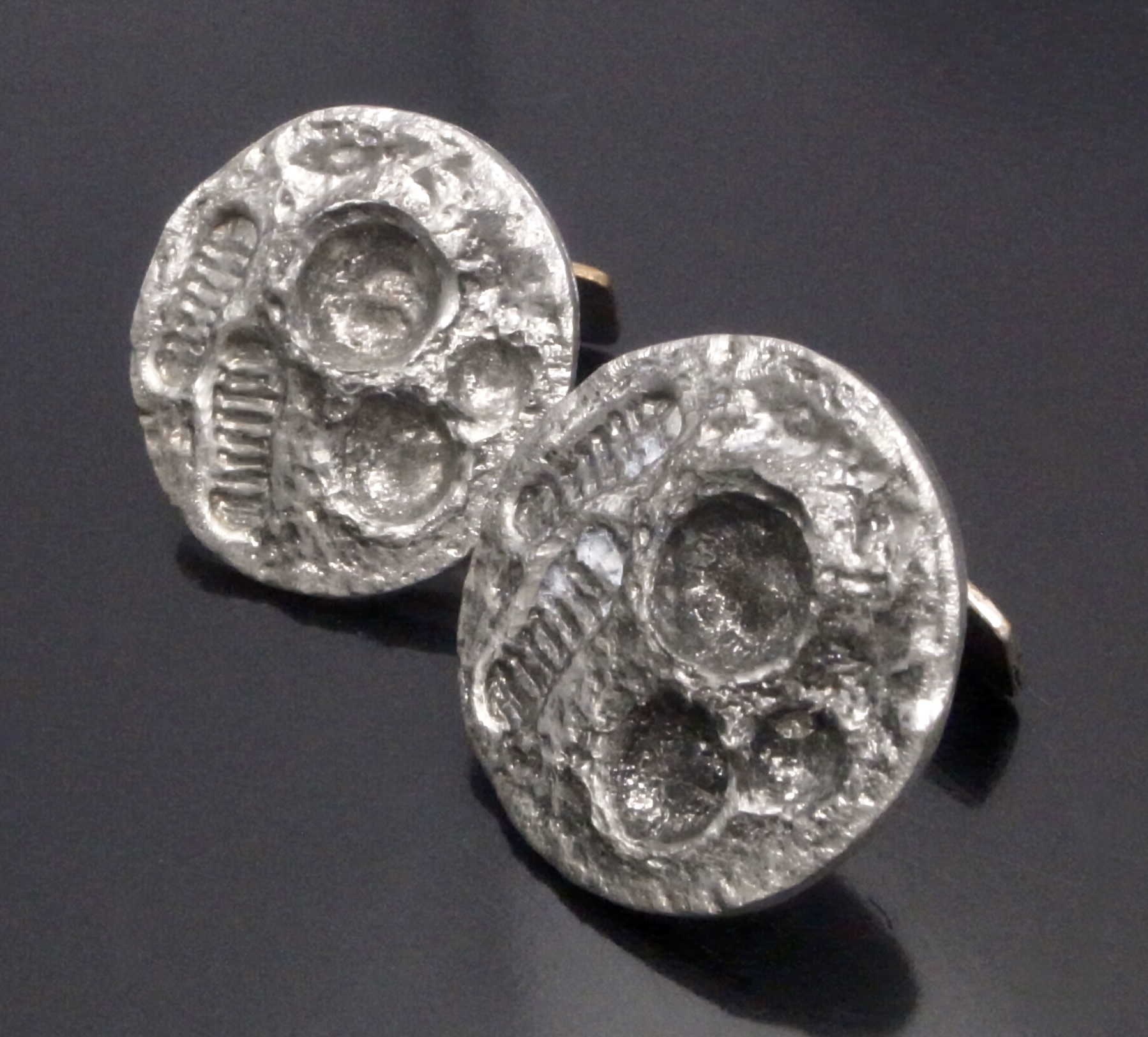 Poul Warmind, a pair of pewter ‘Man Walking on the Moon’ cufflinks, Denmark, circa 1969, with adhesive label reading ‘Warmind-Pewter-Denmark‘ and trade mark, the circular panels, approximately 2.6 cm diameter, cast with three craters and two moon boot impressions on the surface, probably produced to commemorate the first manned landing on the moon in July 1969 (Ref S+2392)