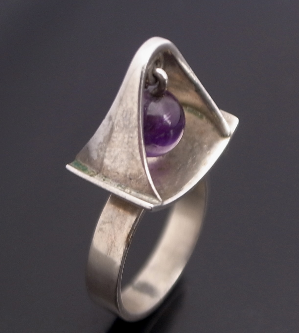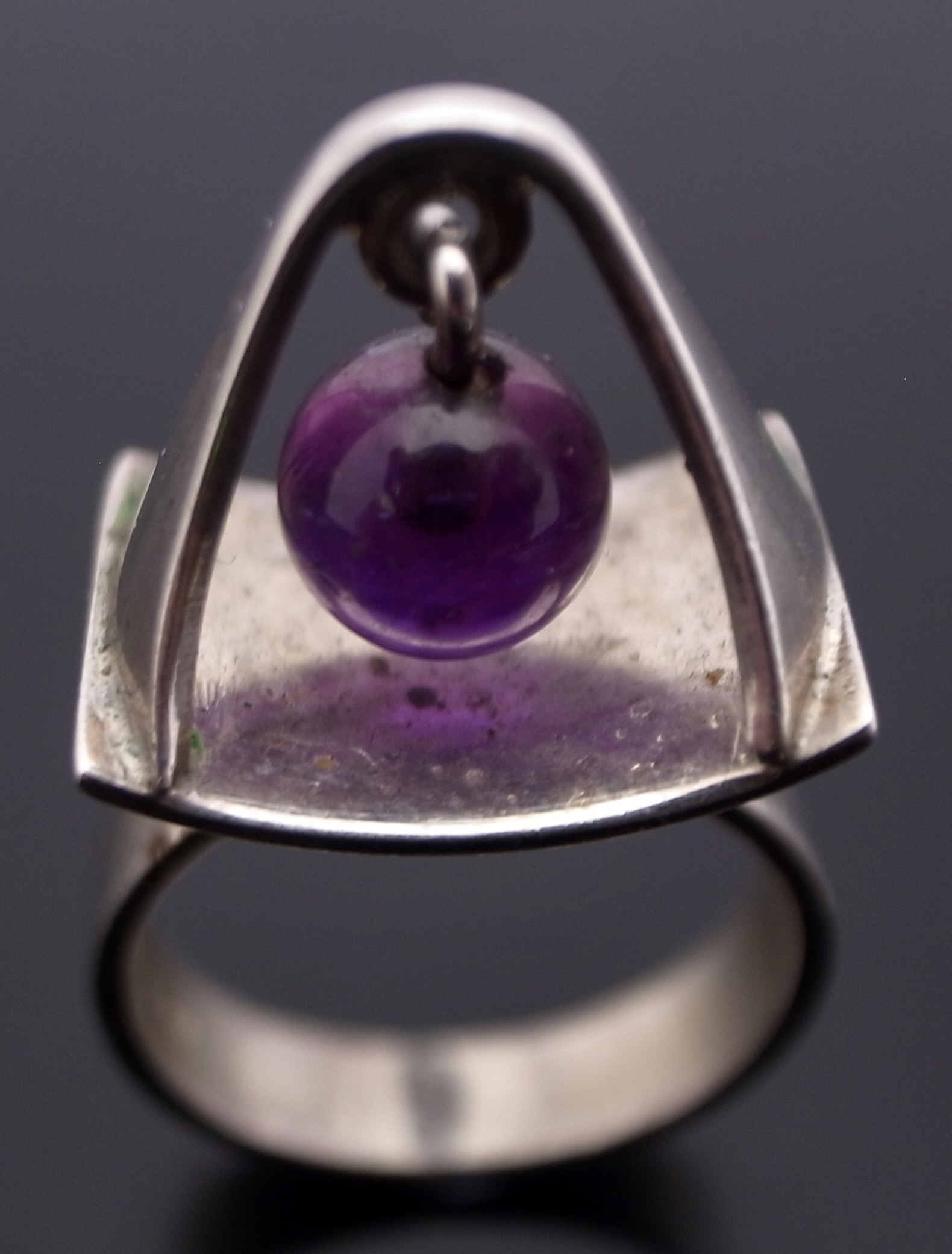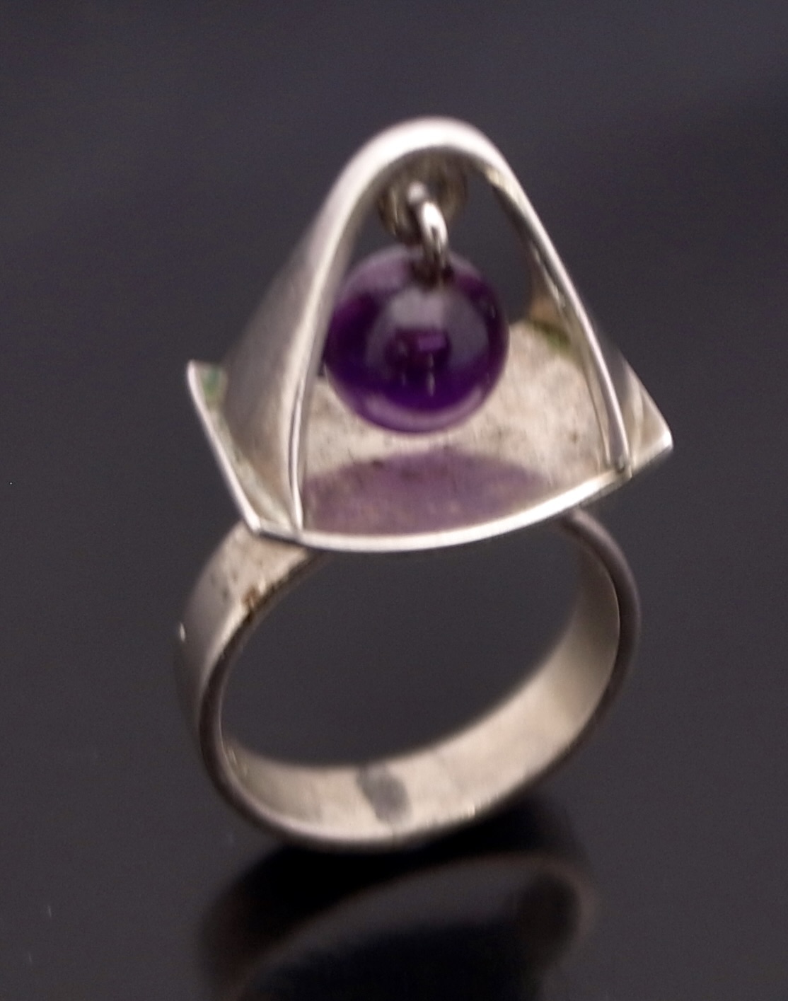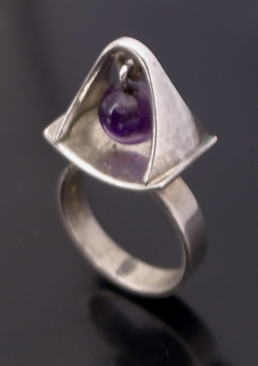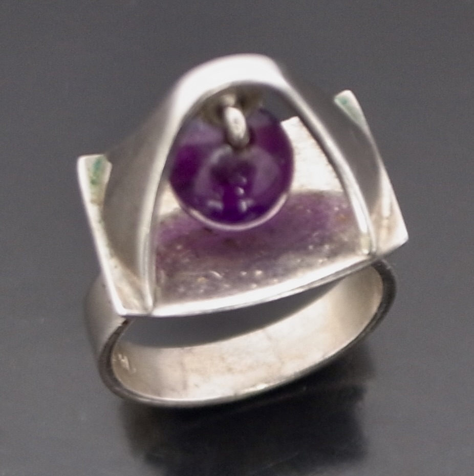 Poul Warmind, an amethyst mounted kinetic silver ring, Denmark, circa 1968, stamped ‘P.W’ for Poul Warmind, ‘Denmark‘, ‘Sterling’, ‘763’, ‘925S’ and an indistinct mark, possibly that of the retailer, the 7 mm bead hangs suspended above the shank, finger size M (Ref S+2546)