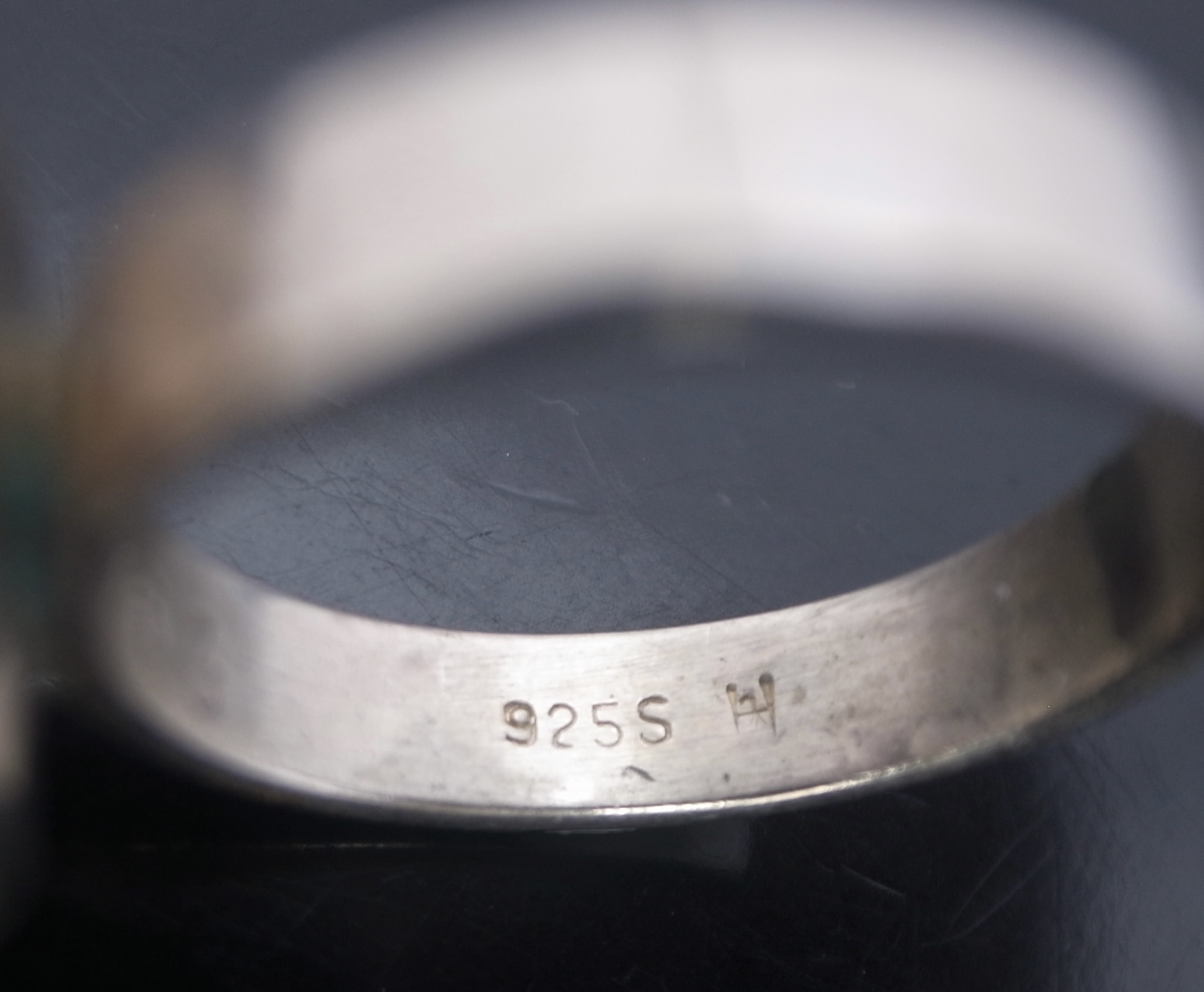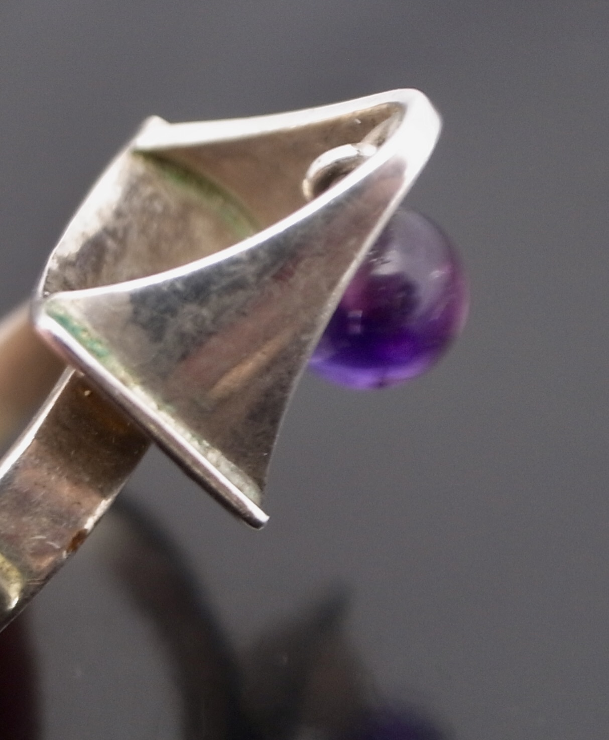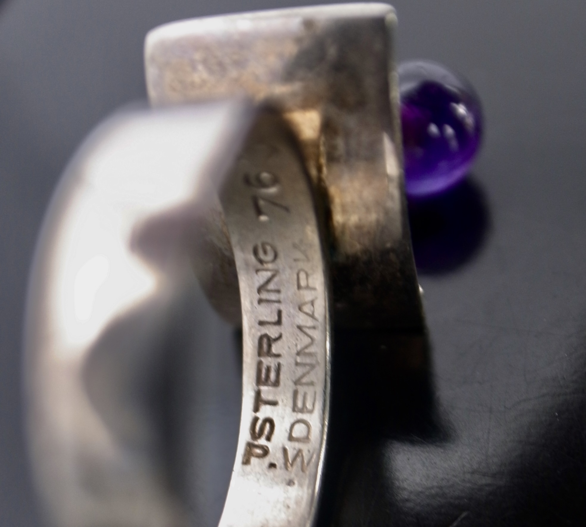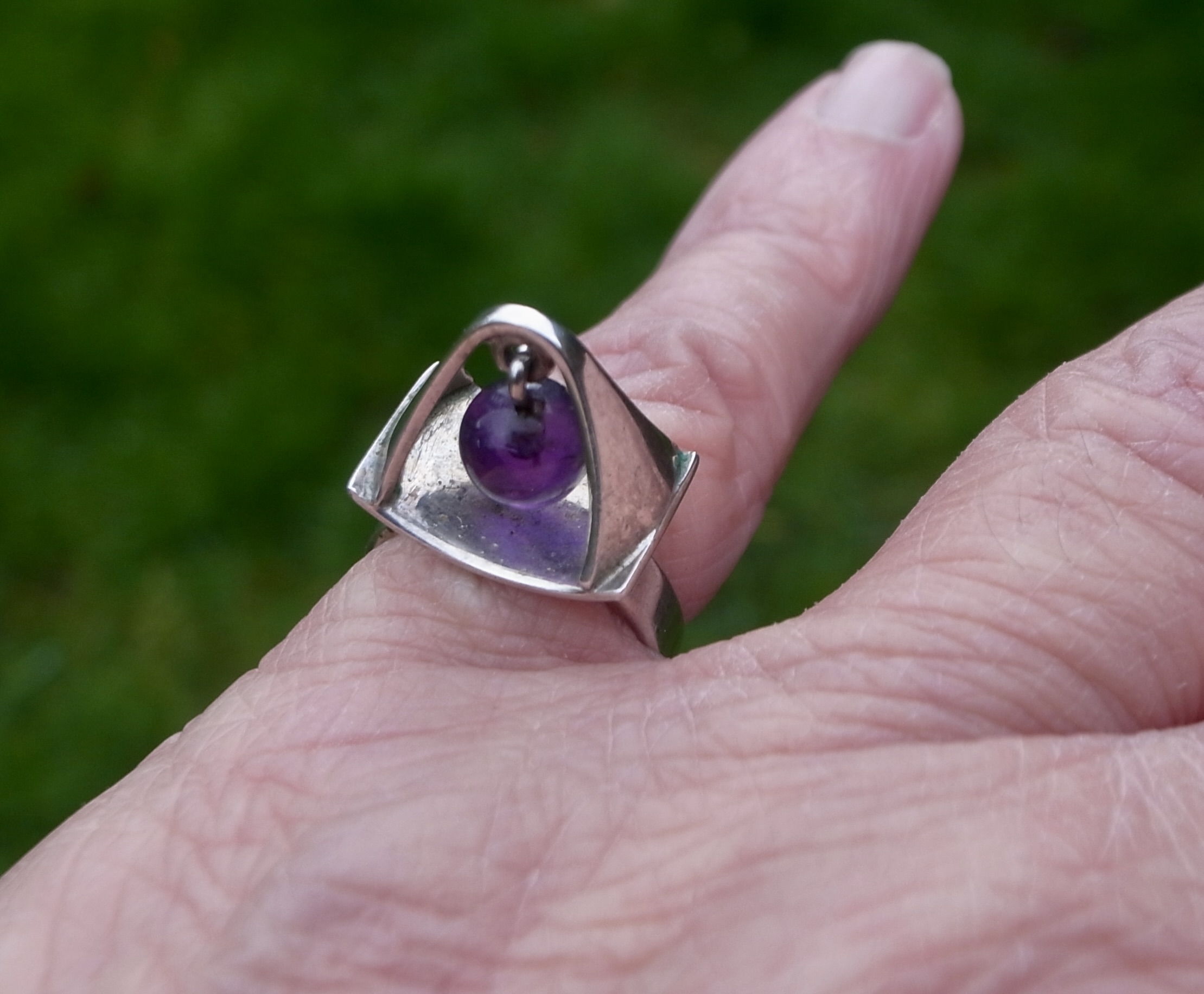 Poul Warmind, an amethyst mounted kinetic silver ring, Denmark, circa 1968, stamped ‘P.W’ for Poul Warmind, ‘Denmark‘, ‘Sterling’, ‘763’, ‘925S’ and an indistinct mark, possibly that of the retailer, the 7 mm bead hangs suspended above the shank, finger size M (Ref S+2546)