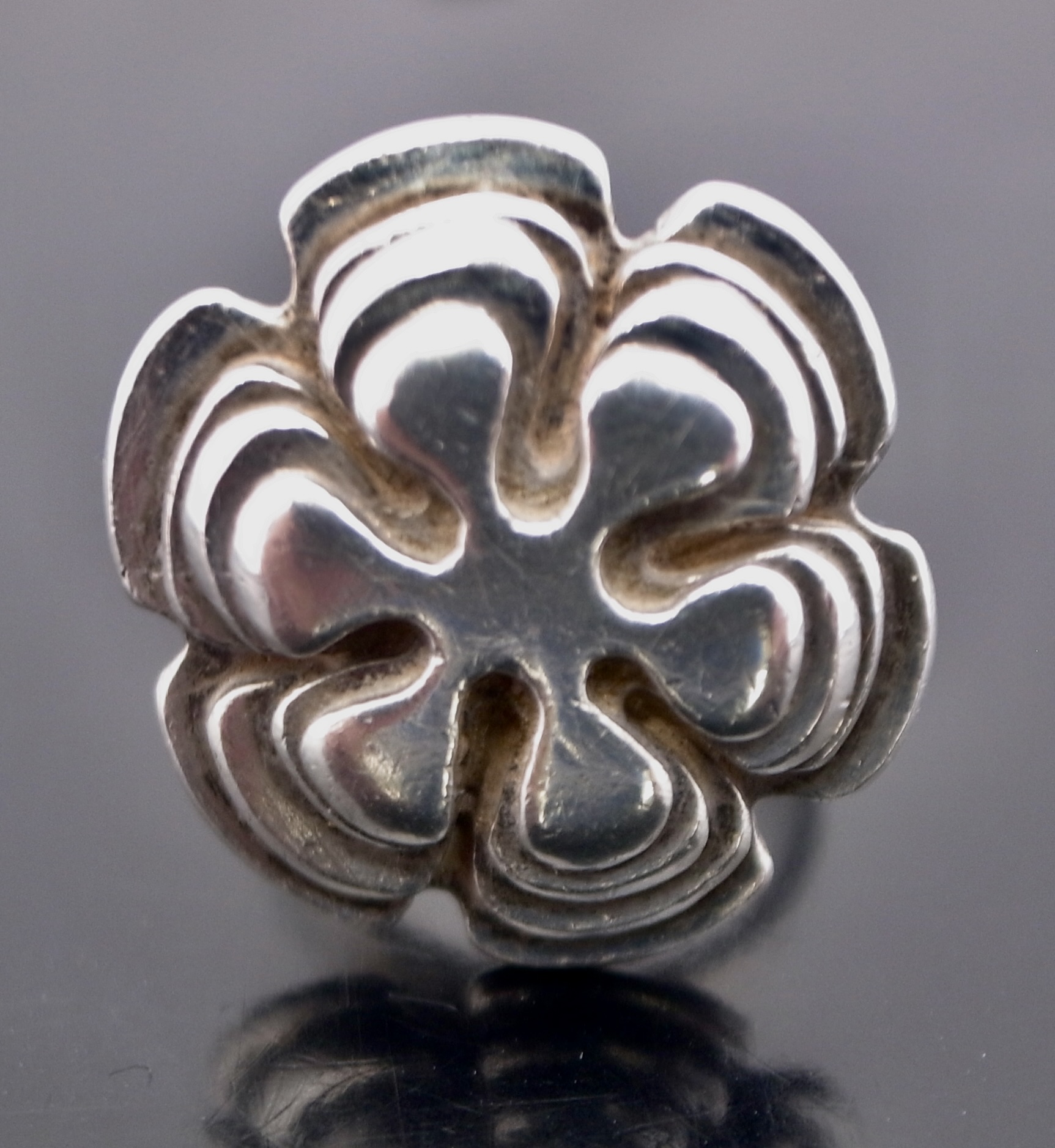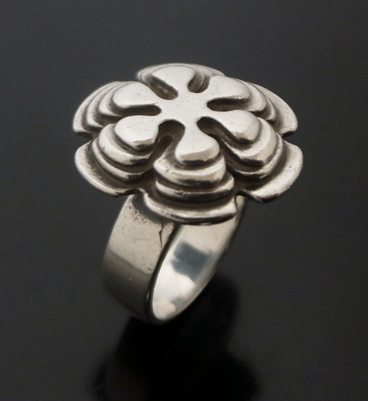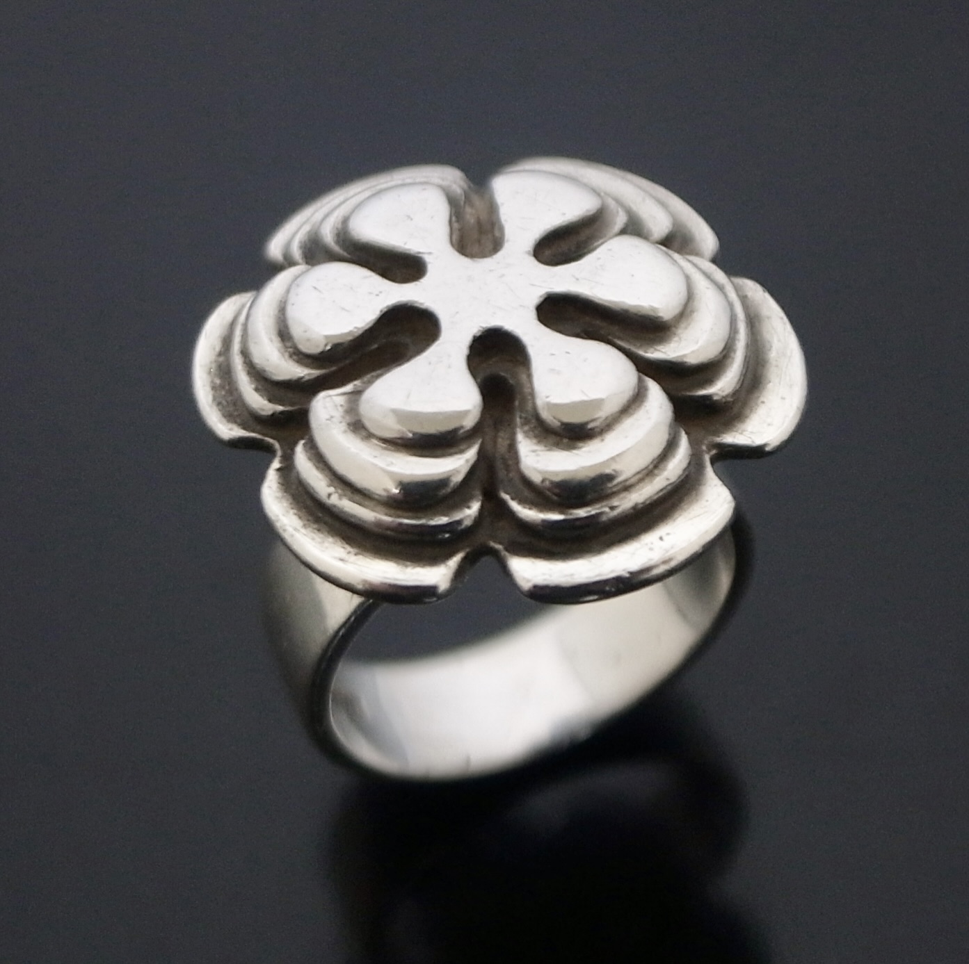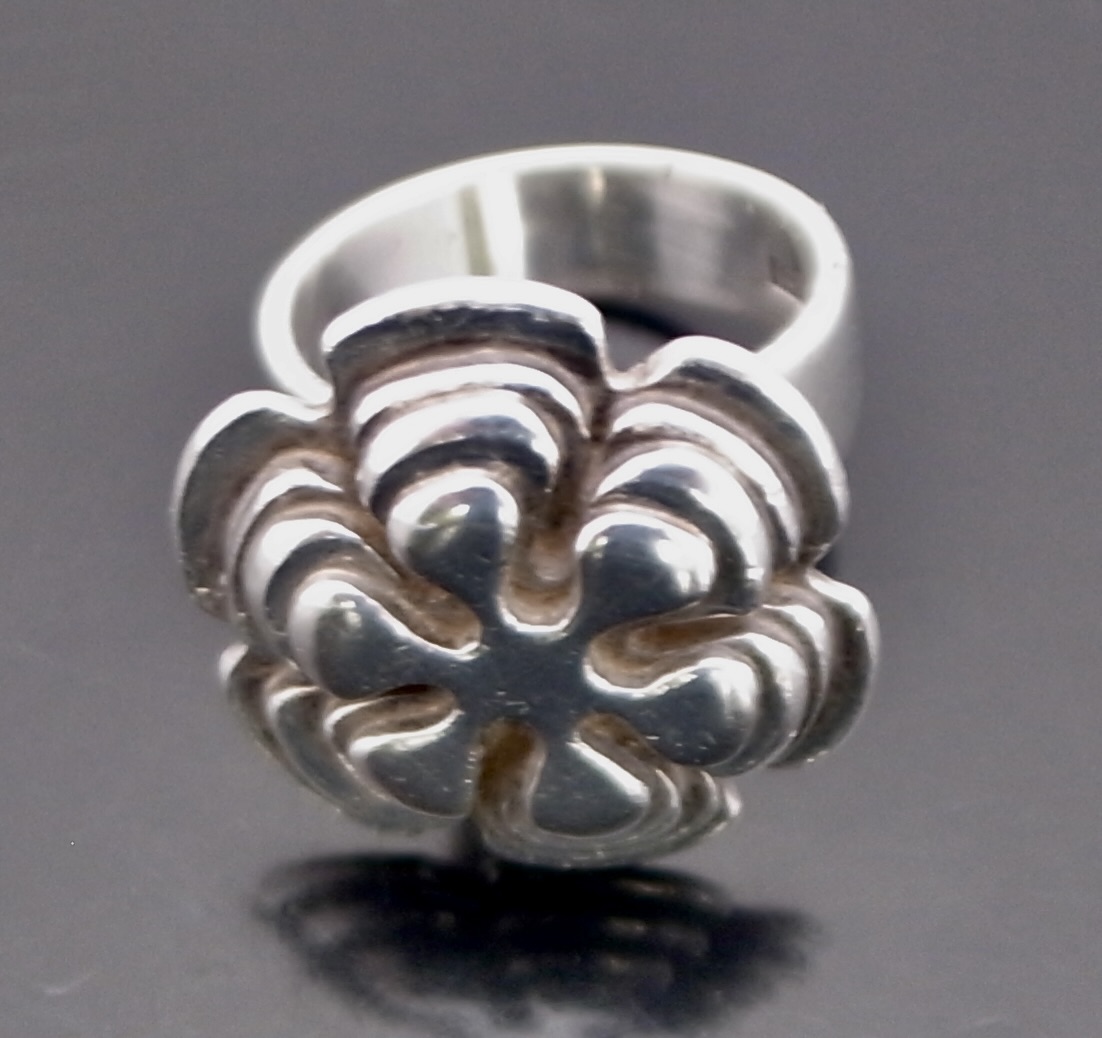 Wally Morgan (Designs) Ltd, a silver ring, London 1972, stamped ‘W.M.(D)‘ for Wally Morgan (Designs) Ltd, designed as a hexafoil flowerhead, approximately 2.1 cm diameter, finger size L (S+2441)