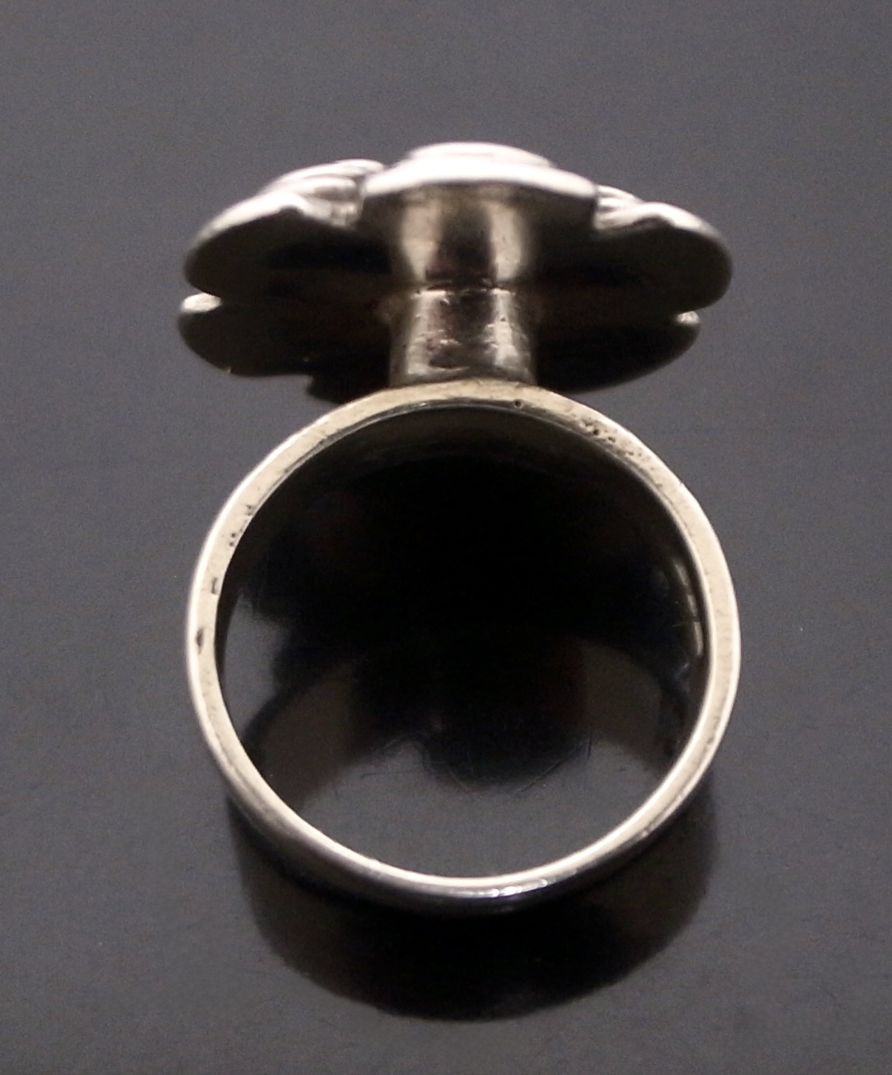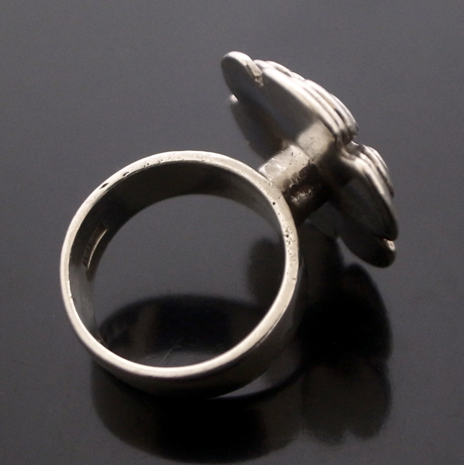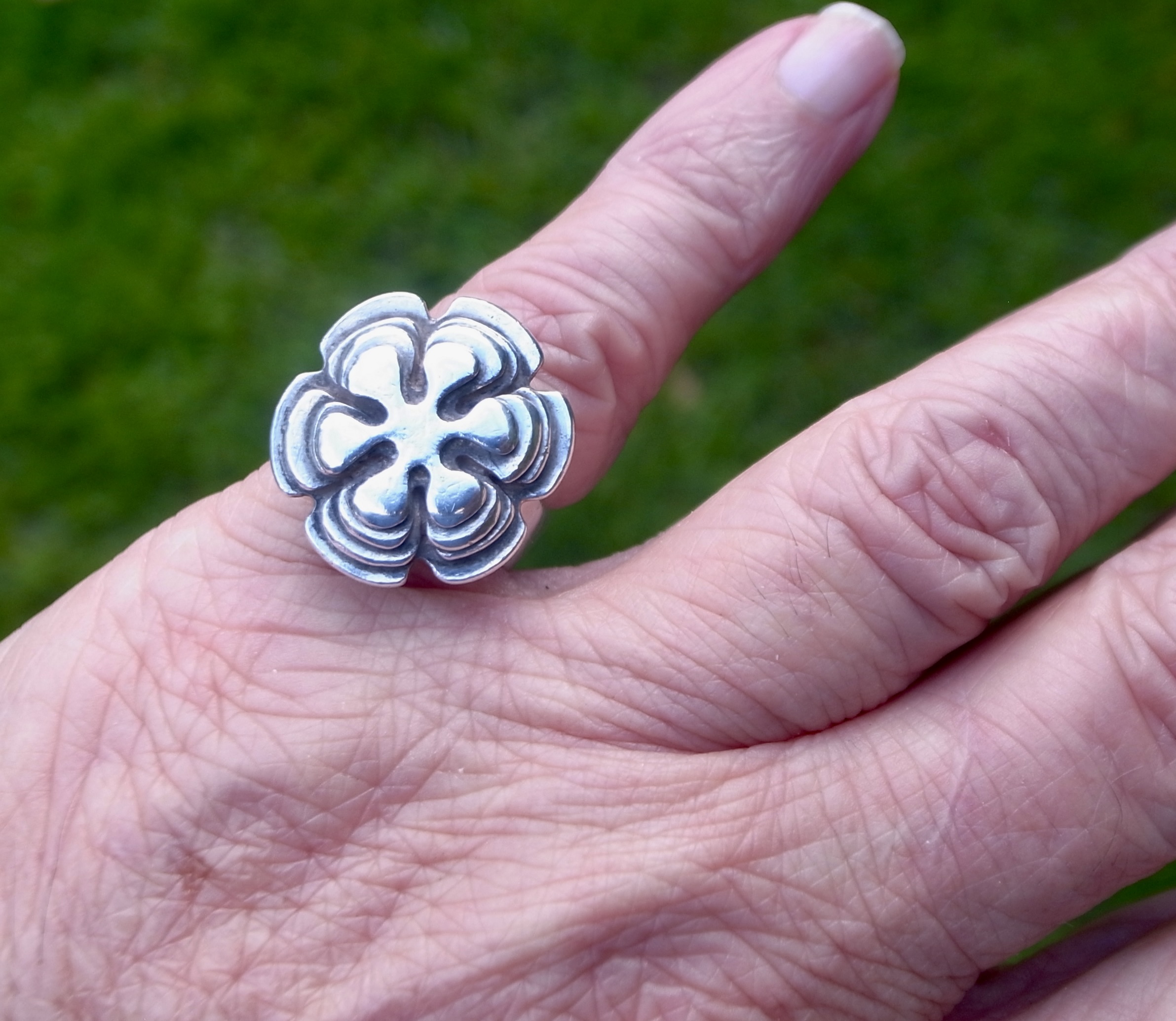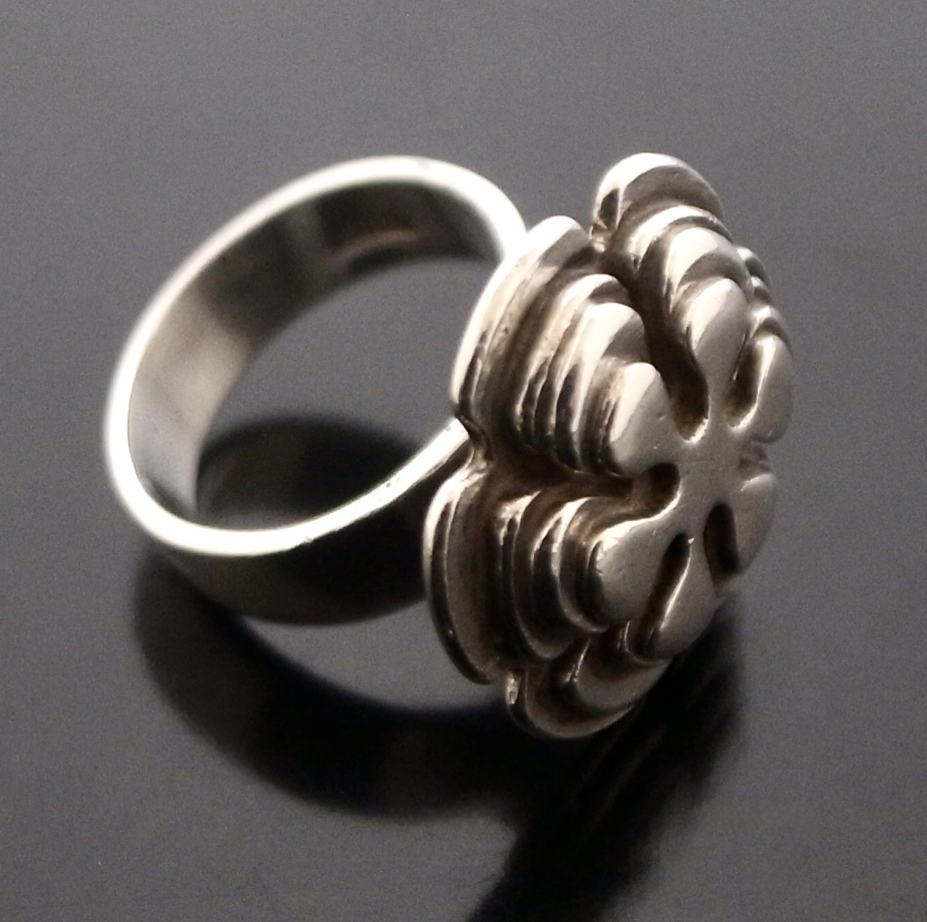 Wally Morgan (Designs) Ltd, a silver ring, London 1972, stamped ‘W.M.(D)‘ for Wally Morgan (Designs) Ltd, designed as a hexafoil flowerhead, approximately 2.1 cm diameter, finger size L (S+2441)